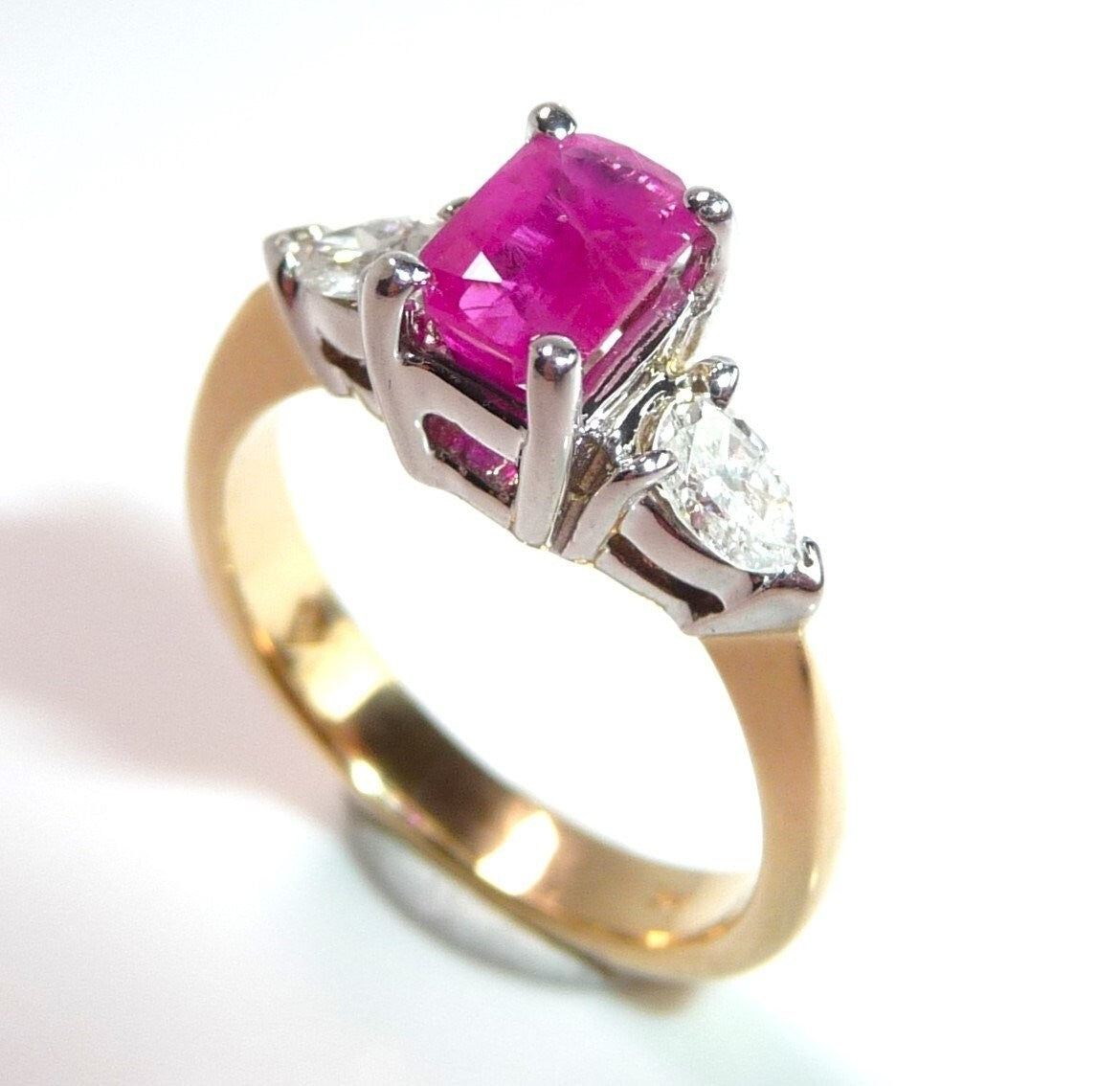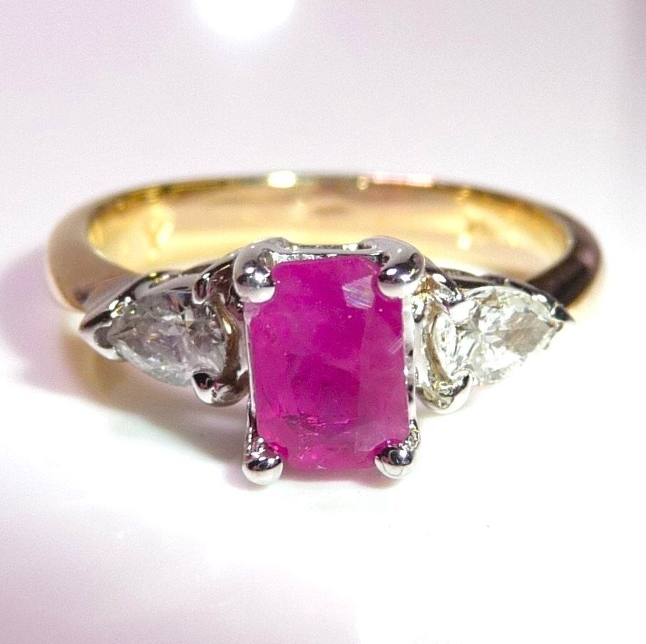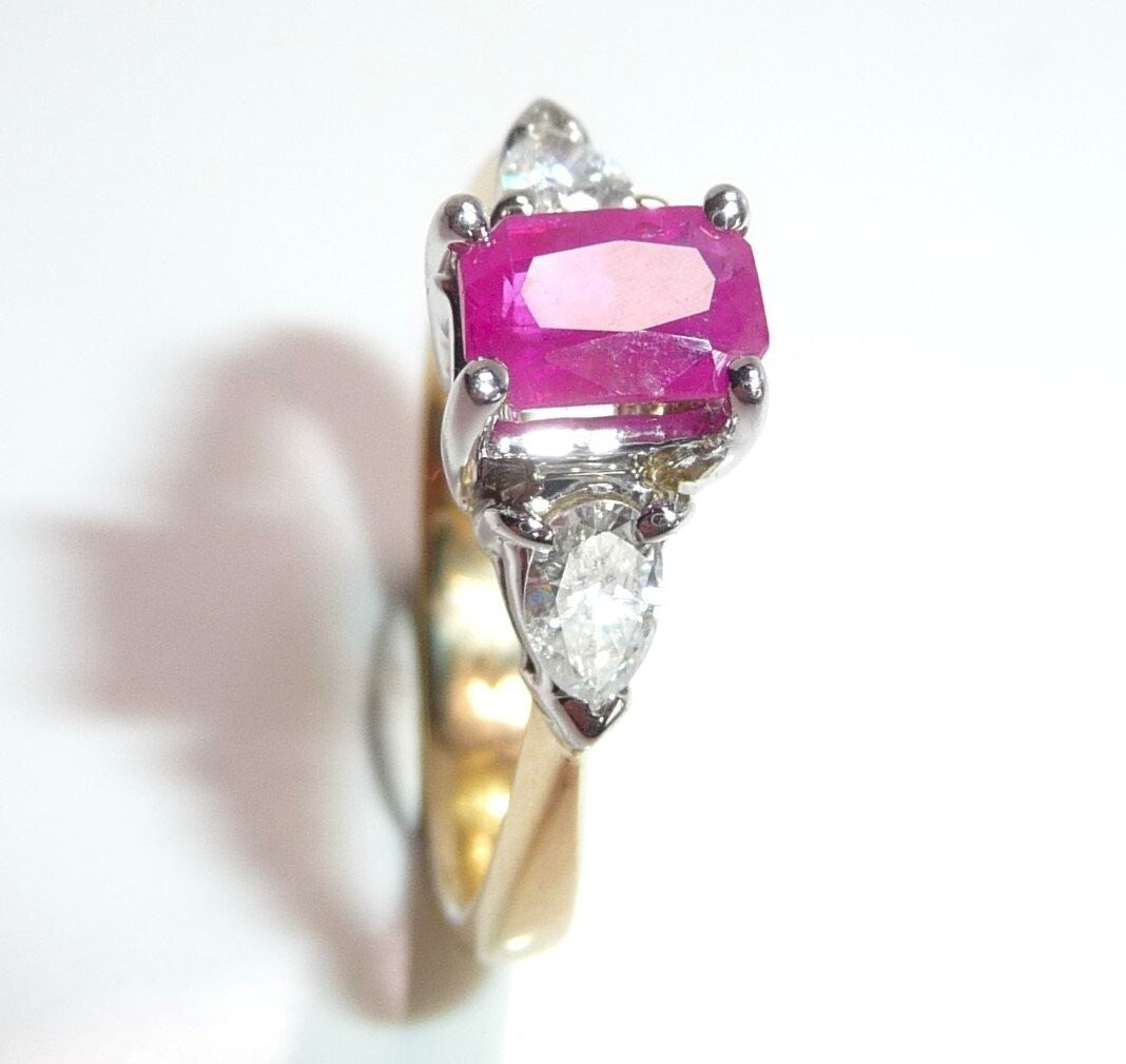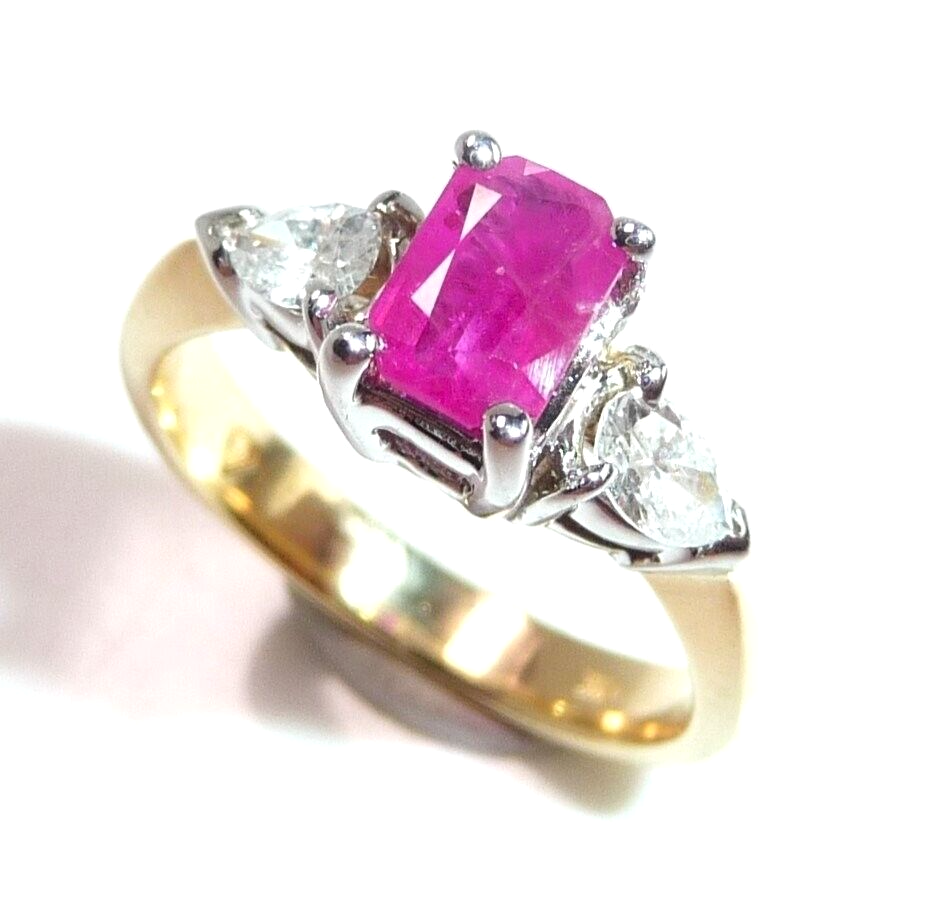 Ring in 585 / 14 K Gelbgold mit Akzenten in Weißgold im Ringkopf. Das Design ist quer zum Finger arrangiert. Eingefasst ist ein Rubin im Smaragdschliff von 0.75 ct. mit den Maßen 6 x 4 mm und einer Tiefe von 3,2 mm. Die Ringschultern sind verziert mit je einem Diamanten im Tropfenschliff oder auch Birnkern-Schliff (Pear Cut). Jeder dieser Diamanten hat 0.15 ct. (G-H/SI).