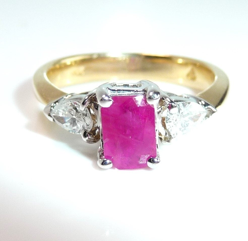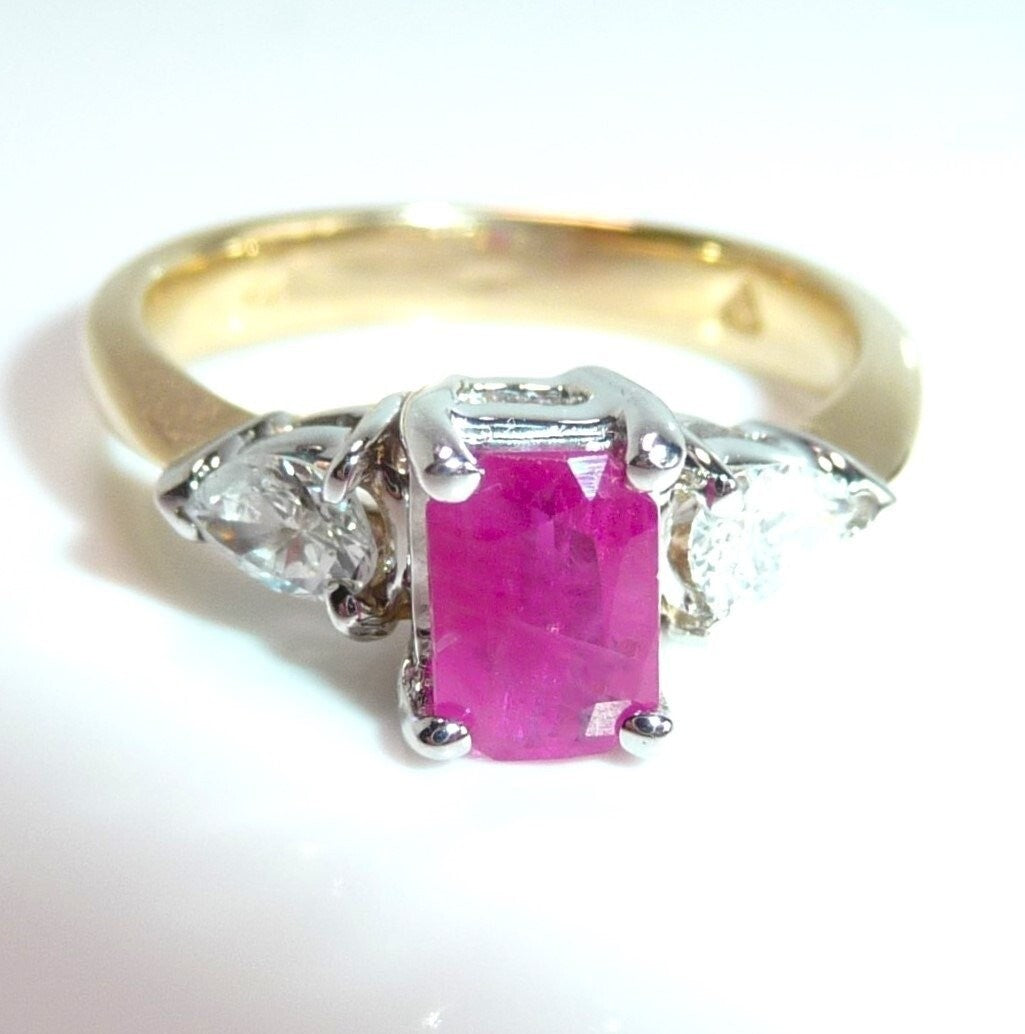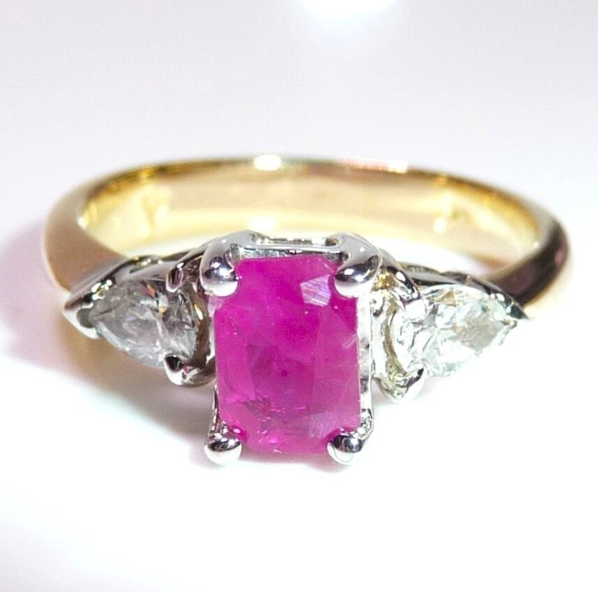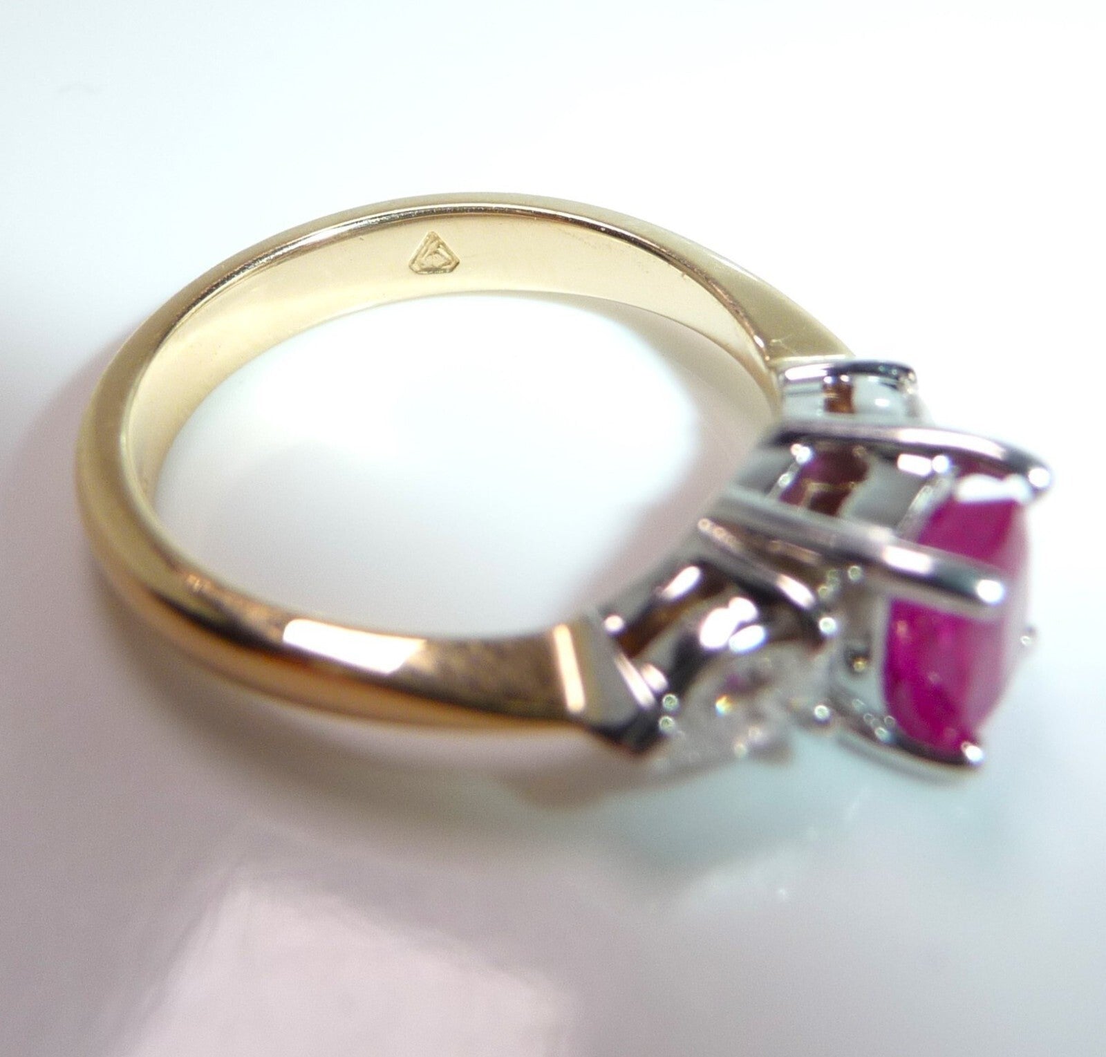 Ring in 585 / 14 K Gelbgold mit Akzenten in Weißgold im Ringkopf. Das Design ist quer zum Finger arrangiert. Eingefasst ist ein Rubin im Smaragdschliff von 0.75 ct. mit den Maßen 6 x 4 mm und einer Tiefe von 3,2 mm. Die Ringschultern sind verziert mit je einem Diamanten im Tropfenschliff oder auch Birnkern-Schliff (Pear Cut). Jeder dieser Diamanten hat 0.15 ct. (G-H/SI).