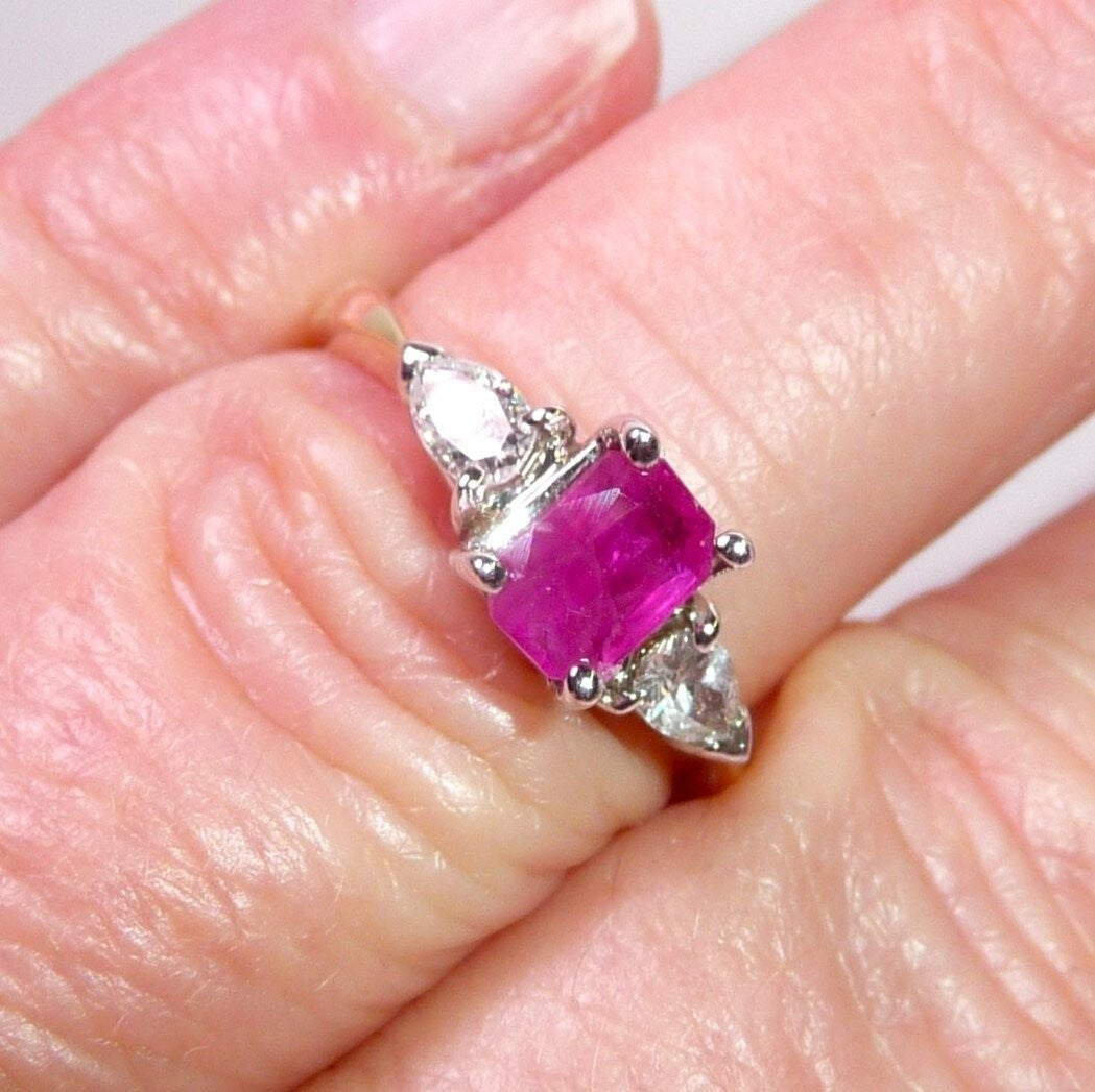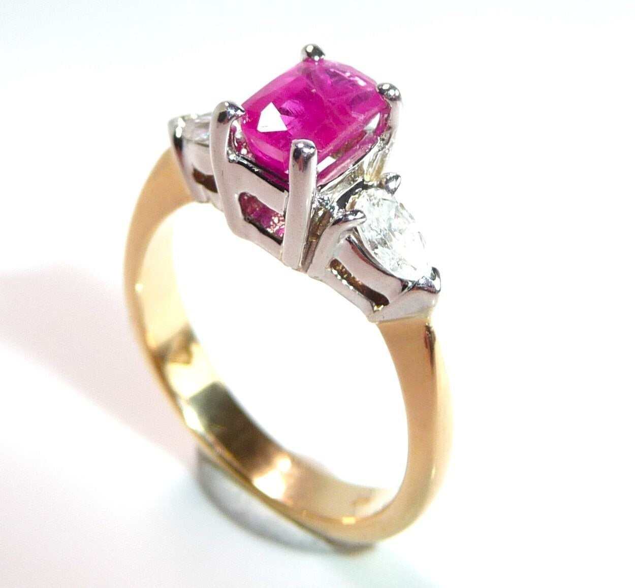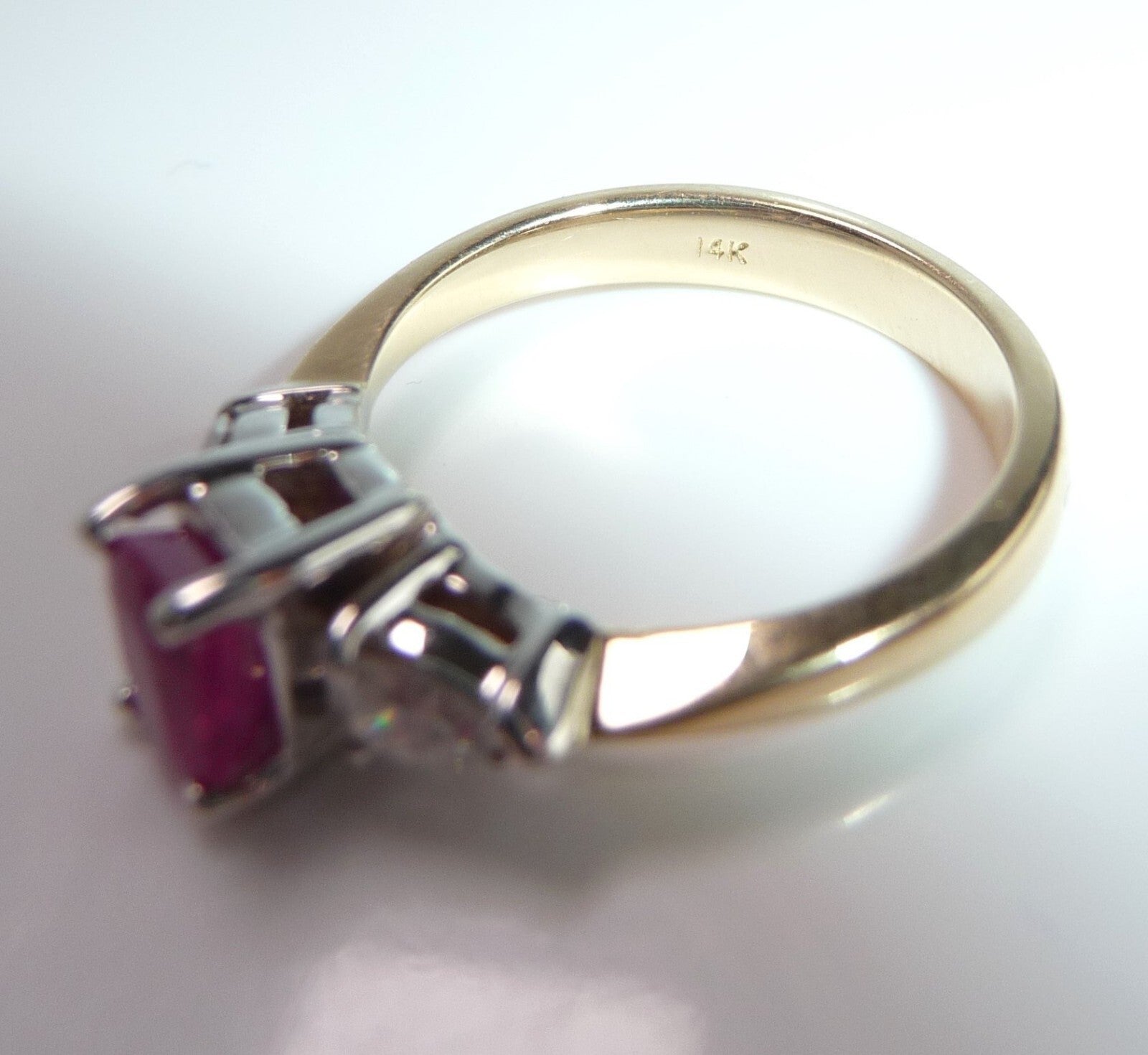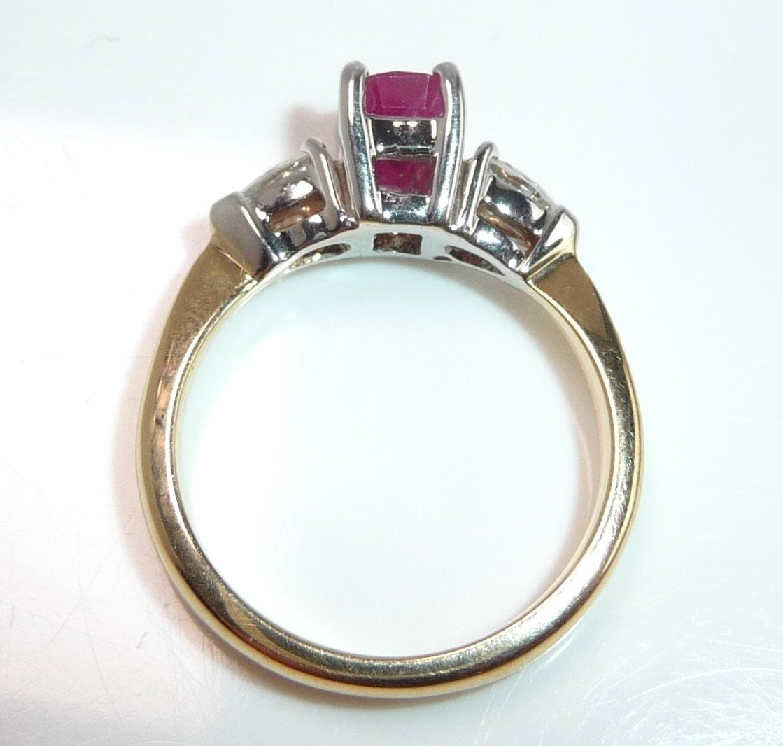 Ring in 585 / 14 K Gelbgold mit Akzenten in Weißgold im Ringkopf. Das Design ist quer zum Finger arrangiert. Eingefasst ist ein Rubin im Smaragdschliff von 0.75 ct. mit den Maßen 6 x 4 mm und einer Tiefe von 3,2 mm. Die Ringschultern sind verziert mit je einem Diamanten im Tropfenschliff oder auch Birnkern-Schliff (Pear Cut). Jeder dieser Diamanten hat 0.15 ct. (G-H/SI).