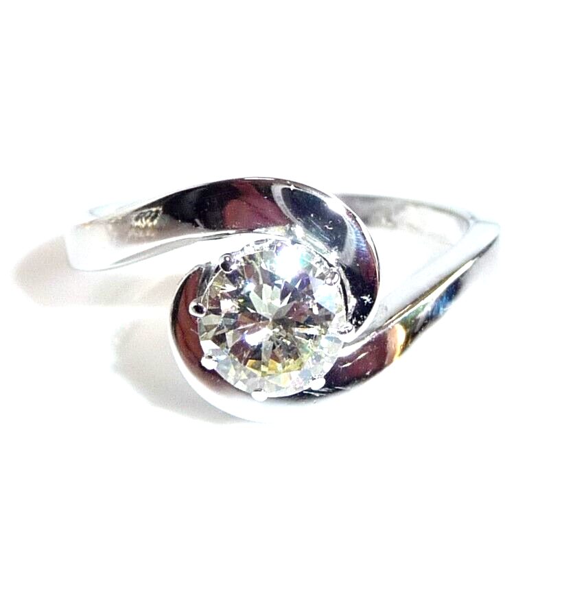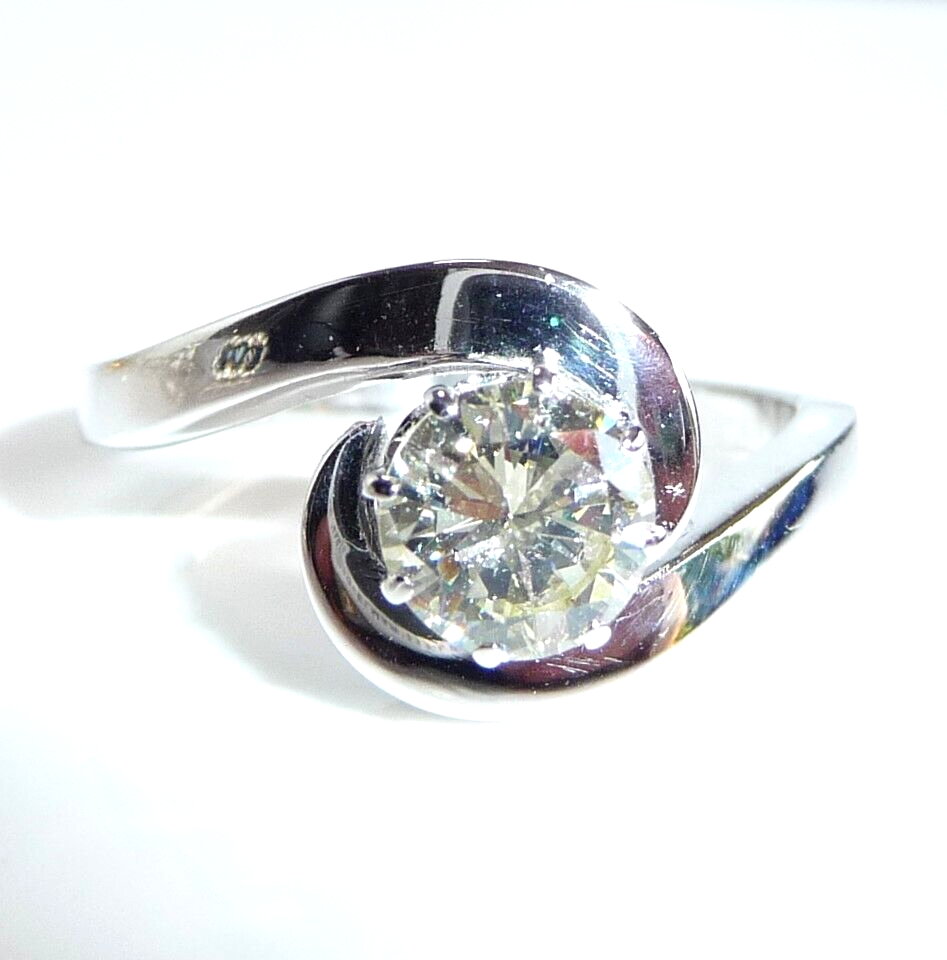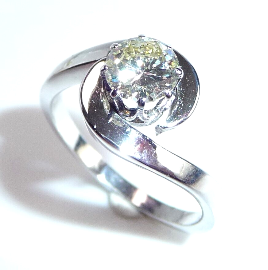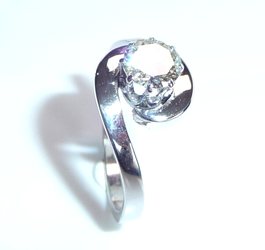 Ring in 14 kt. / 585 Weißgold. Der Ring ist eine Goldschmiede-Arbeit von Hand und ein Unikat. Das Gold verläuft im Ringkopf kreisförmig, wie ein Strudel und bietet Raum für eine hohe Krappen-Fassung. Die 8 starken Krappen halten einen Solitär Diamanten im Brillantschliff von ca. 0.82 ct. empor. Der Diamant mit den Maßen 6.1 mm Durchmesser und 3.5 mm Tiefe hat die Reinheit SI. Insgesamt ein sehr klarer Diamant von großer Brillanz. Farbe ist etwa bei I-H - ein leicht getöntes Weiß. In Natura und bei Bewegung hat der Brillant ein beeindruckendes Feuer.