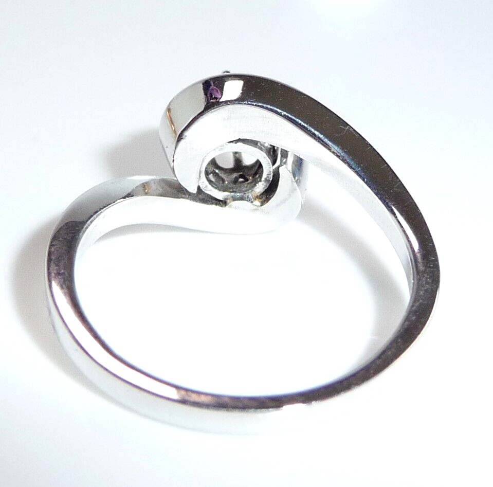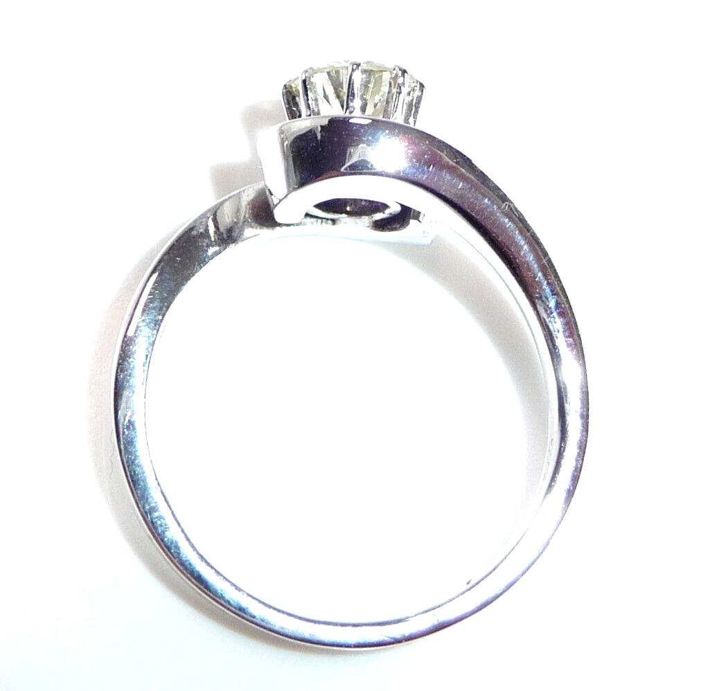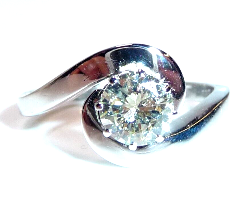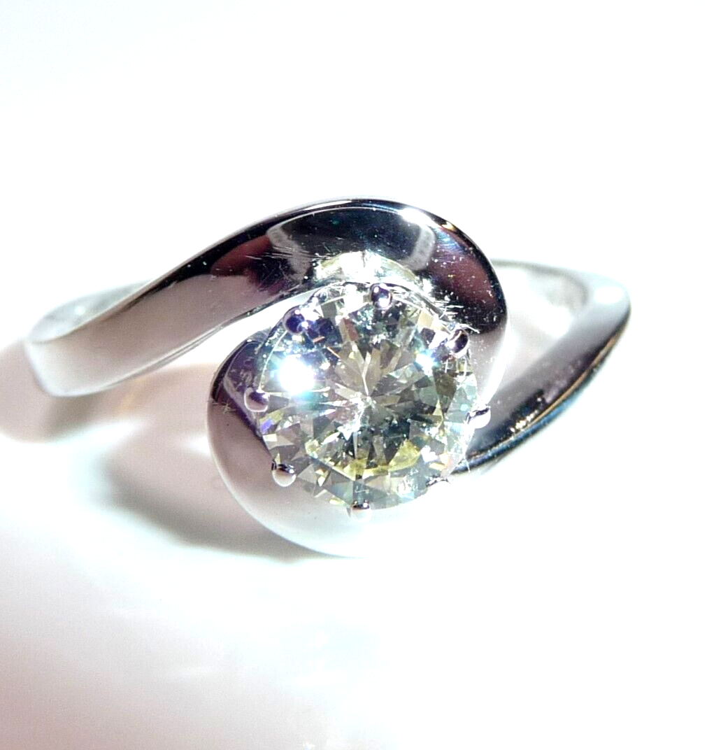 Ring in 14 kt. / 585 Weißgold. Der Ring ist eine Goldschmiede-Arbeit von Hand und ein Unikat. Das Gold verläuft im Ringkopf kreisförmig, wie ein Strudel und bietet Raum für eine hohe Krappen-Fassung. Die 8 starken Krappen halten einen Solitär Diamanten im Brillantschliff von ca. 0.82 ct. empor. Der Diamant mit den Maßen 6.1 mm Durchmesser und 3.5 mm Tiefe hat die Reinheit SI. Insgesamt ein sehr klarer Diamant von großer Brillanz. Farbe ist etwa bei I-H - ein leicht getöntes Weiß. In Natura und bei Bewegung hat der Brillant ein beeindruckendes Feuer.