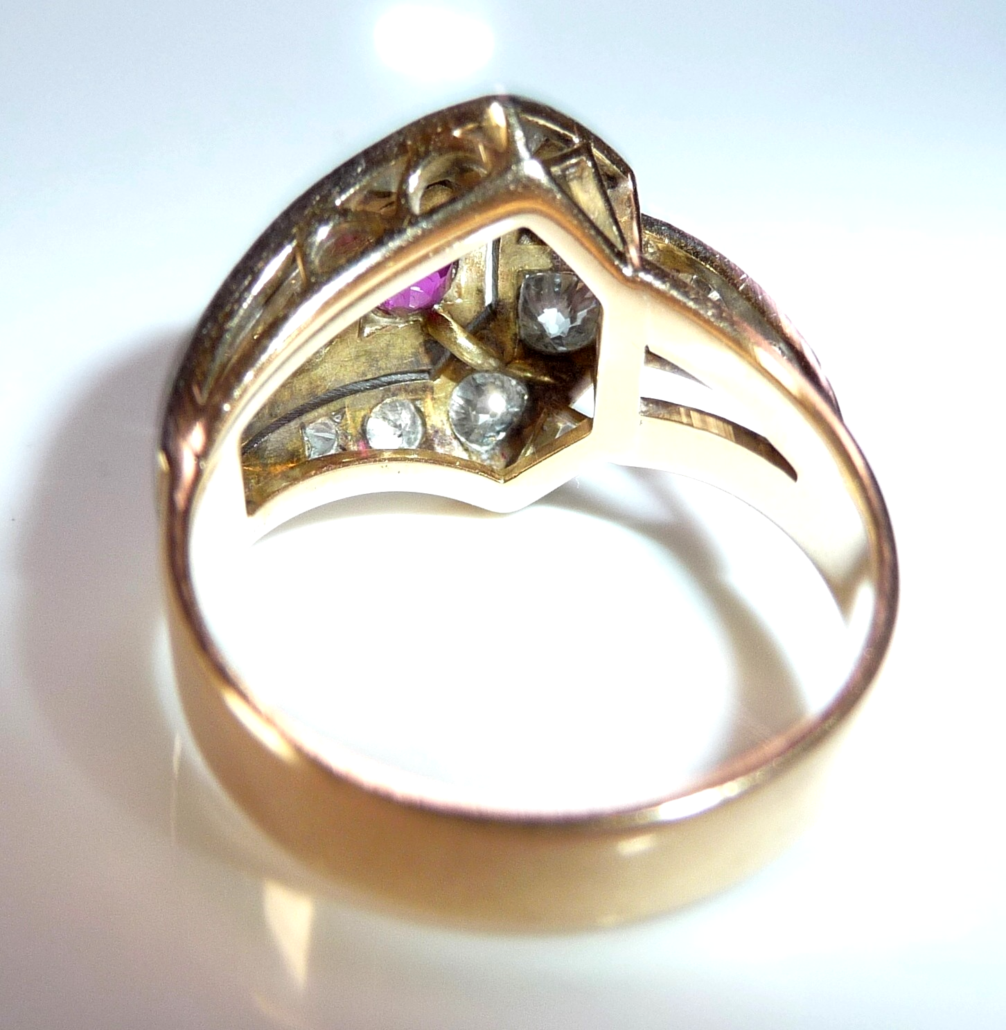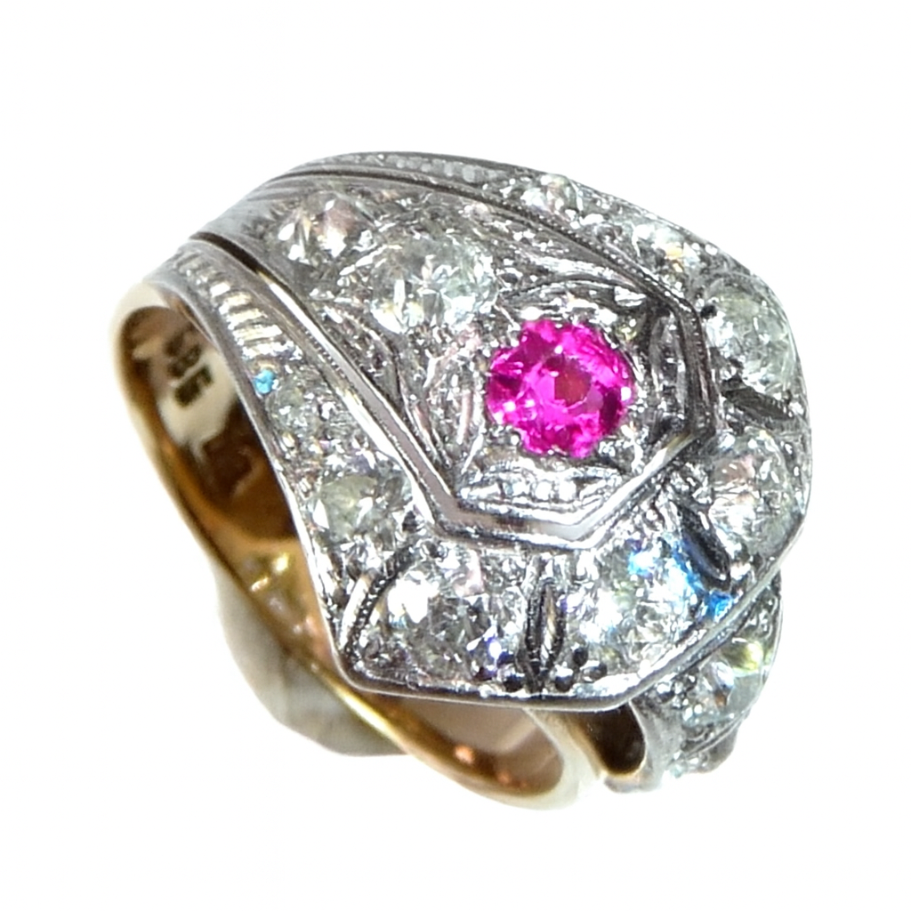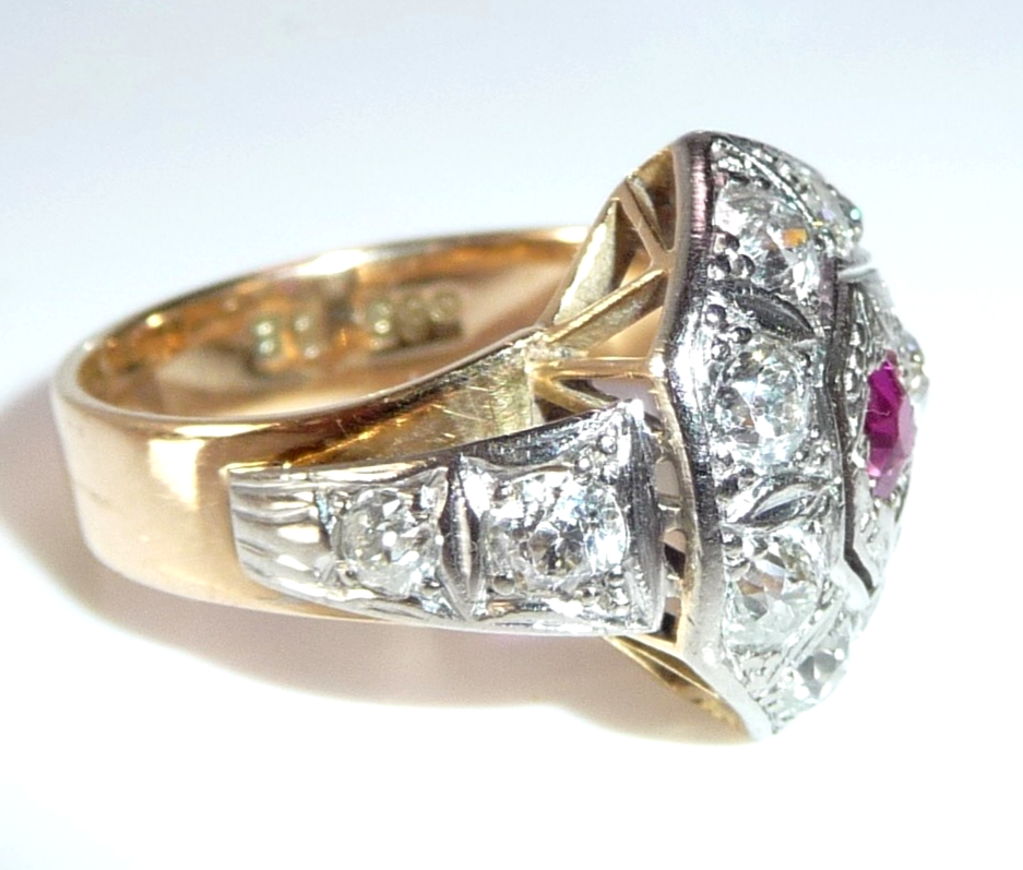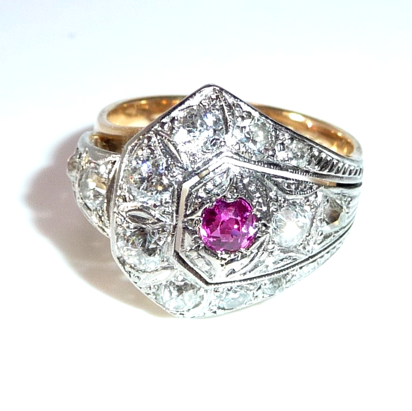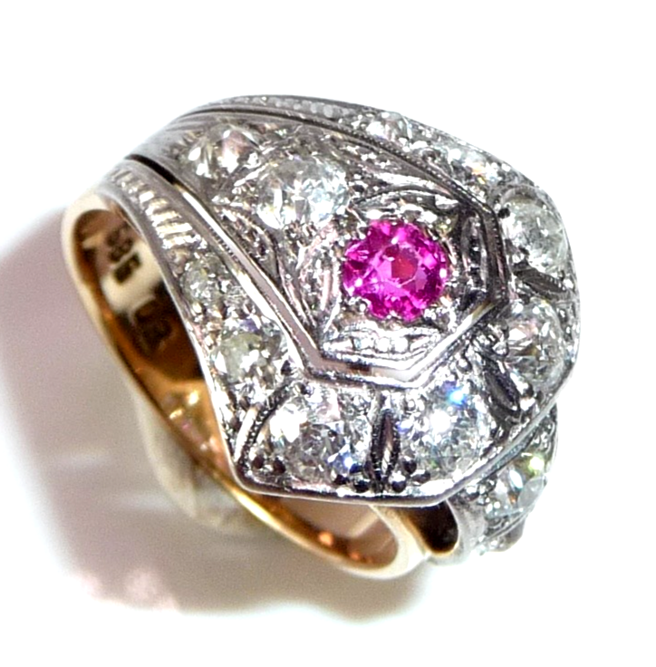 Antiker Ring in 14 K / 585 Gelbgold mit 12 K Weißgold. Der Ring entstammt der späten Art Deco-Periode um 1930-1940. Der Ring hat einen sehr großen und auffälligen Ringkopf, der sich aus der breiten Ringschiene entwickelt. Das schöne Design erinnert ein bisschen an eine Gürtelschnalle / Belt.