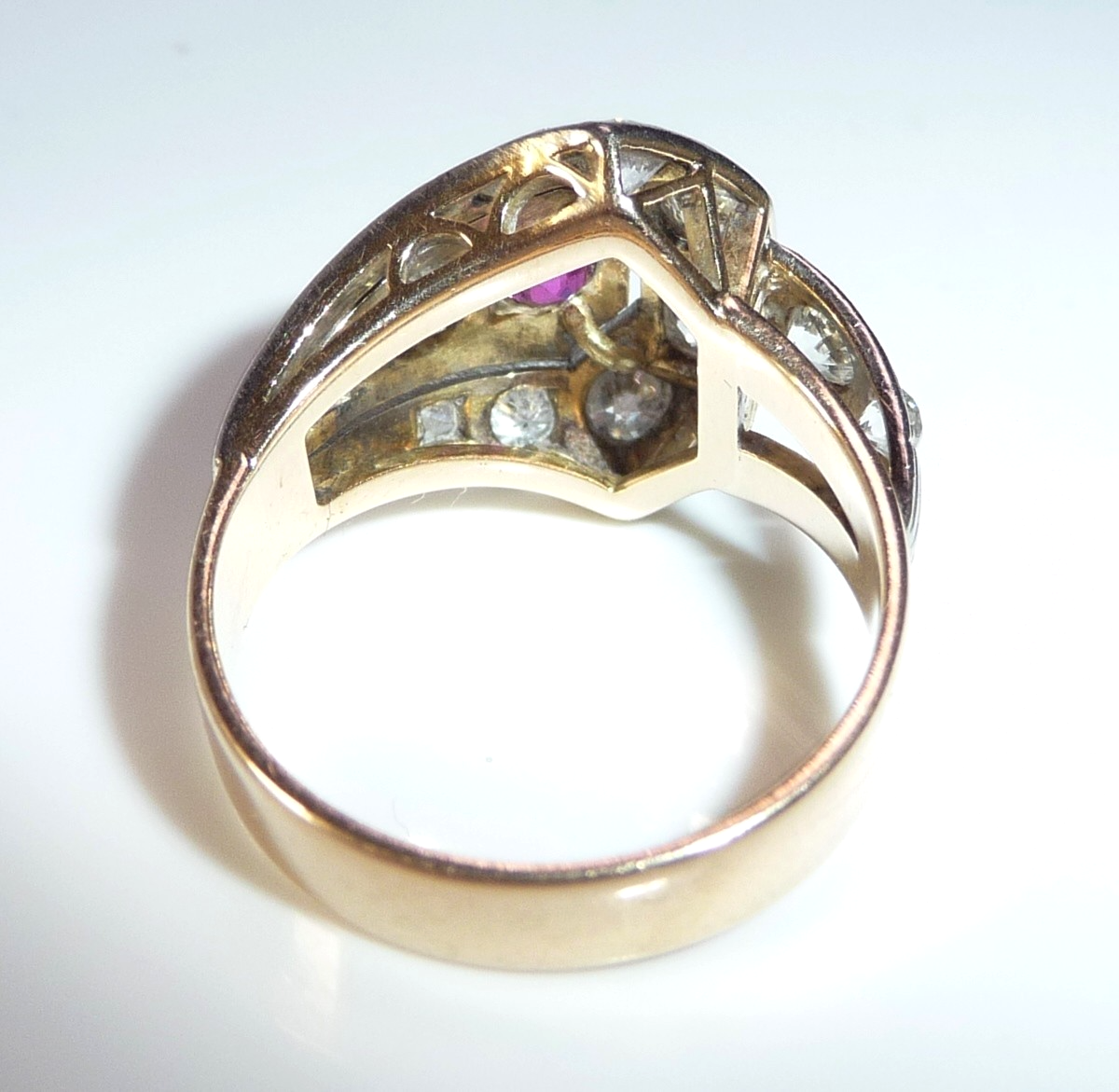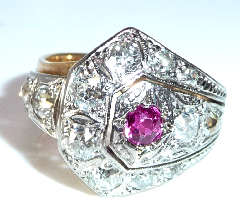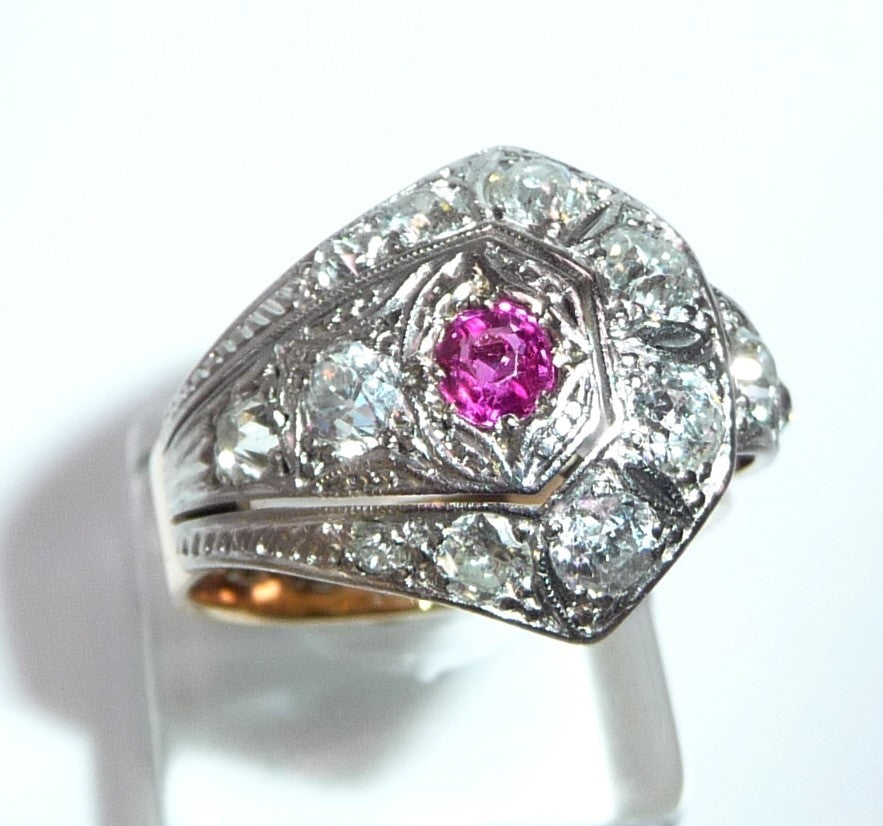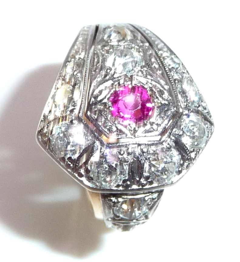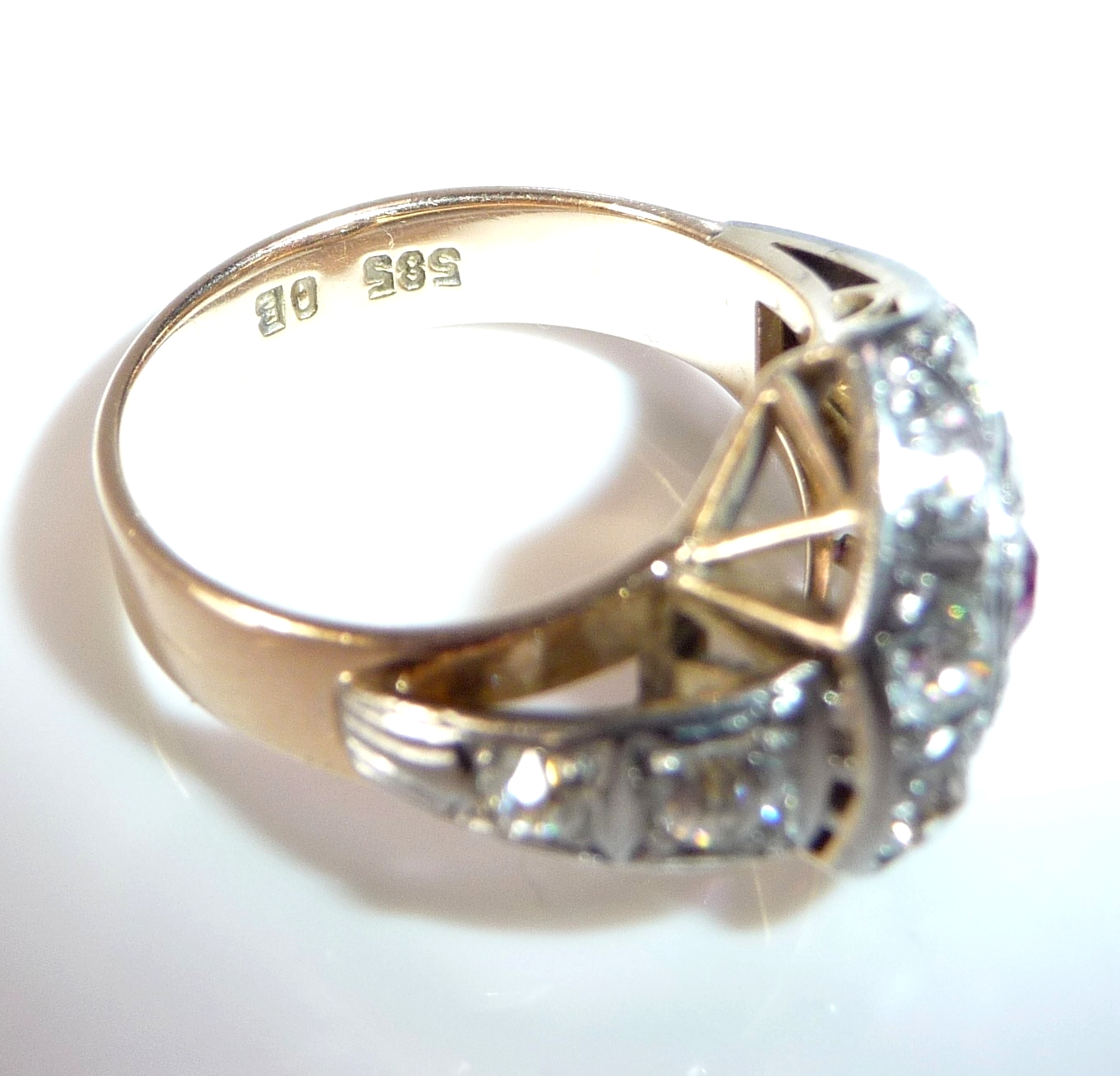 Antiker Ring in 14 K / 585 Gelbgold mit 12 K Weißgold. Der Ring entstammt der späten Art Deco-Periode um 1930-1940. Der Ring hat einen sehr großen und auffälligen Ringkopf, der sich aus der breiten Ringschiene entwickelt. Das schöne Design erinnert ein bisschen an eine Gürtelschnalle / Belt.