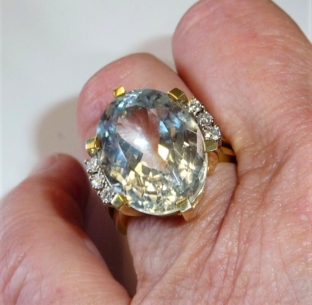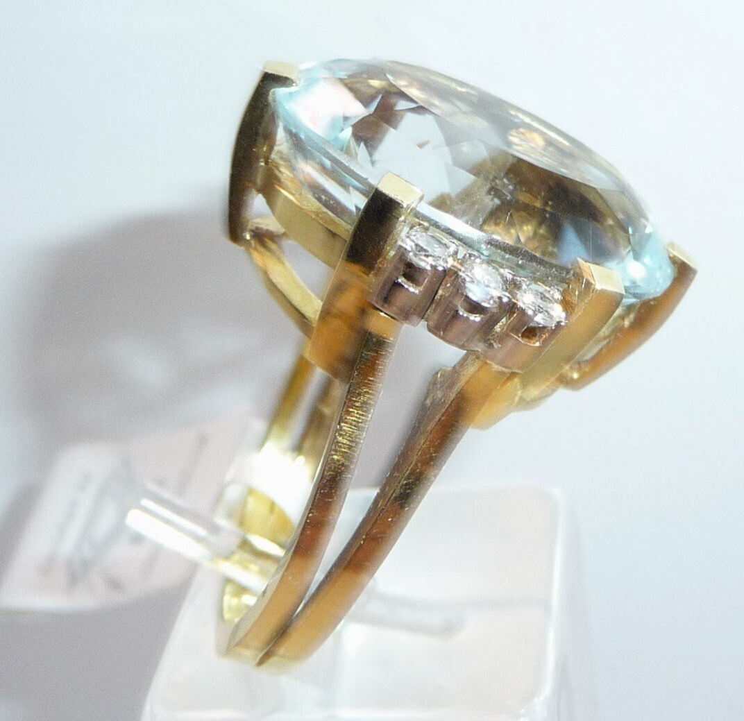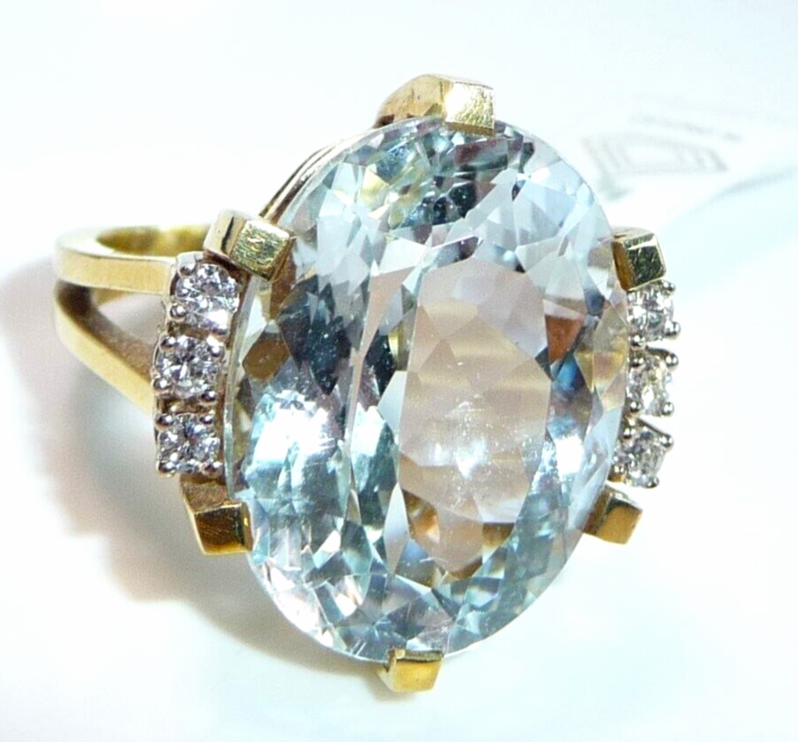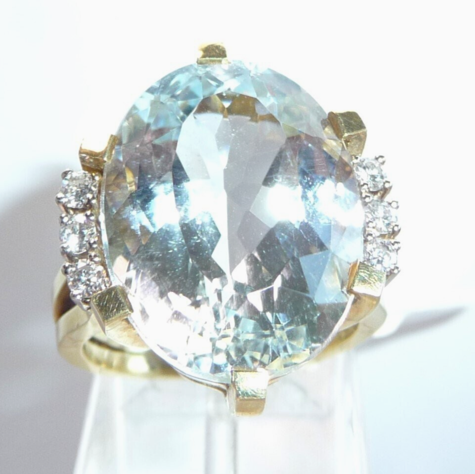 Eleganter Ring in 585 / 14 K Gelbgold. Der große Ringkopf hat einen ovalen hellblauen Topas von 20.00 ct. eingefasst. Der große Topas mit den Masßen 19x14x9,95mm hat eine wasser-blaue Farbe, die an einen Aquamarin erinnert. Der aufwendige Facettenschliff auch unter dem Topas lässt ihn bei jeder Bewegung funkeln. Seitlich sind jeweils 3 Diamanten im Brillantschliff von total 0.25ct. eingefasst.