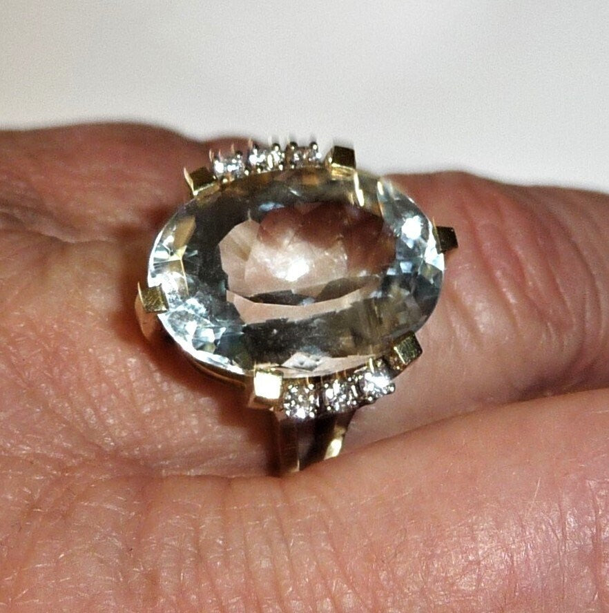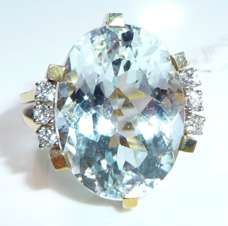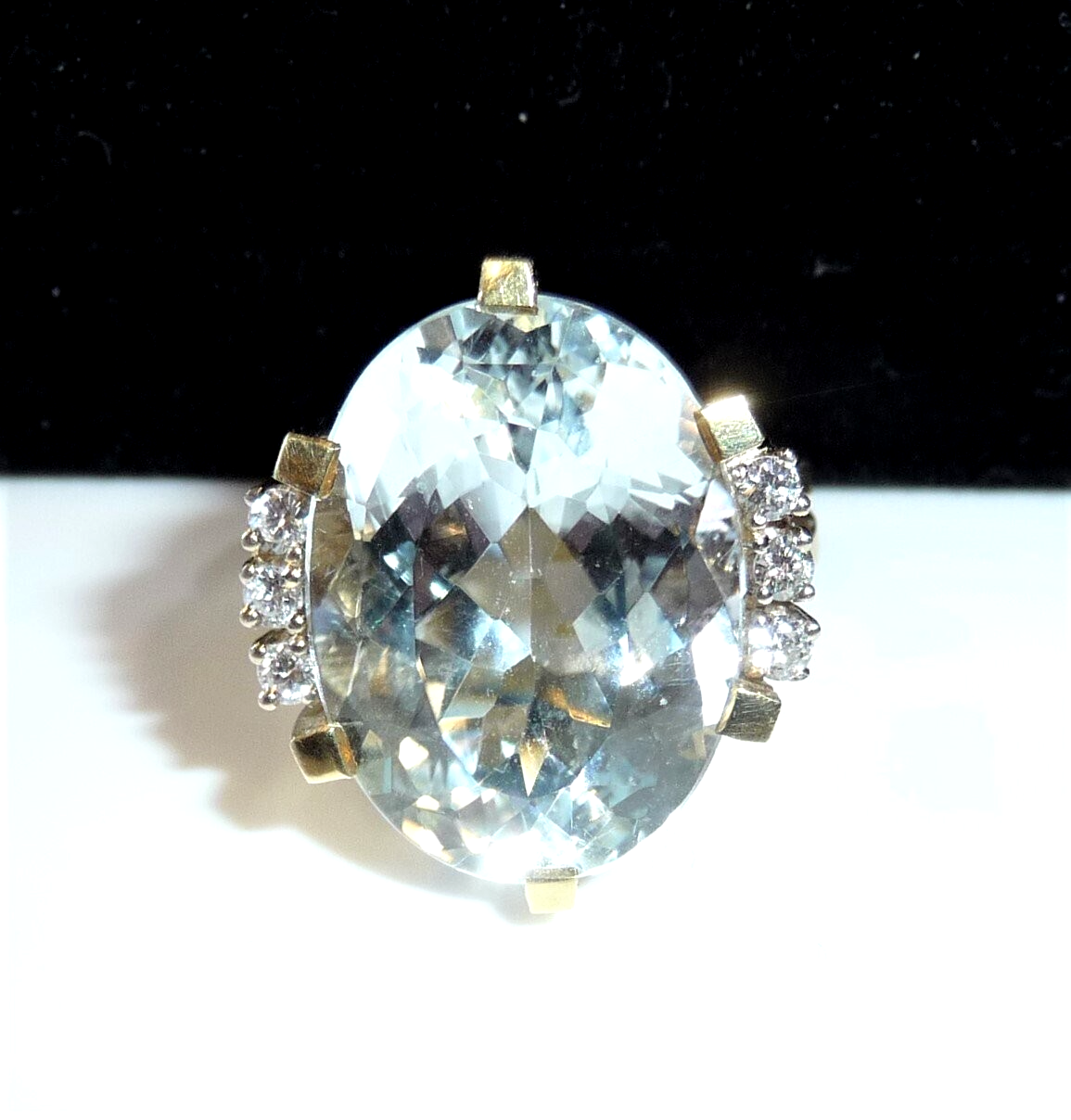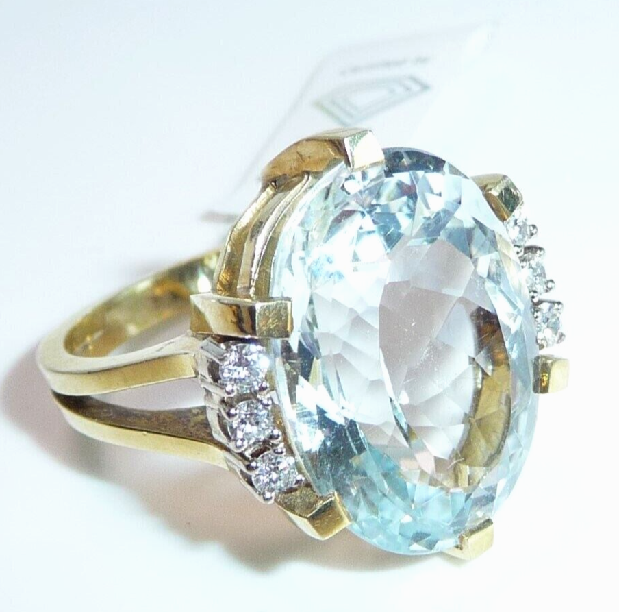 Eleganter Ring in 585 / 14 K Gelbgold. Der große Ringkopf hat einen ovalen hellblauen Topas von 20.00 ct. eingefasst. Der große Topas mit den Masßen 19x14x9,95mm hat eine wasser-blaue Farbe, die an einen Aquamarin erinnert. Der aufwendige Facettenschliff auch unter dem Topas lässt ihn bei jeder Bewegung funkeln. Seitlich sind jeweils 3 Diamanten im Brillantschliff von total 0.25ct. eingefasst.