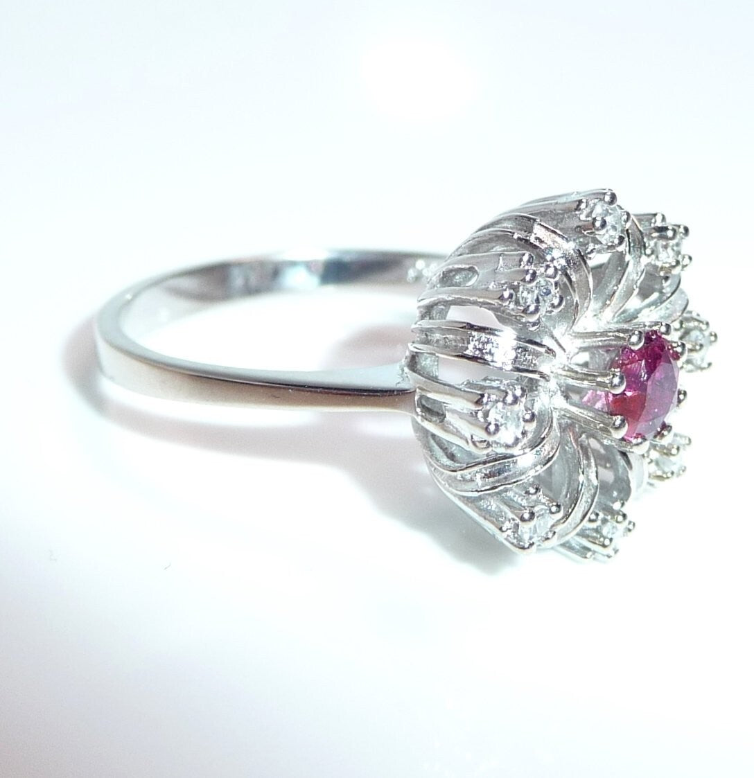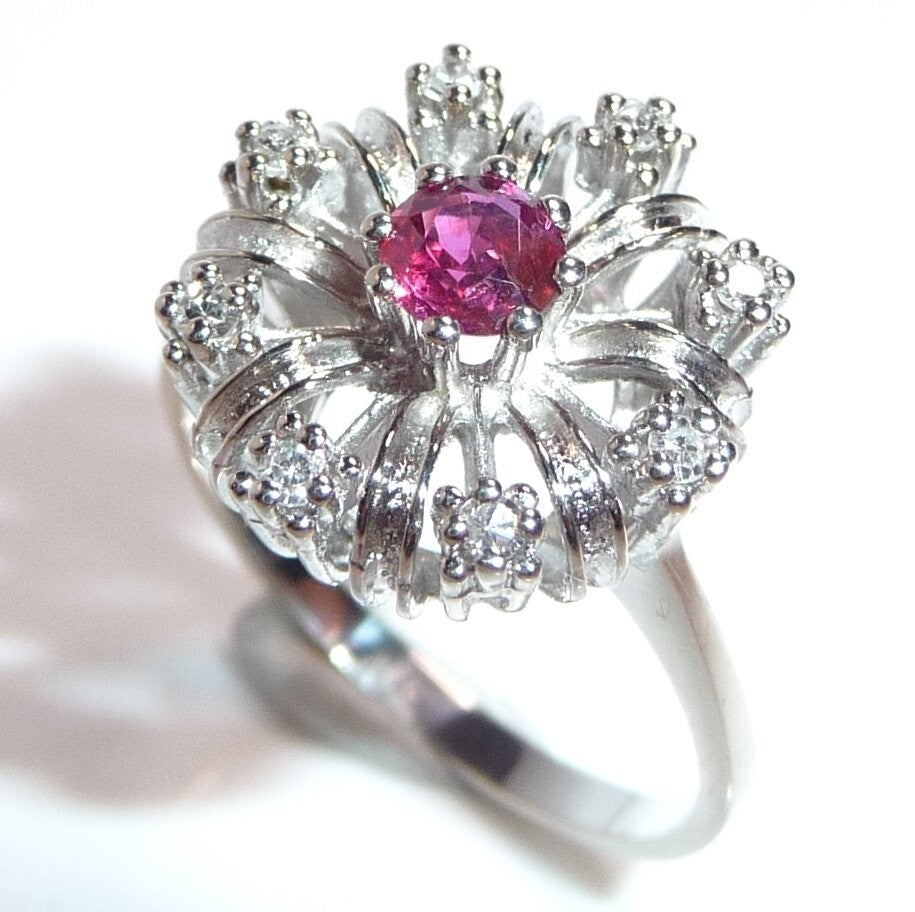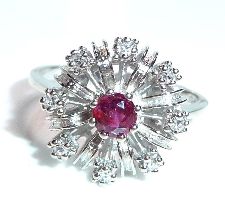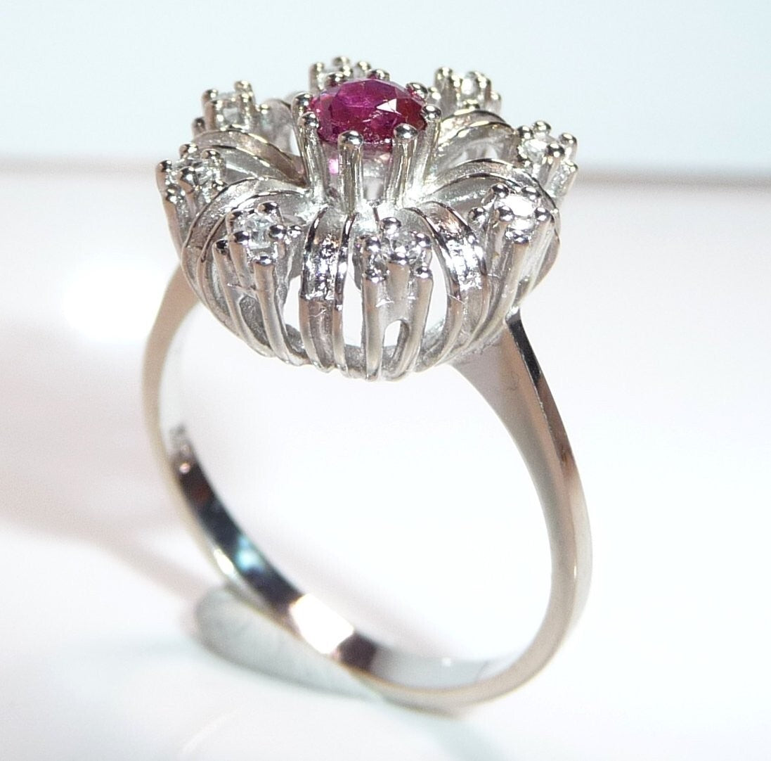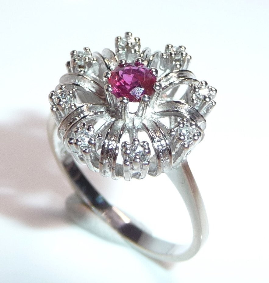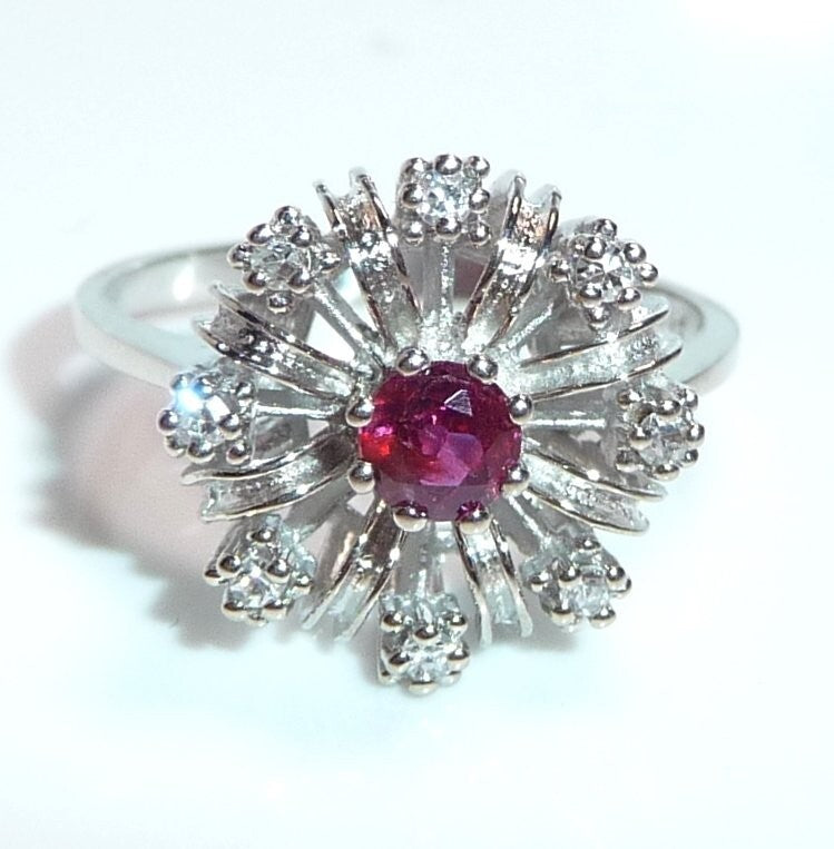 Goldschmiede-Ring, gearbeitet in 14 K / 585 Weißgold. Der klassische Cocktail-Ring ist wie eine Blüte gearbeitet. Im Zentrum ist ein Rubin von 0.20 ct. mit dem Durchmesser von ca. 3,8 mm. Wie ein kleines Feuerwerk, spreizen sich 8 Weißgold-Bögen vom Zentrum nach außen ab. Zwischen die strukturierten Bögen sind 8 Diamanten im Achtkantschliff in die Zwischenräume gesetzt. Die Diamanten sind in der Ringschiene mit 0.12 ct. notiert. Farbe H-G und Reinheit VS-SI.