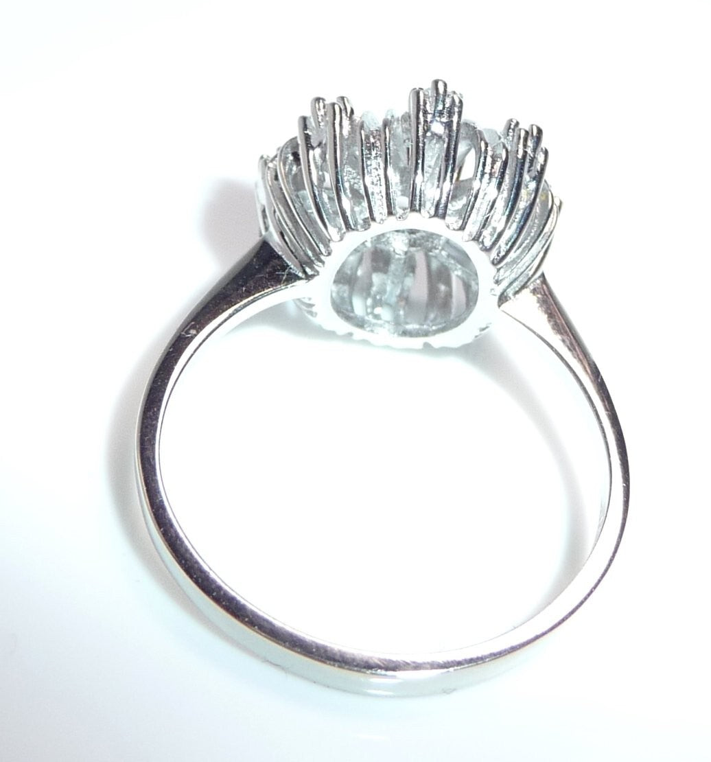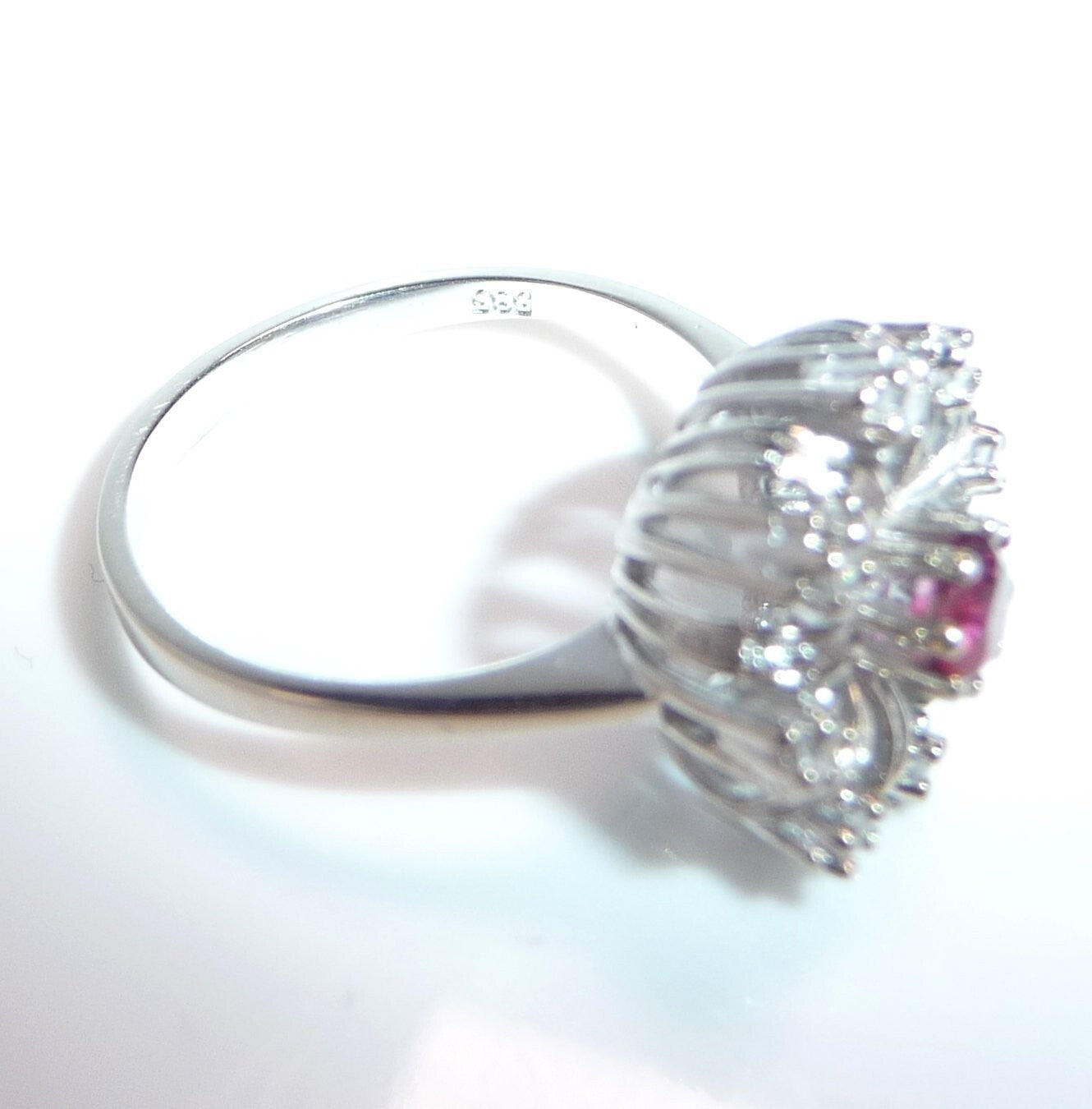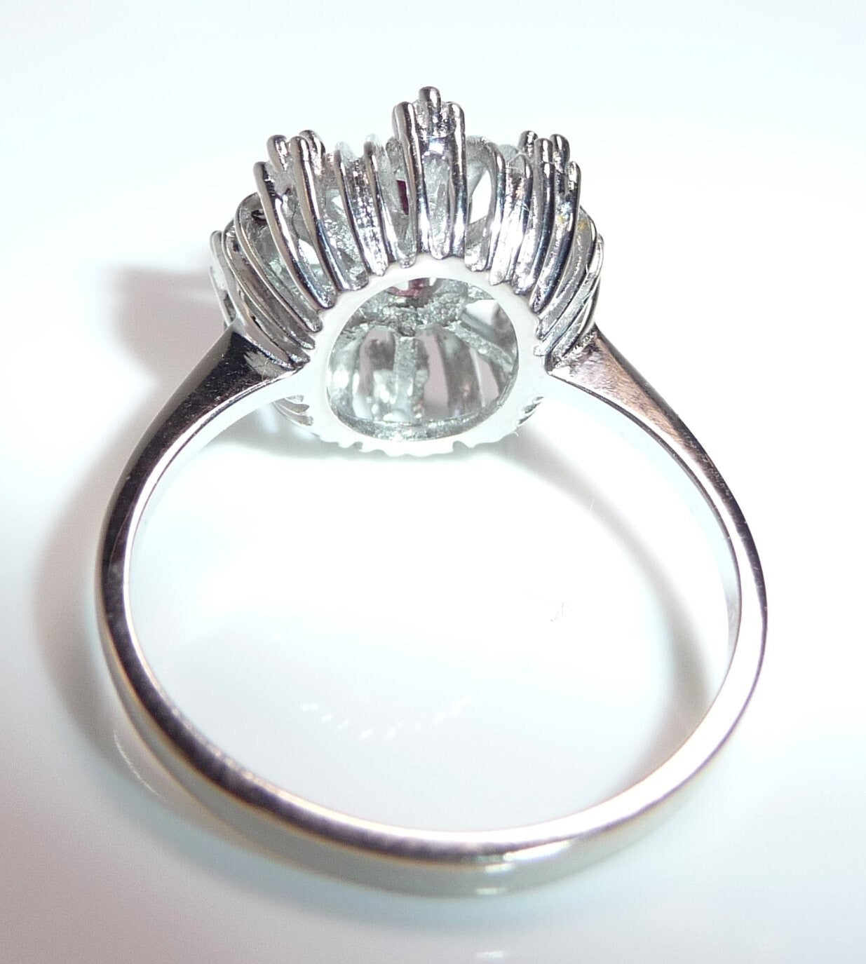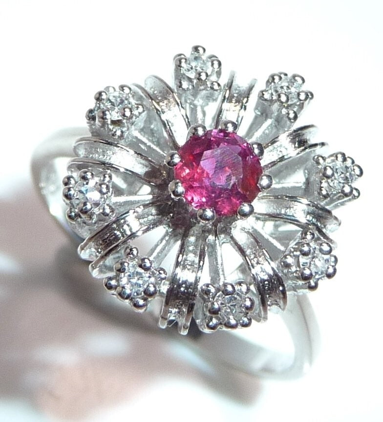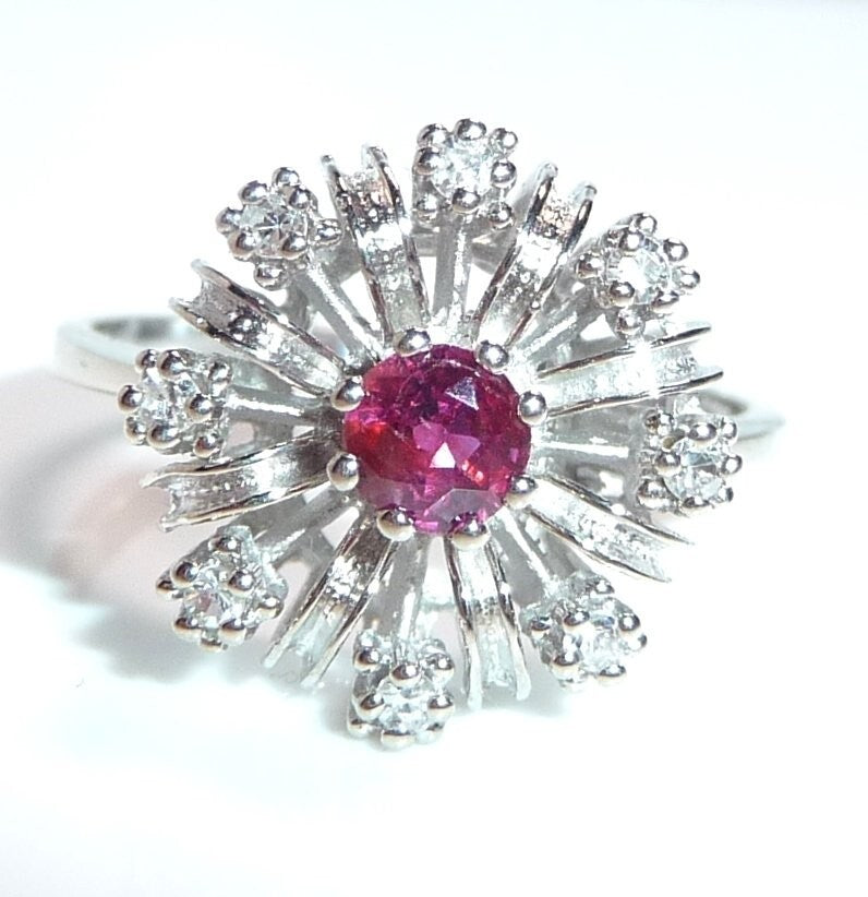 Goldschmiede-Ring, gearbeitet in 14 K / 585 Weißgold. Der klassische Cocktail-Ring ist wie eine Blüte gearbeitet. Im Zentrum ist ein Rubin von 0.20 ct. mit dem Durchmesser von ca. 3,8 mm. Wie ein kleines Feuerwerk, spreizen sich 8 Weißgold-Bögen vom Zentrum nach außen ab. Zwischen die strukturierten Bögen sind 8 Diamanten im Achtkantschliff in die Zwischenräume gesetzt. Die Diamanten sind in der Ringschiene mit 0.12 ct. notiert. Farbe H-G und Reinheit VS-SI.