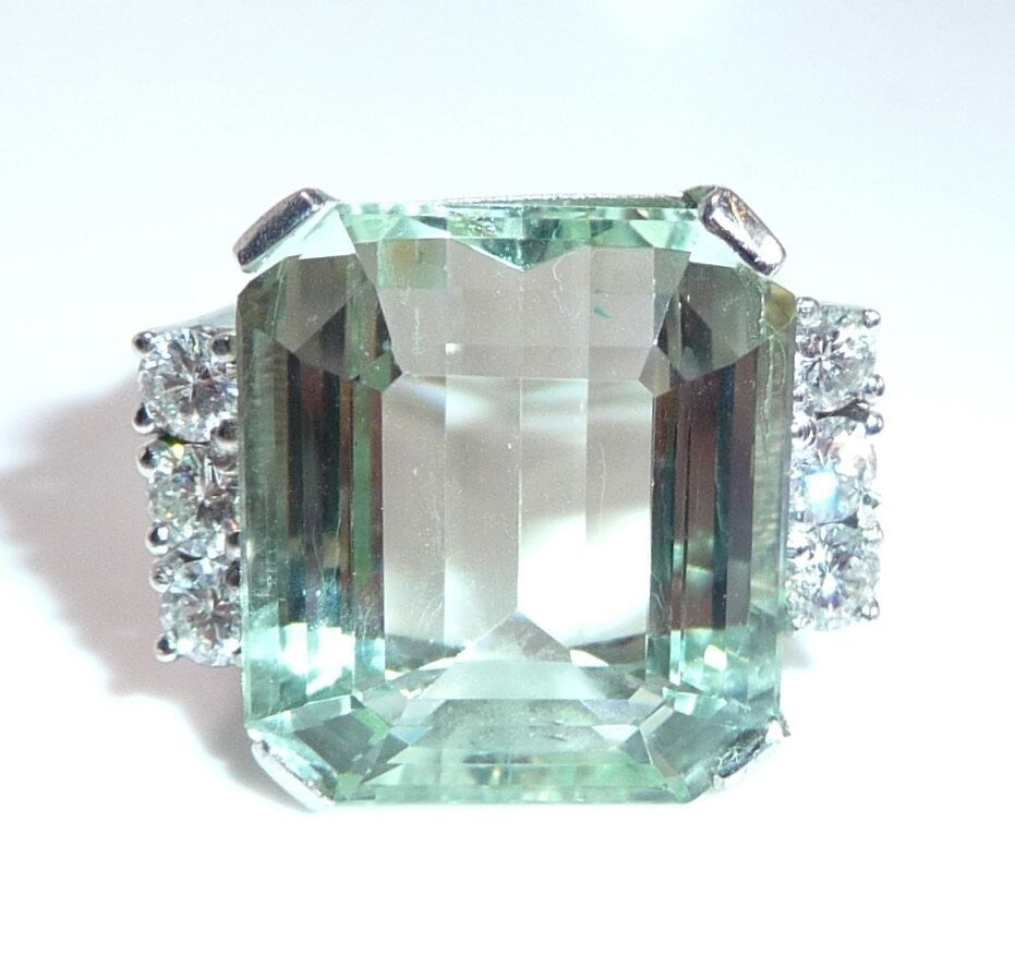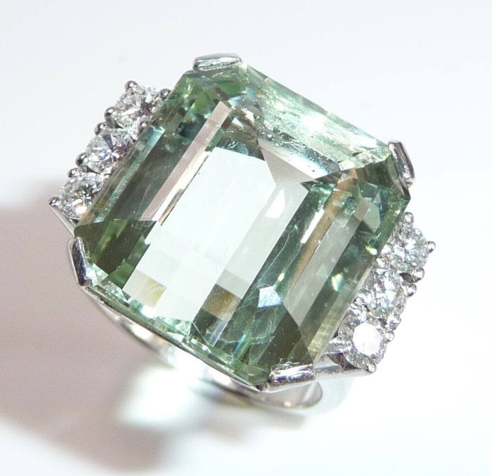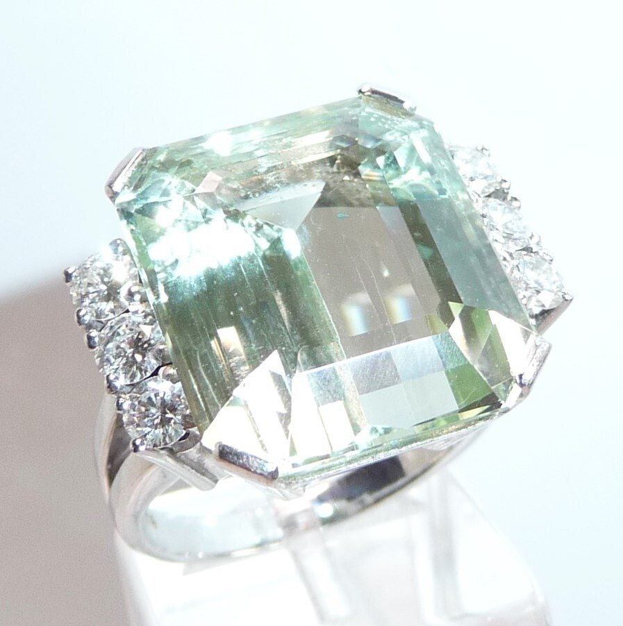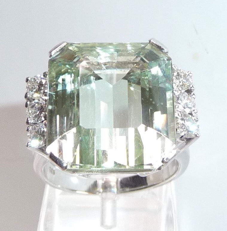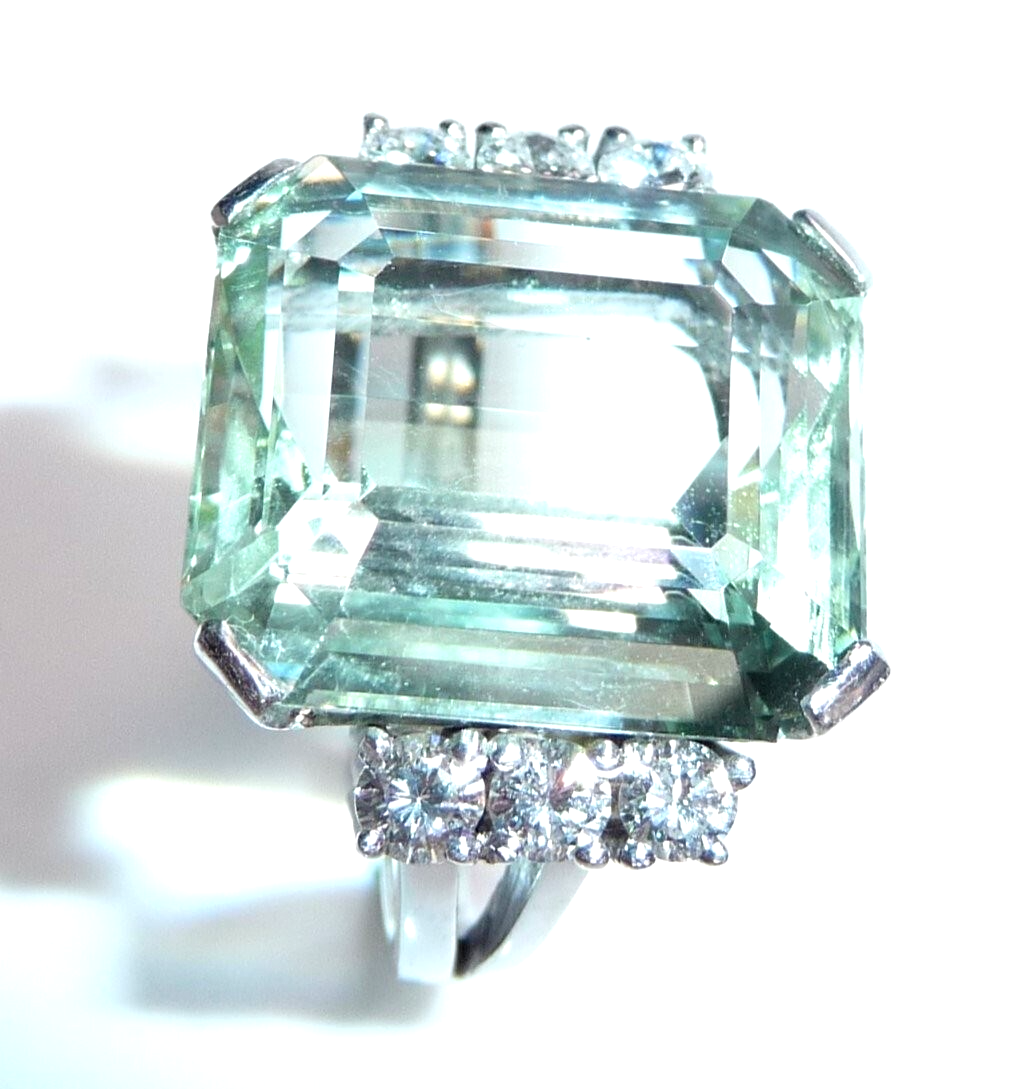 Außergewöhnlicher Goldschmiede-Ring, gearbeitet in 14 K / 585 Weißgold. Der Ring hat einen großen, klaren Aquamarin von 16.30 ct. erhaben in 4 starken Krappen eingefasst. Der Aquamarin hat einen achteckigen Smaragdschliff mit stufigen Facetten im oberen und im unteren Bereich. Der wertvolle große Edelstein wird von jeweils drei Diamanten im Brillantschliff von total 0.60 ct. (F-G/VVS-VS). Der Aquamarin geht farblich eine Nuance ins helle Grün hinein. Farblich liegt er zwischen Aquamarin und Heliodor - der grünlichen Variante des Berylls.