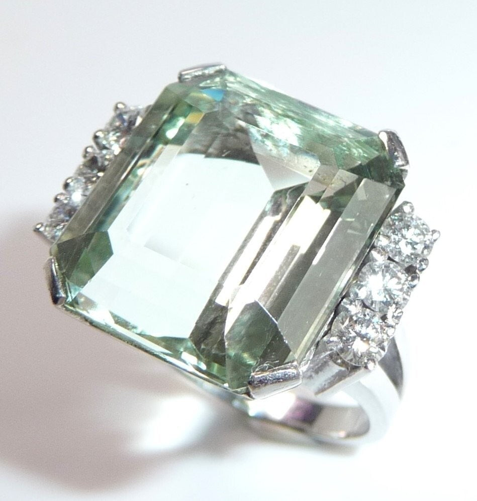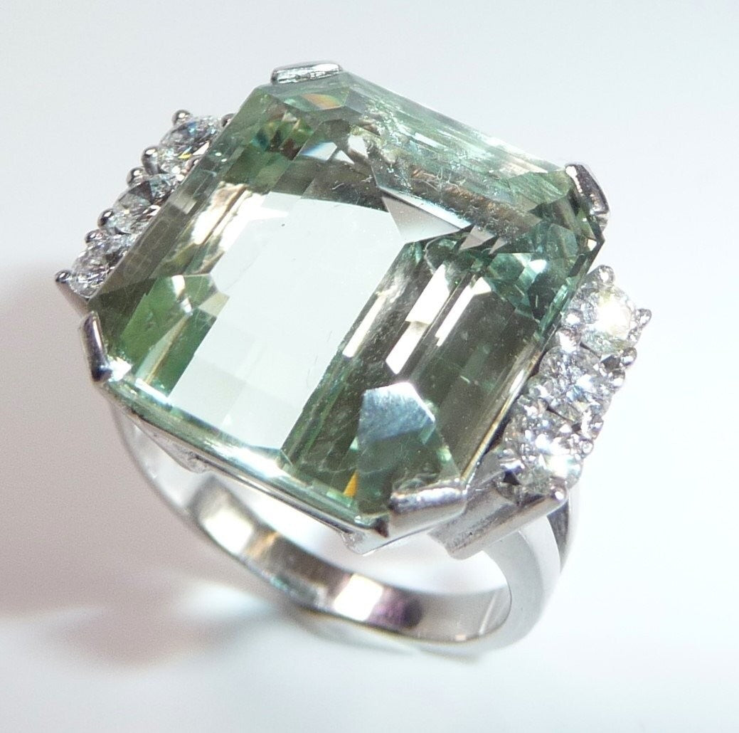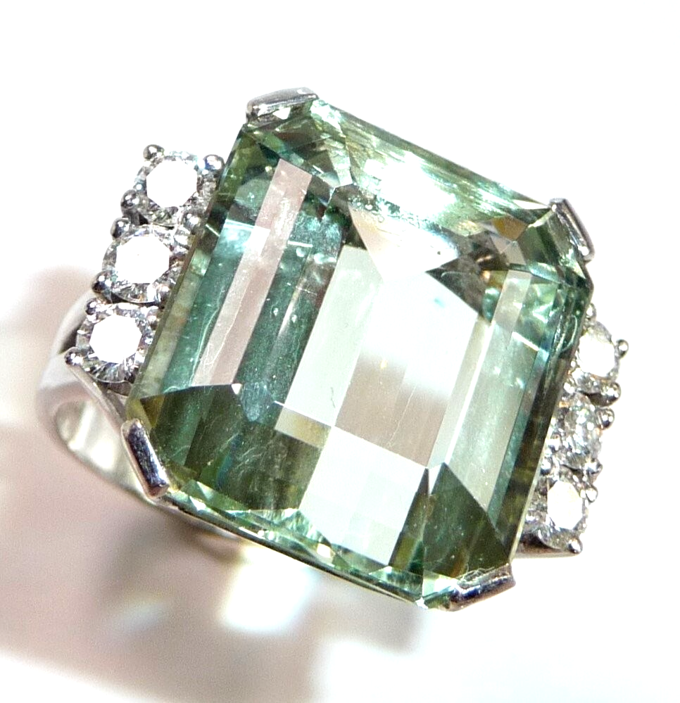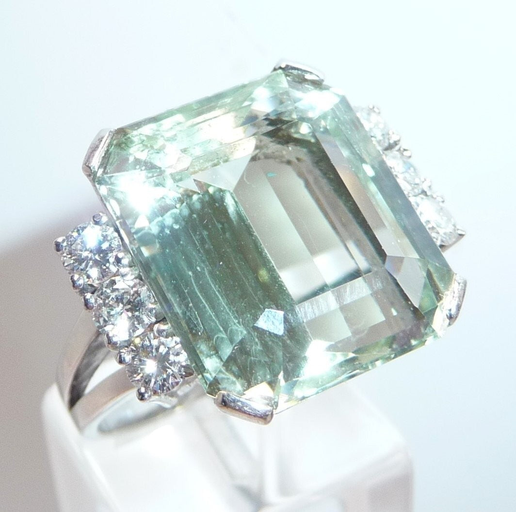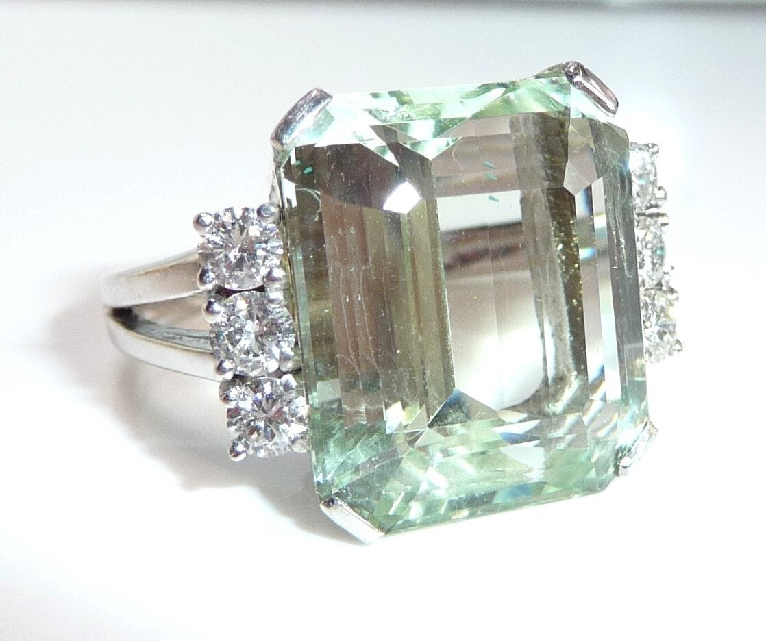 Außergewöhnlicher Goldschmiede-Ring, gearbeitet in 14 K / 585 Weißgold. Der Ring hat einen großen, klaren Aquamarin von 16.30 ct. erhaben in 4 starken Krappen eingefasst. Der Aquamarin hat einen achteckigen Smaragdschliff mit stufigen Facetten im oberen und im unteren Bereich. Der wertvolle große Edelstein wird von jeweils drei Diamanten im Brillantschliff von total 0.60 ct. (F-G/VVS-VS). Der Aquamarin geht farblich eine Nuance ins helle Grün hinein. Farblich liegt er zwischen Aquamarin und Heliodor - der grünlichen Variante des Berylls.