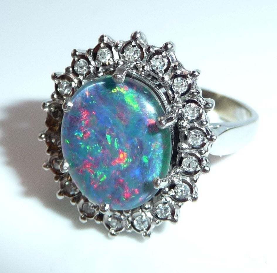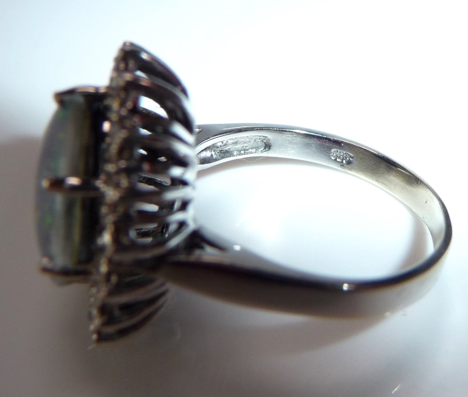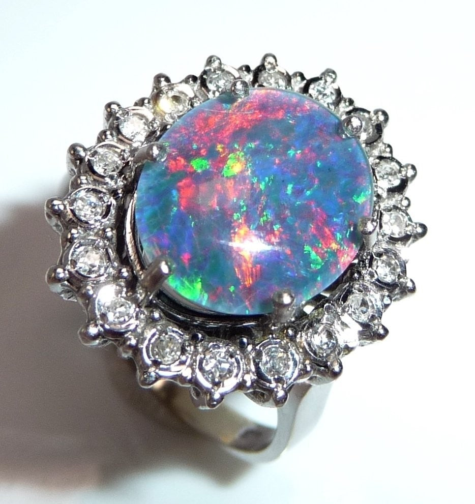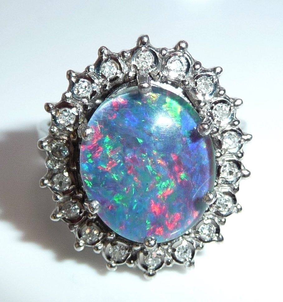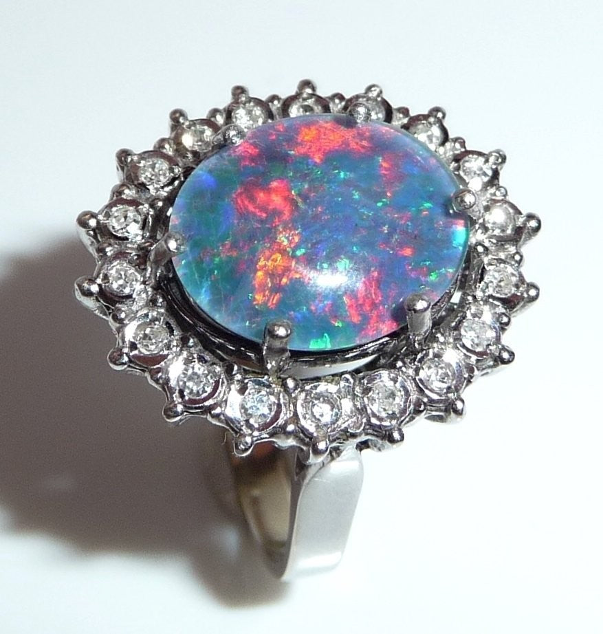 Der Opal wird umrundet von 18 kleinen Diamanten im Achtkantschliff von total 0.20 ct. Die Diamanten sind in großzügige Fassungen eingelassen, so dass sie deutlich größer wirken.