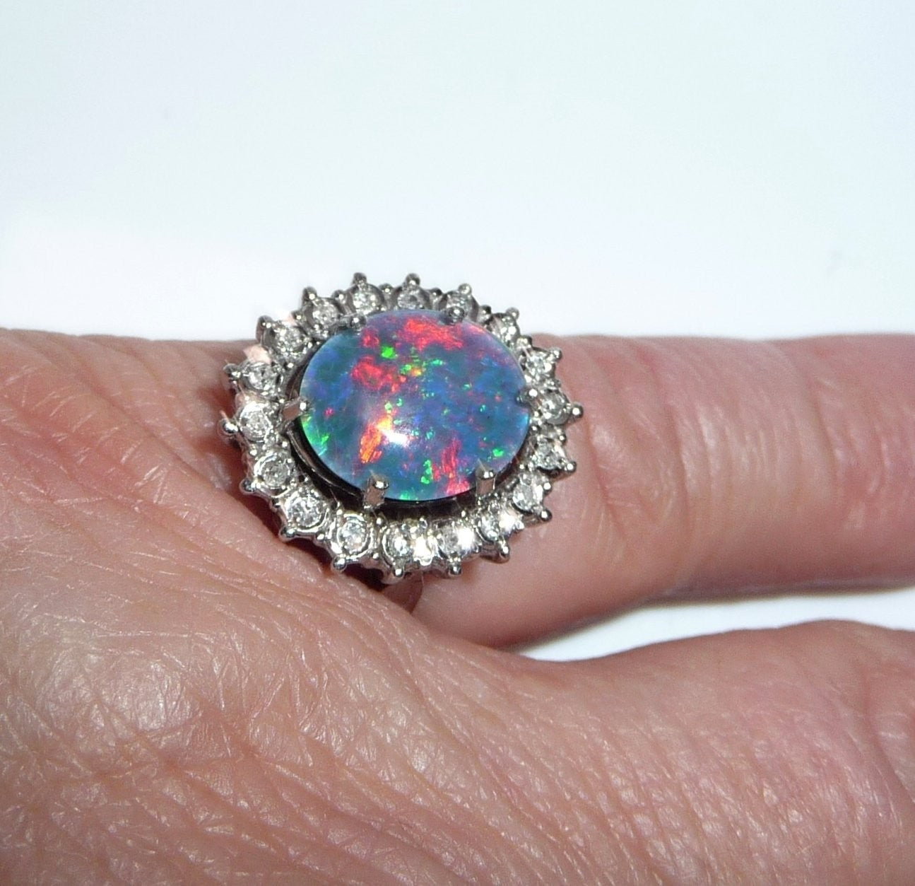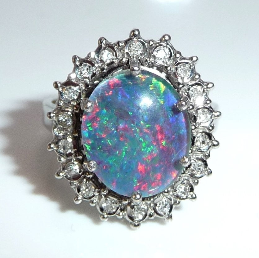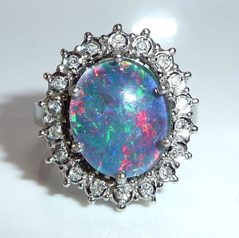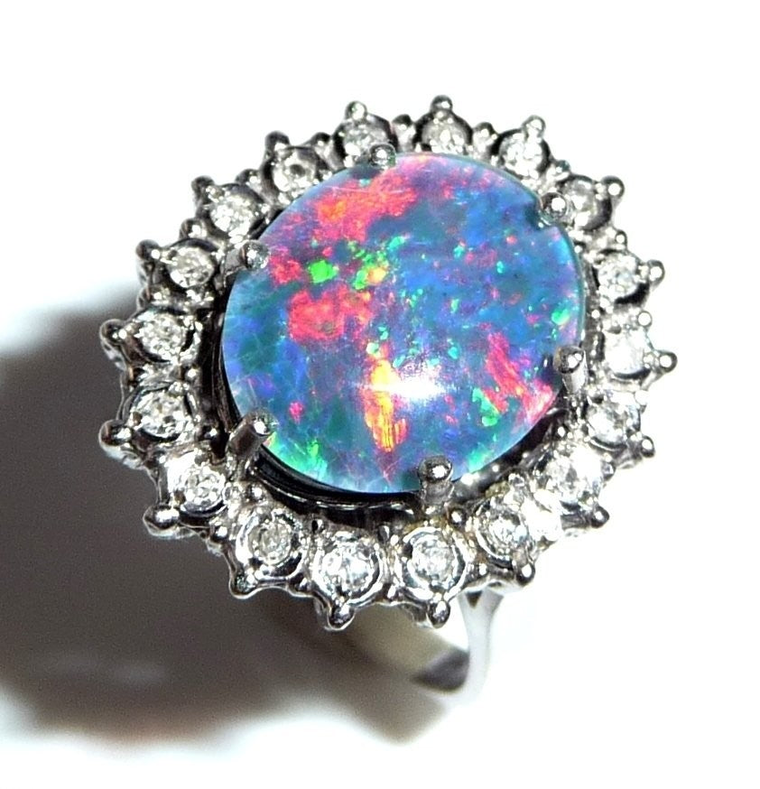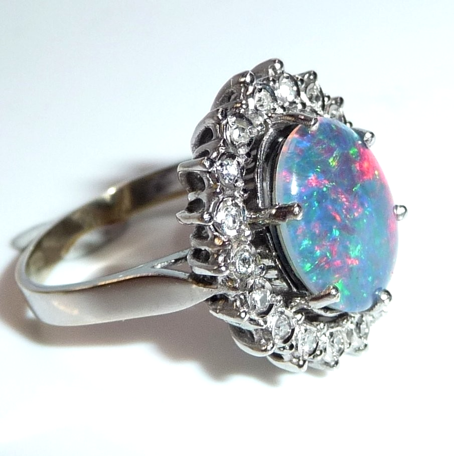Eingefasst ist ein Australischer Opal als Triplette gearbeitet. Der Opal zeigt ein schönes Farbspektrum mit hohem Rot-Anteil. Rot ist die seltenste Farbe bei Opalen. Neben dem Rot finden sich auch Blau, Orange, Gelb und Grün in diesem Lagenopal.