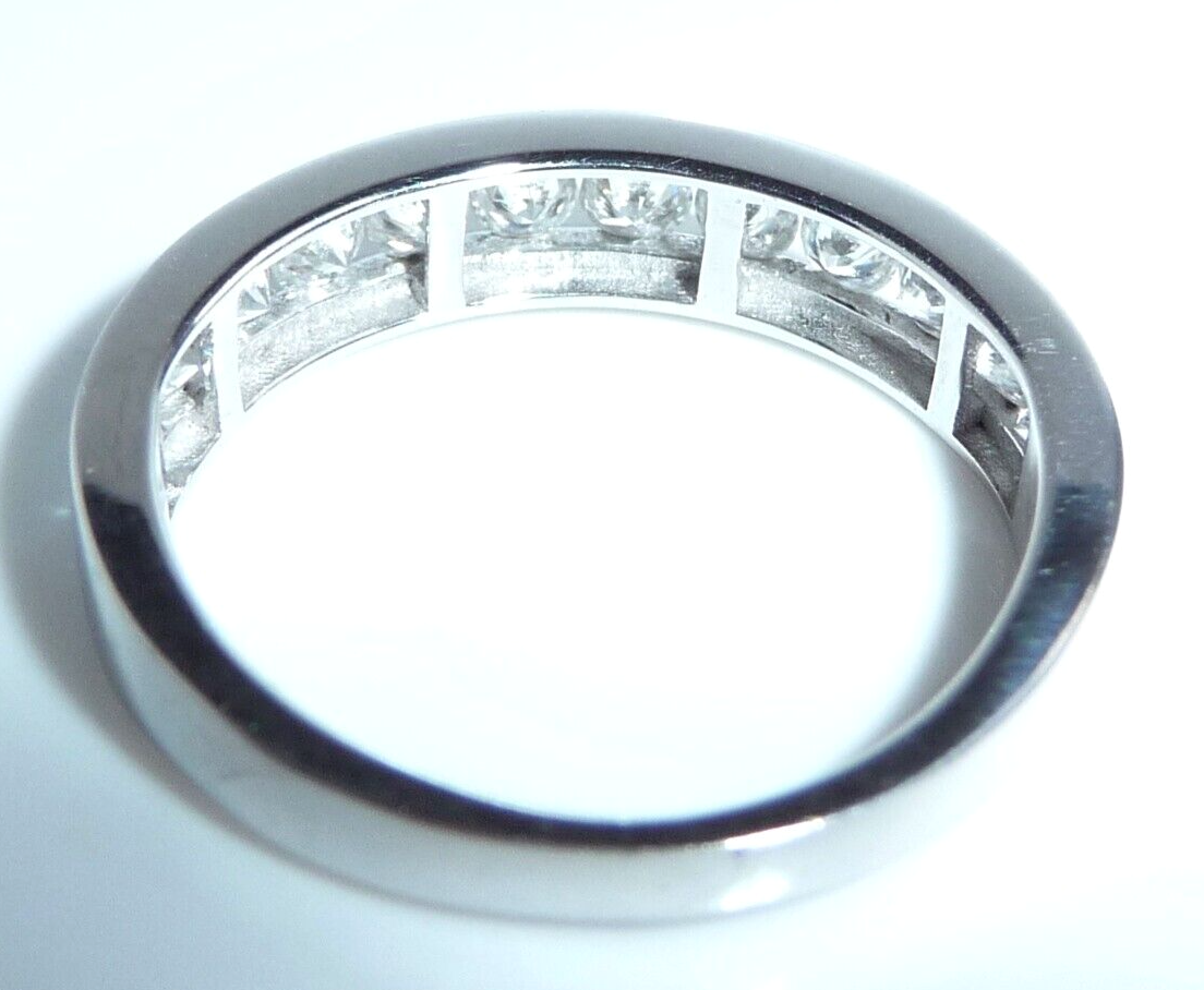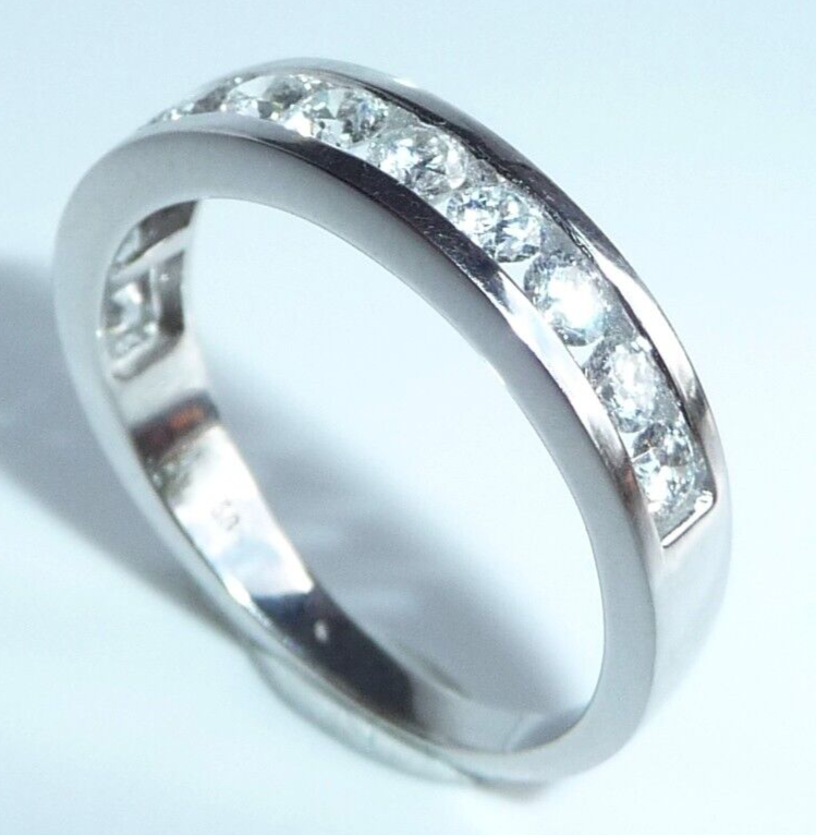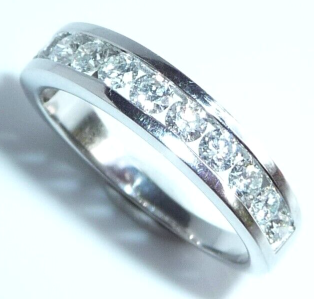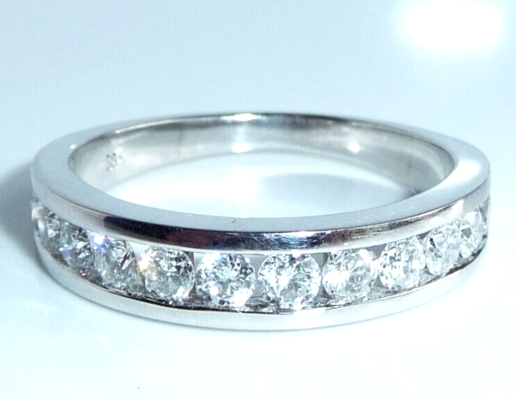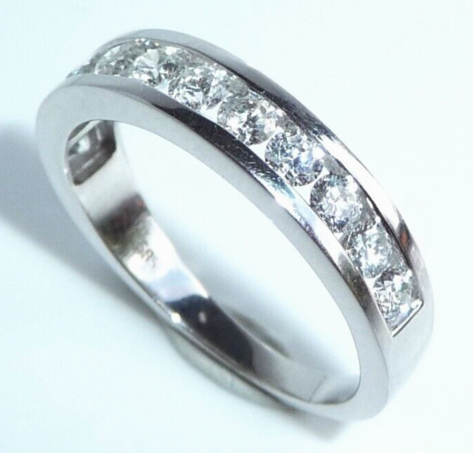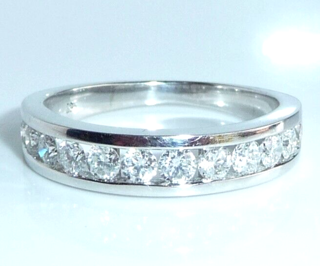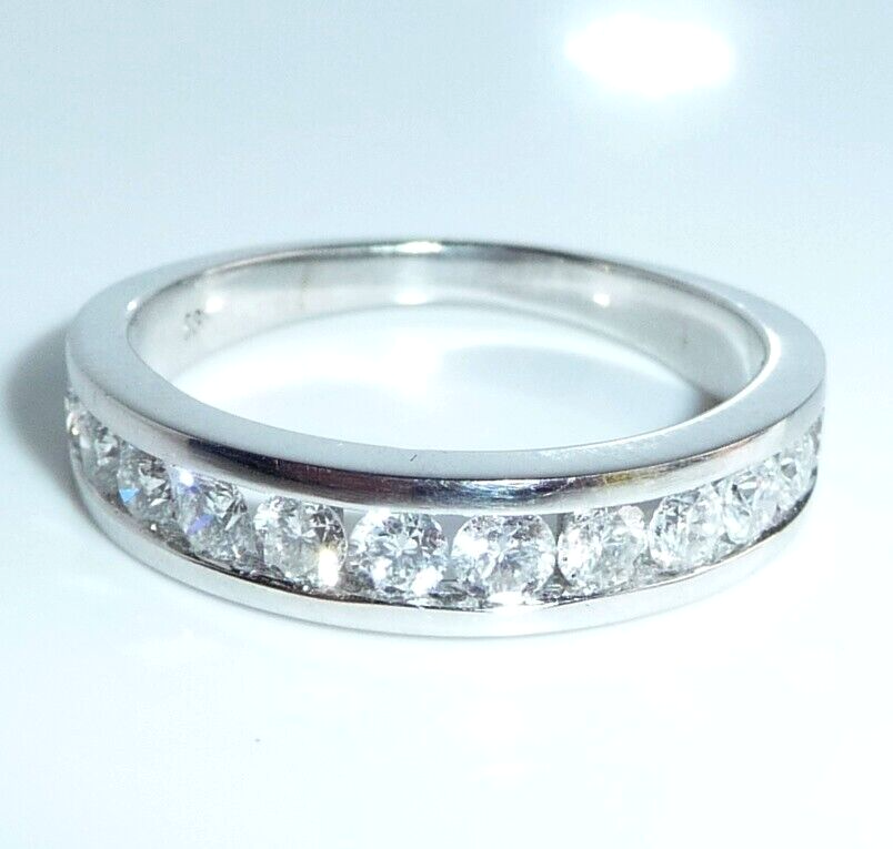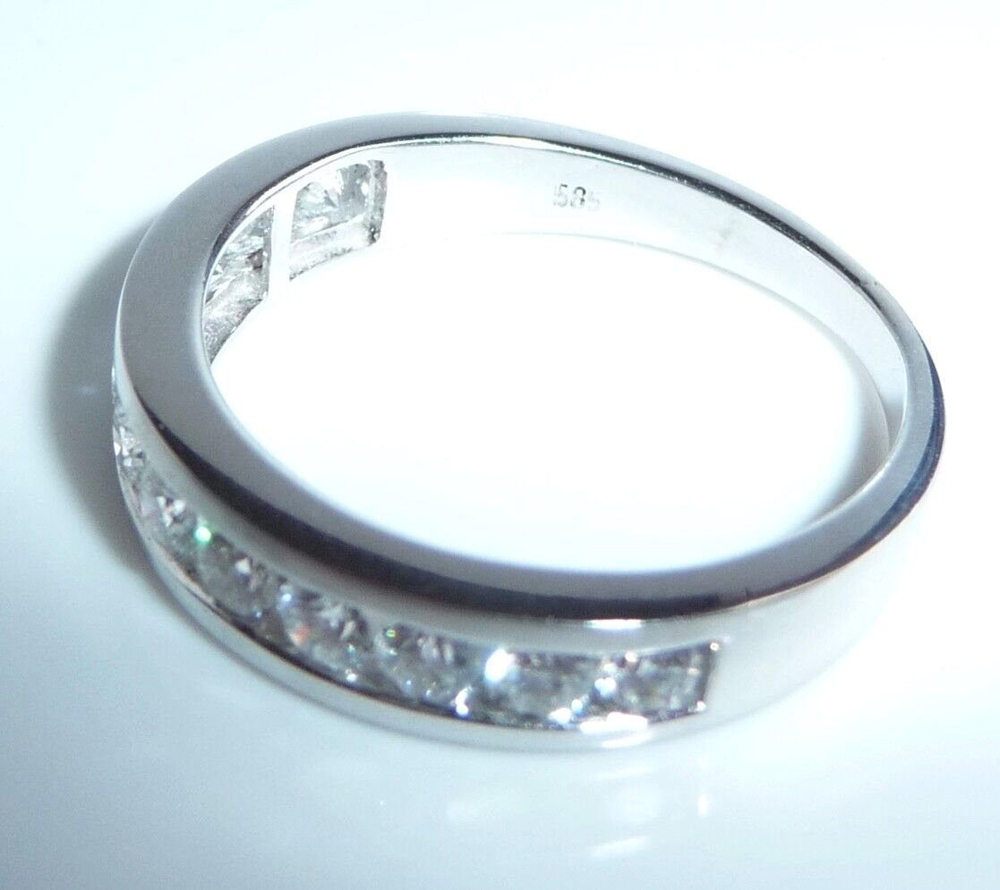 Goldschmiede-Ring, gearbeitet in 14 K / 585 Weißgold. Der Ring ist wie ein Halb-Memory gearbeitet, wobei die 12 Diamanten dicht an dicht in einer Kanal-Fassung eingefasst sind. Die relativ offene Fassung gewährt einen guten Lichteinfall und lässt die Diamanten erstrahlen. Zusammen haben die 12 Diamanten mindestens 1.00 ct. (H/SI-I)