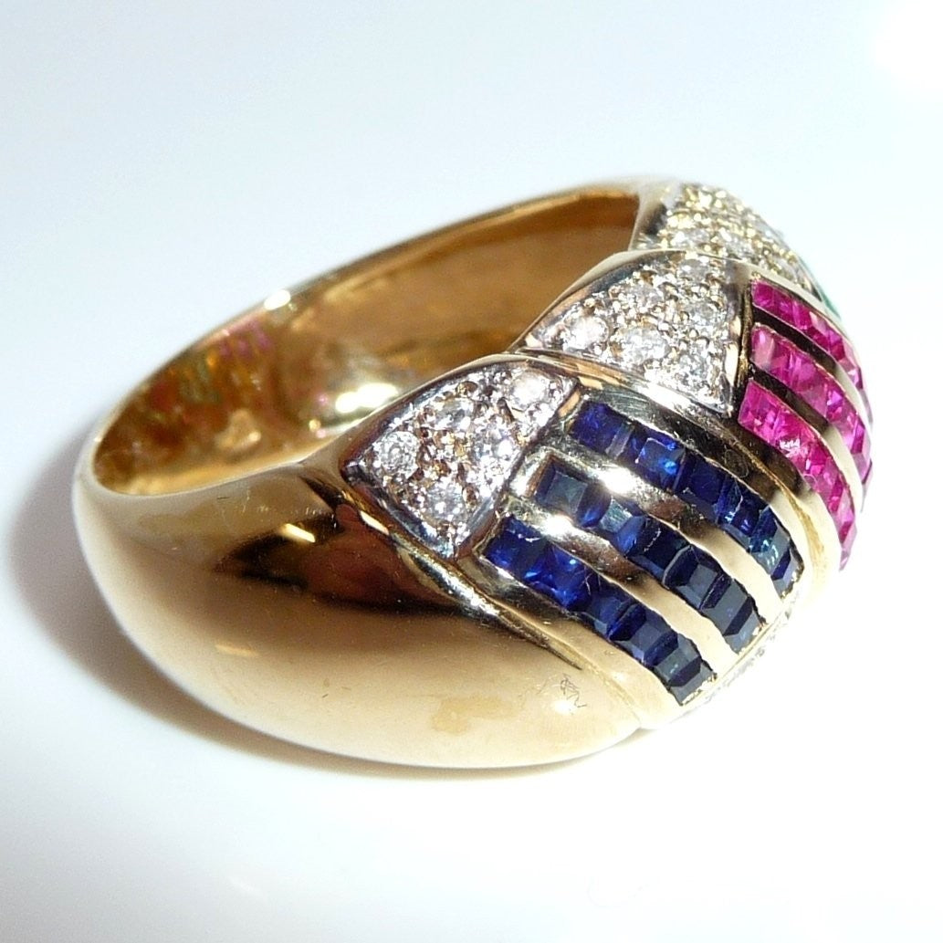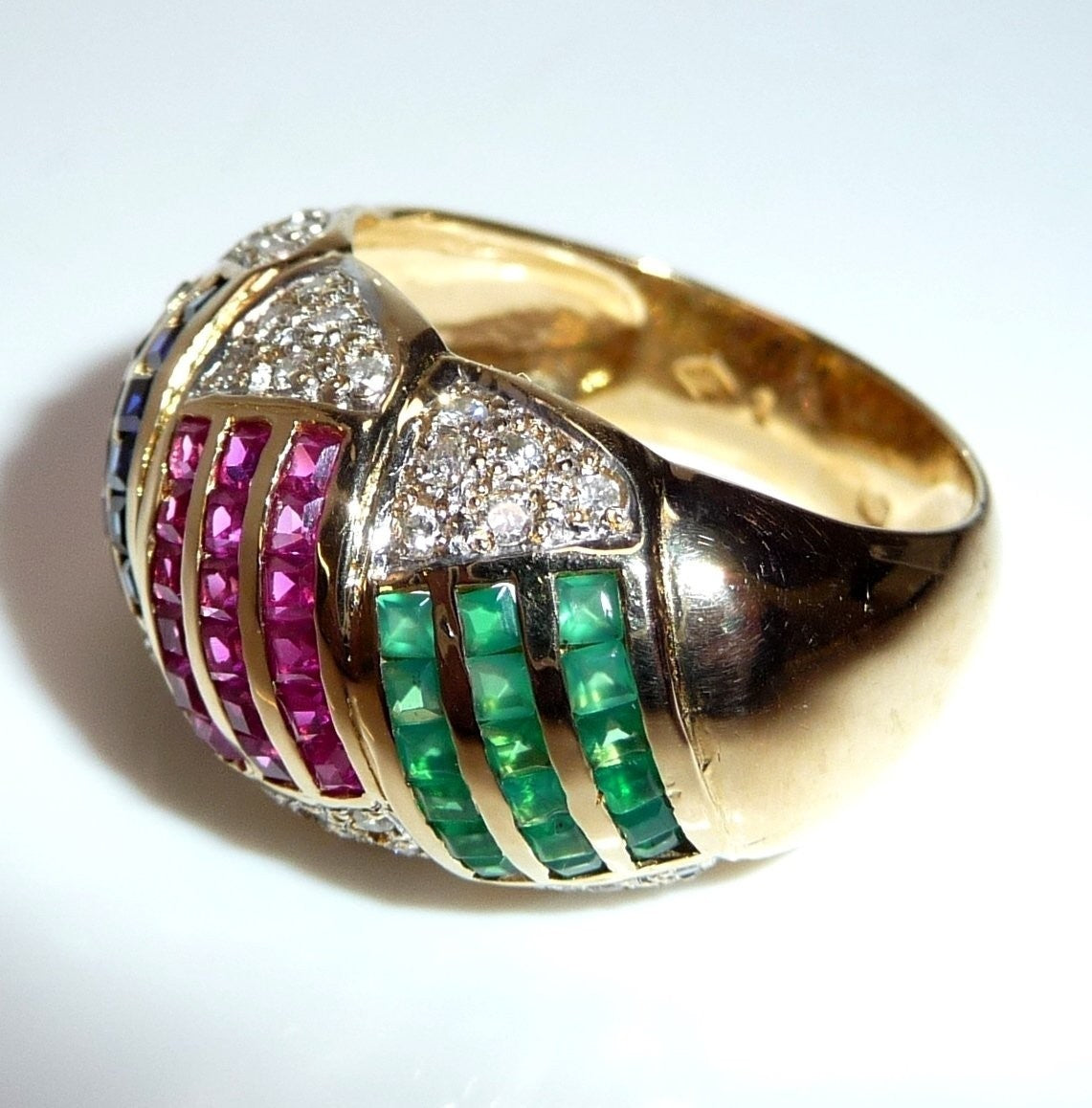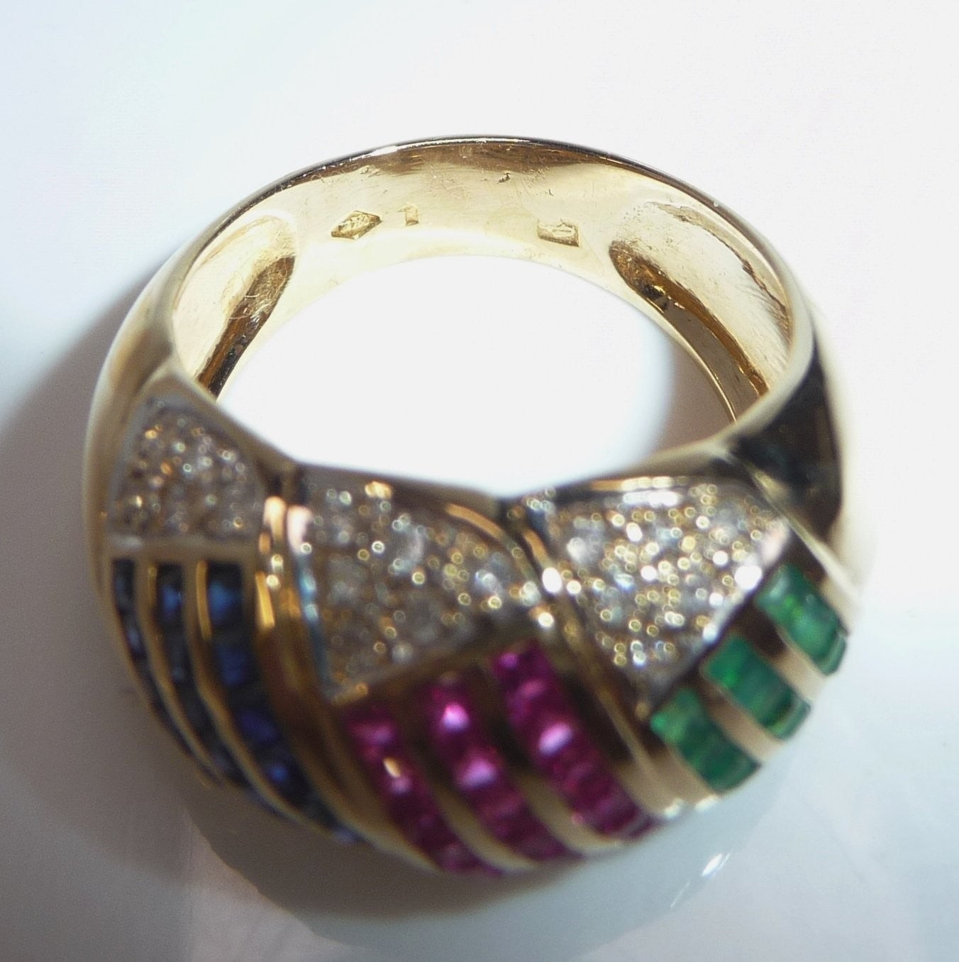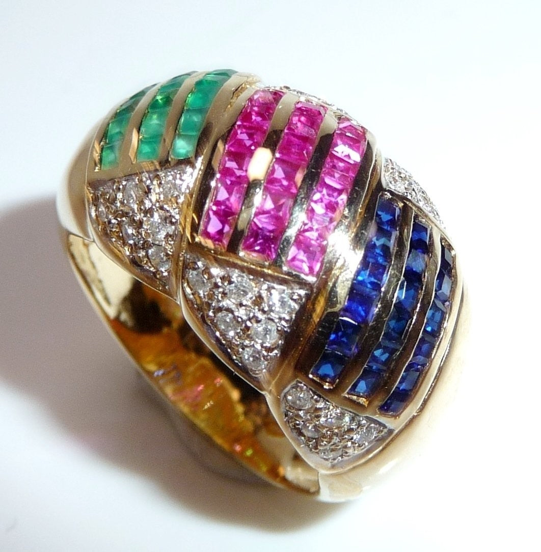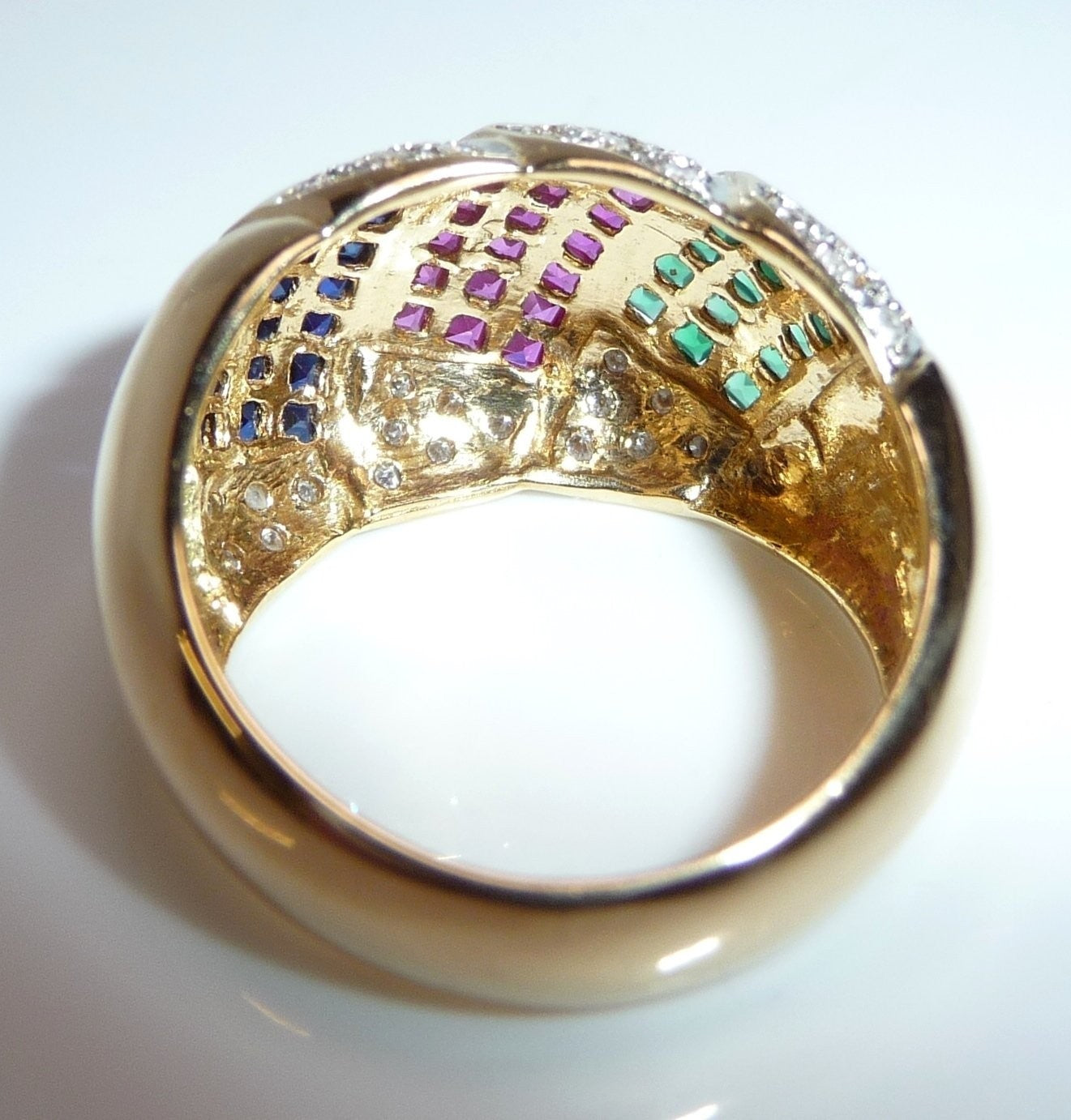 Breiter Bandring in 750 / 18 K Gelbgold. Der Ring ist im oberen Bereich kuppelförmig gewölbt und zeigt ein Feuerwerk an Farben. Diagonal über die Fläche laufen 24 Smaragde, 24 Saphire und 24 Rubine im quadratischen Schliff. Die Edelsteine sind in jeweils 3 parallelen Reihen in Kanalfassungen eingefasst und haben zusammen 2.00 ct.. Die Edelsteine haben feine, intensive Farben.