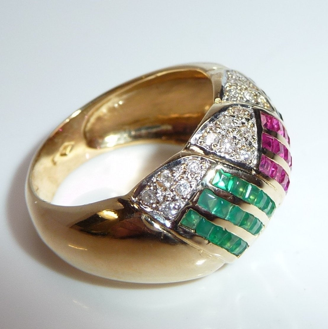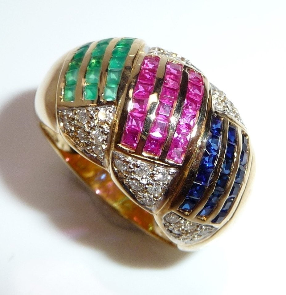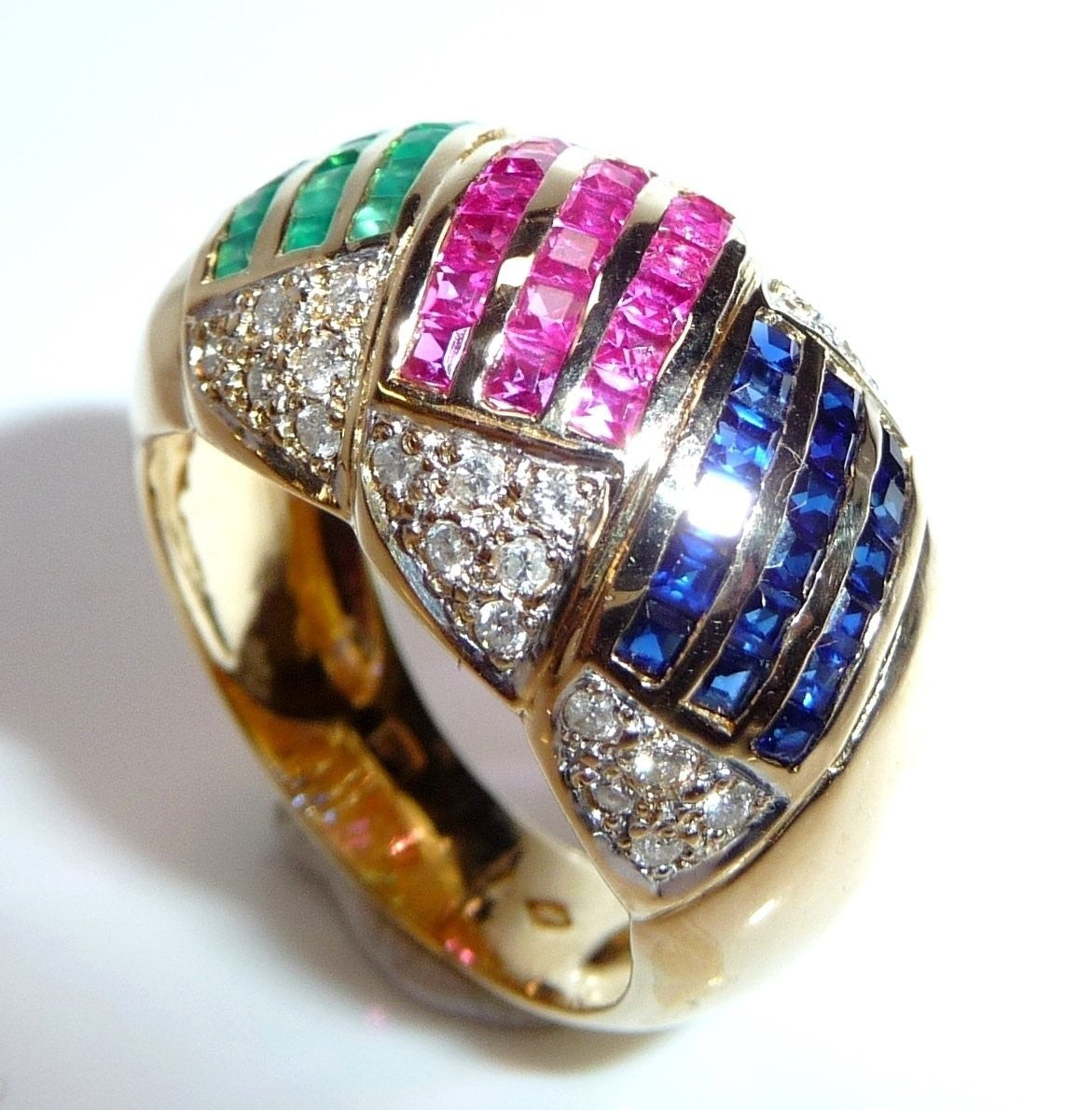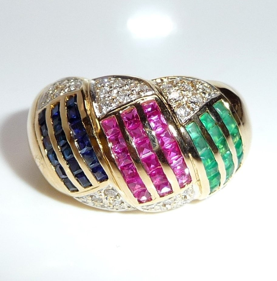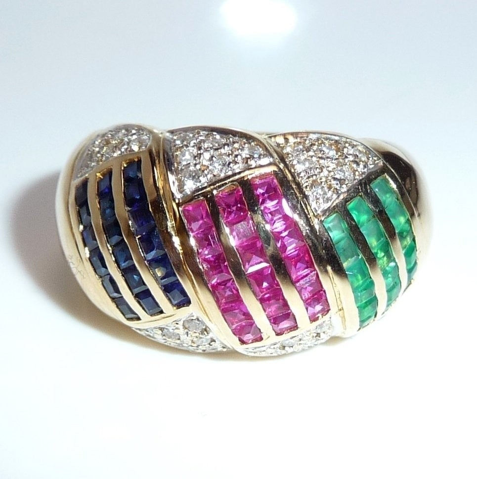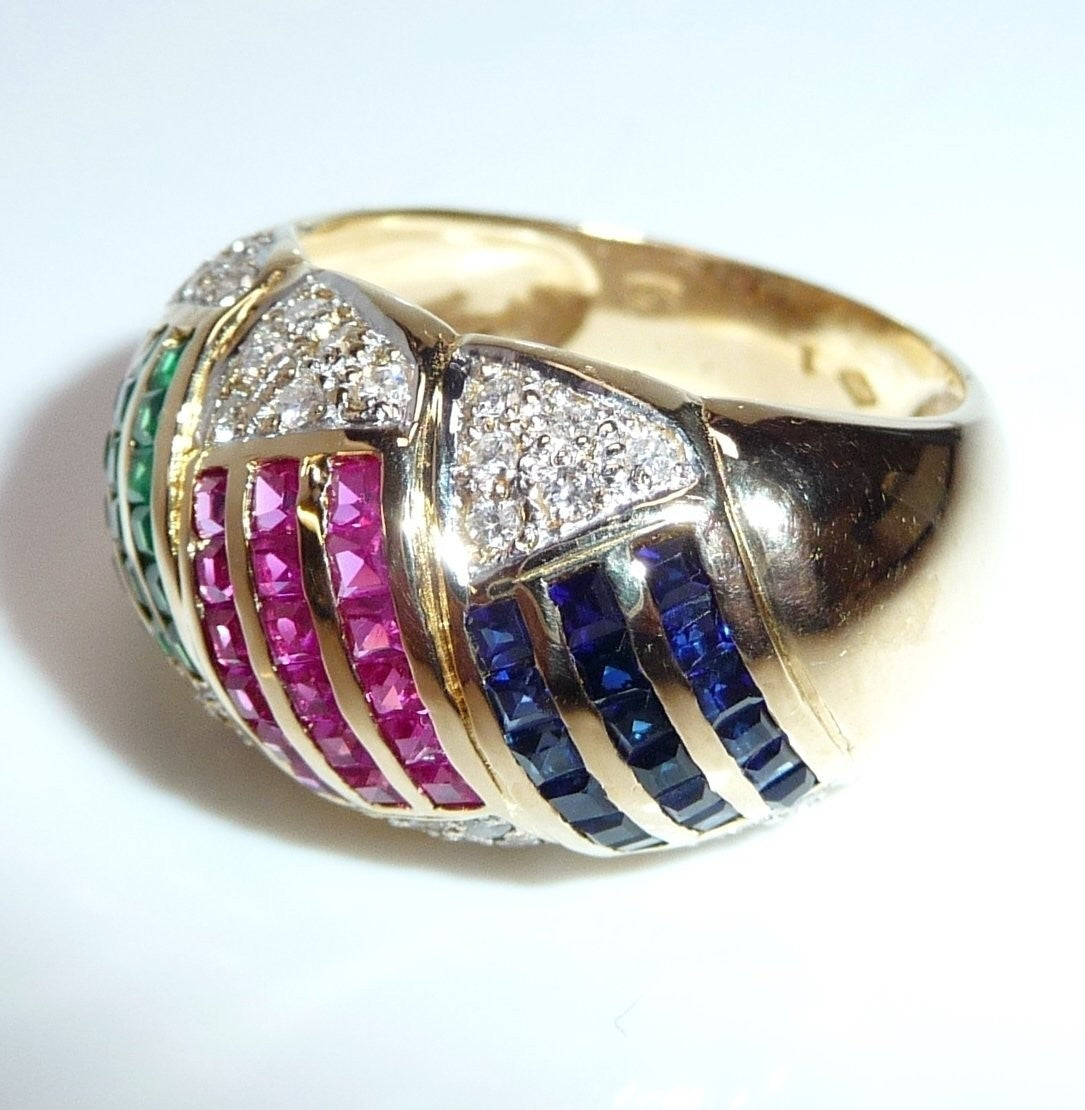 Breiter Bandring in 750 / 18 K Gelbgold. Der Ring ist im oberen Bereich kuppelförmig gewölbt und zeigt ein Feuerwerk an Farben. Diagonal über die Fläche laufen 24 Smaragde, 24 Saphire und 24 Rubine im quadratischen Schliff. Die Edelsteine sind in jeweils 3 parallelen Reihen in Kanalfassungen eingefasst und haben zusammen 2.00 ct.. Die Edelsteine haben feine, intensive Farben.