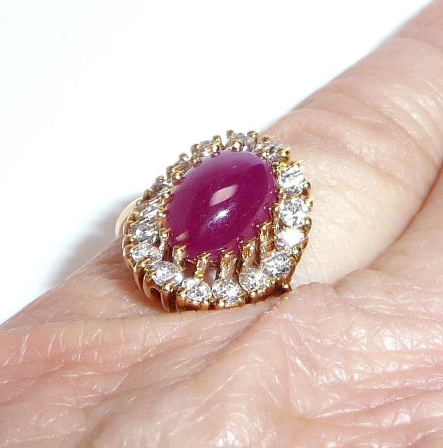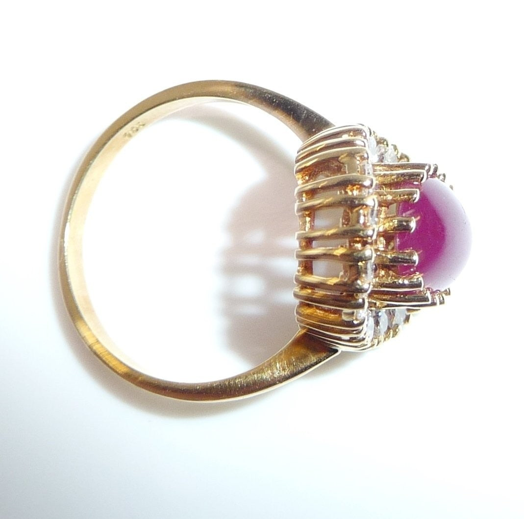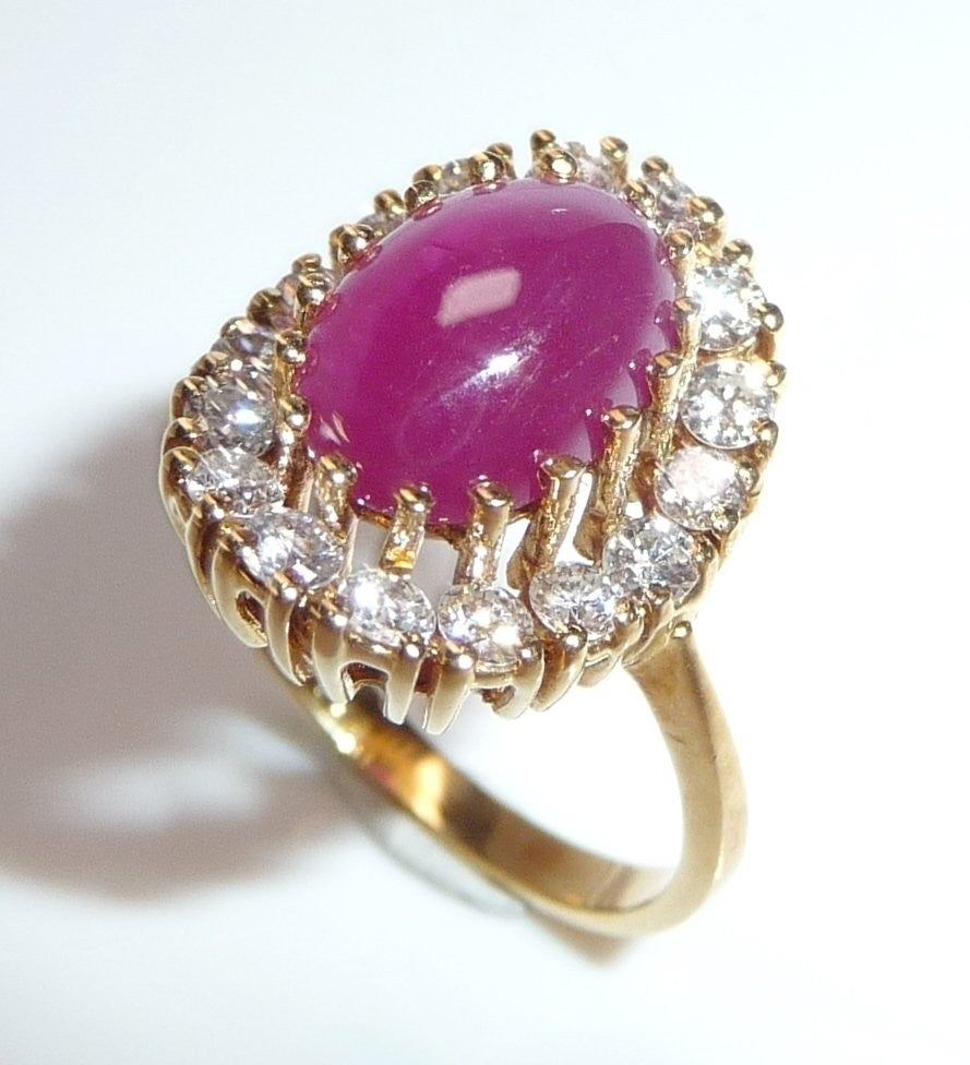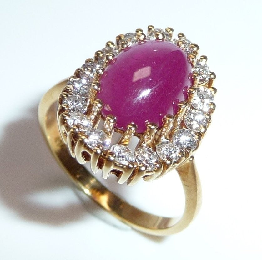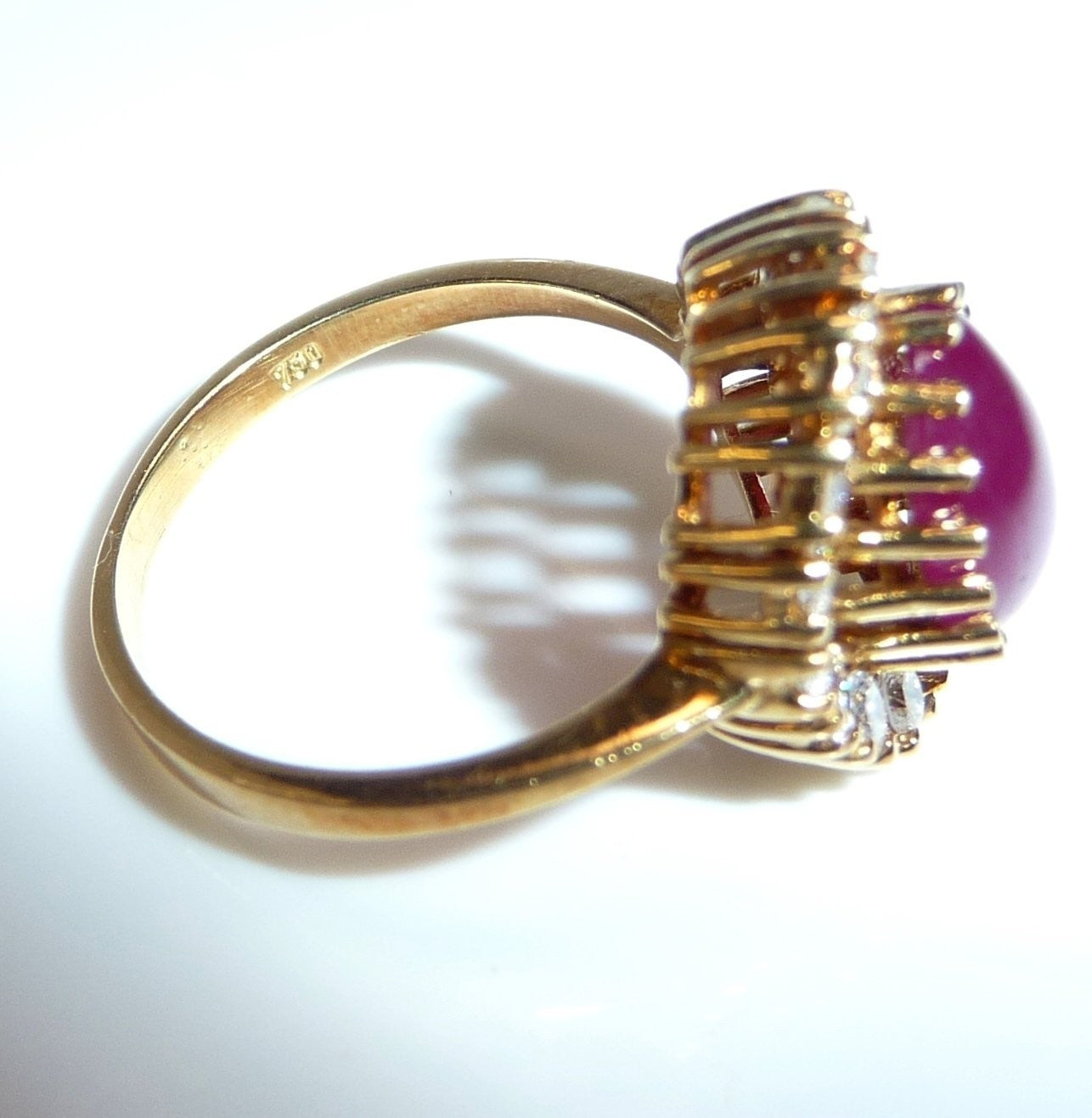 Ring in 750 Gelbgold. Der Ring hat ein klassisches Design mit einem ovalen Ringkopf. Im Zentrum ist ein intensiv roter Rubin im Cabochonschliff von 2.80 ct. Der Rubin ist opak und hat die Maße 10,5 x 7,6 x 3,5 mm. Der Rubin-Cabochon wird von zahlreichen Stotzen/Krappen gehalten. Auf einer tieferen Ebene wird der Rubin von 16 Diamanten im Brillantschliff umrundet. Außergewöhnlich ist, dass dieser Diamant-Kranz zur Mitte hin eine konkave Linie hat. Das macht den Ring sehr außergewöhnlich im Design.