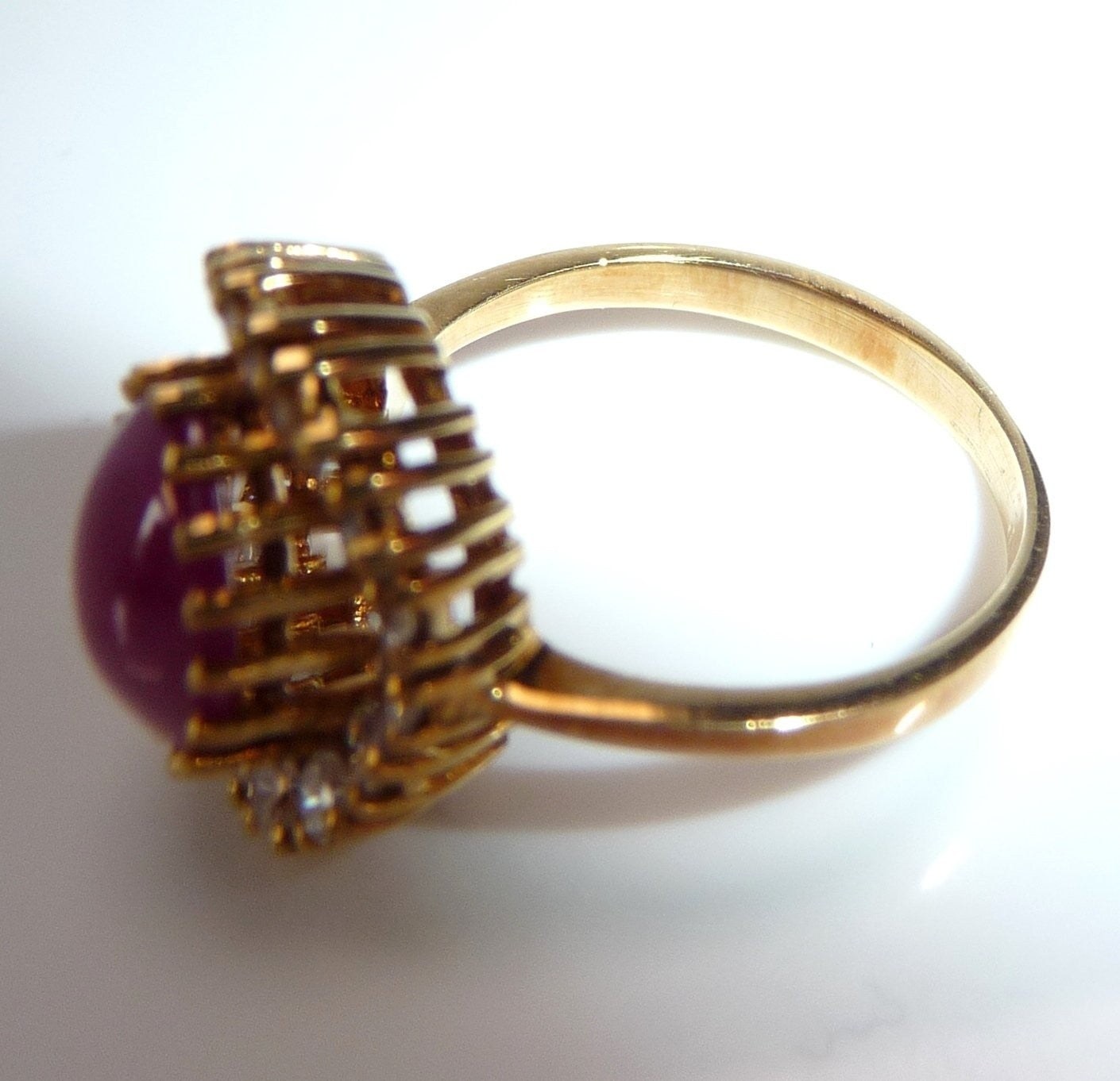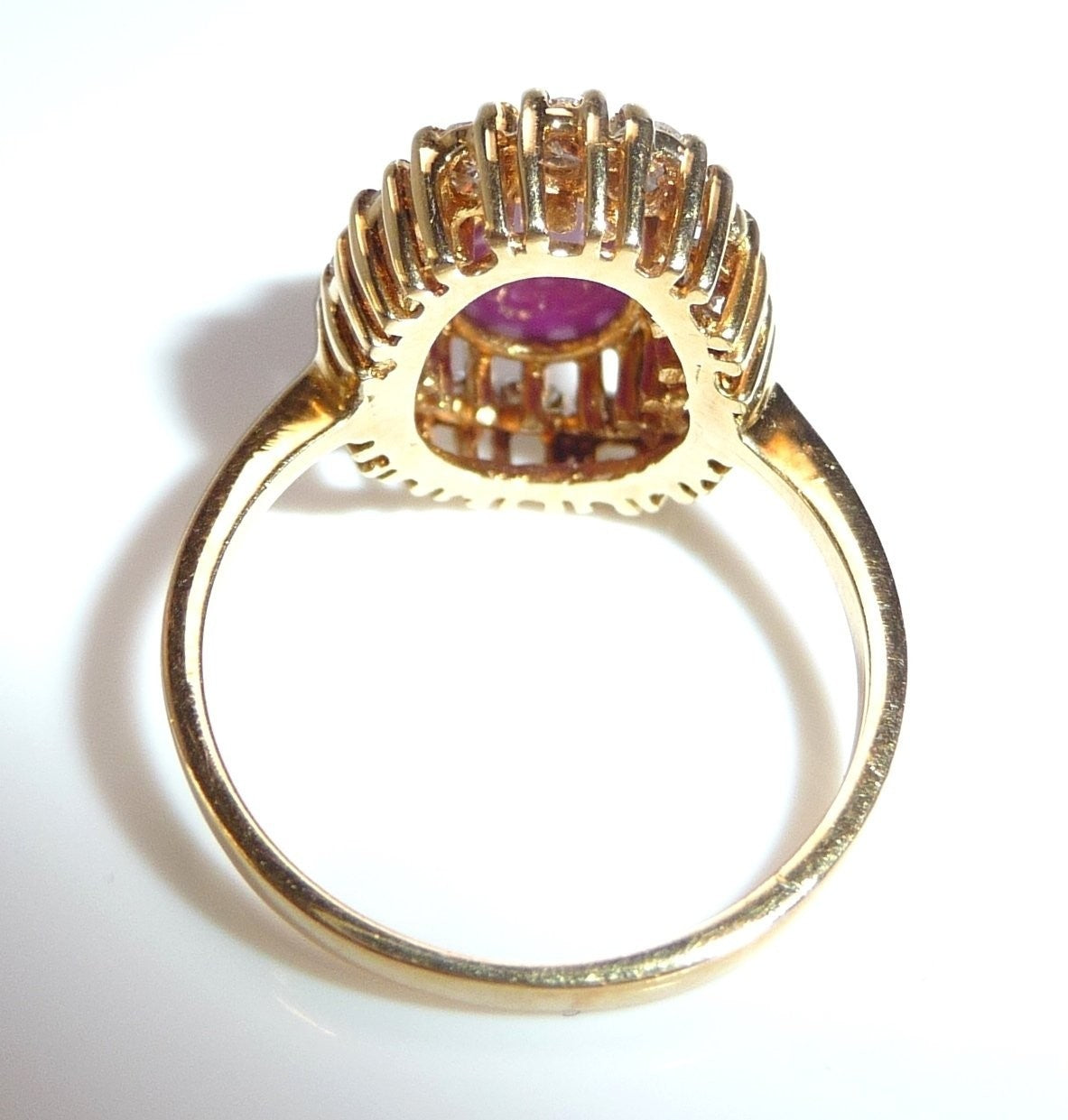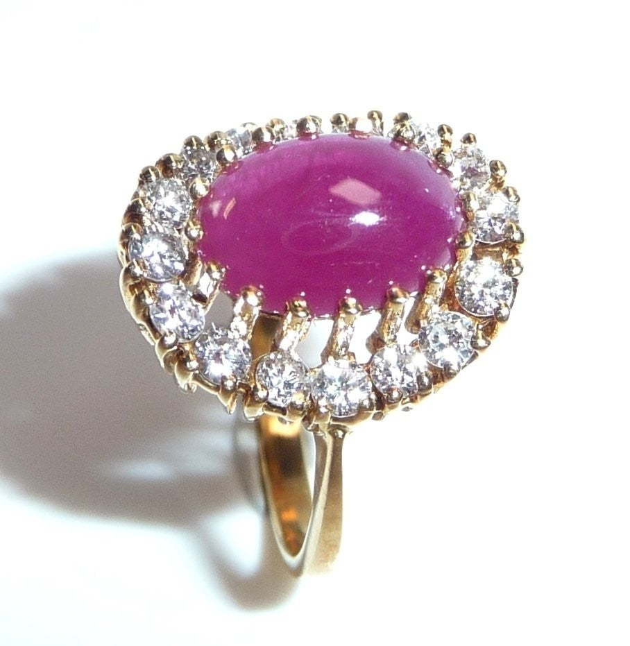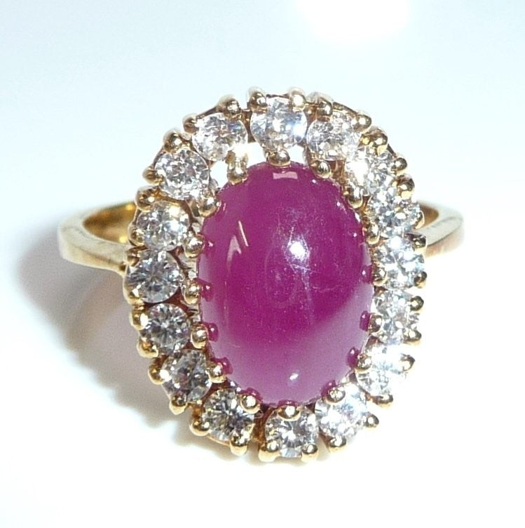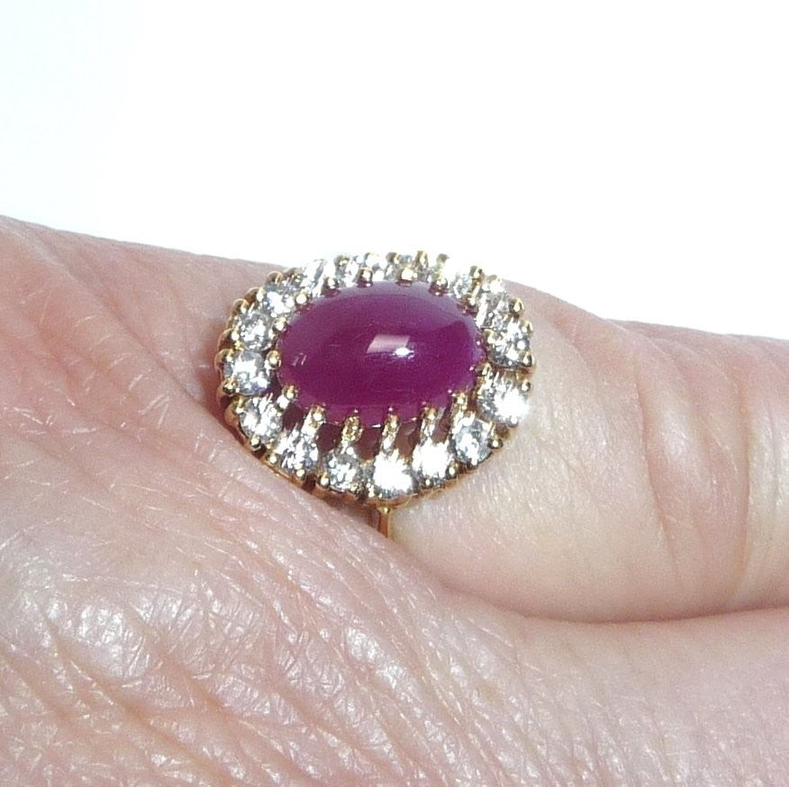Ring in 750 Gelbgold. Der Ring hat ein klassisches Design mit einem ovalen Ringkopf. Im Zentrum ist ein intensiv roter Rubin im Cabochonschliff von 2.80 ct. Der Rubin ist opak und hat die Maße 10,5 x 7,6 x 3,5 mm. Der Rubin-Cabochon wird von zahlreichen Stotzen/Krappen gehalten. Auf einer tieferen Ebene wird der Rubin von 16 Diamanten im Brillantschliff umrundet. Außergewöhnlich ist, dass dieser Diamant-Kranz zur Mitte hin eine konkave Linie hat. Das macht den Ring sehr außergewöhnlich im Design.