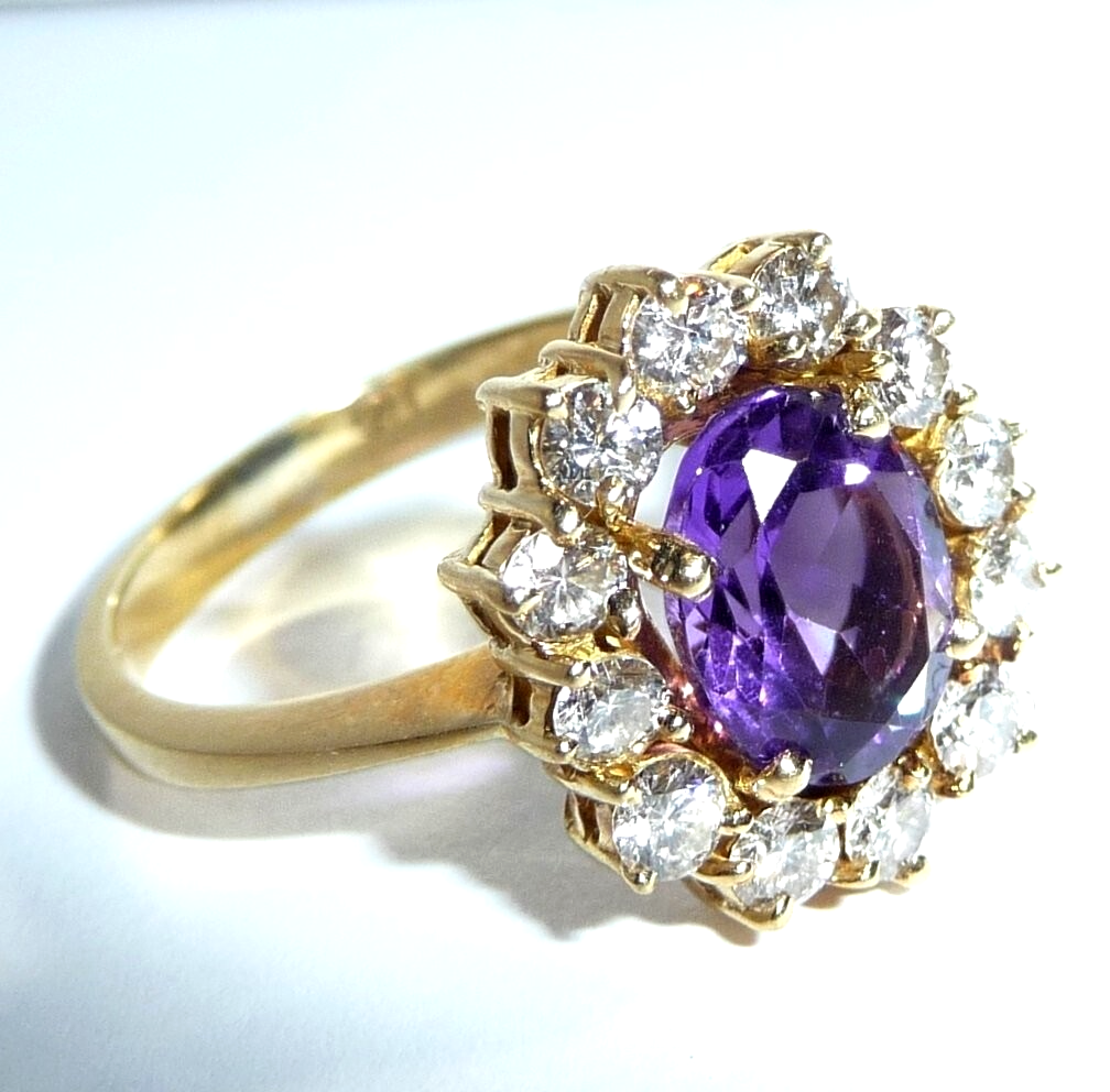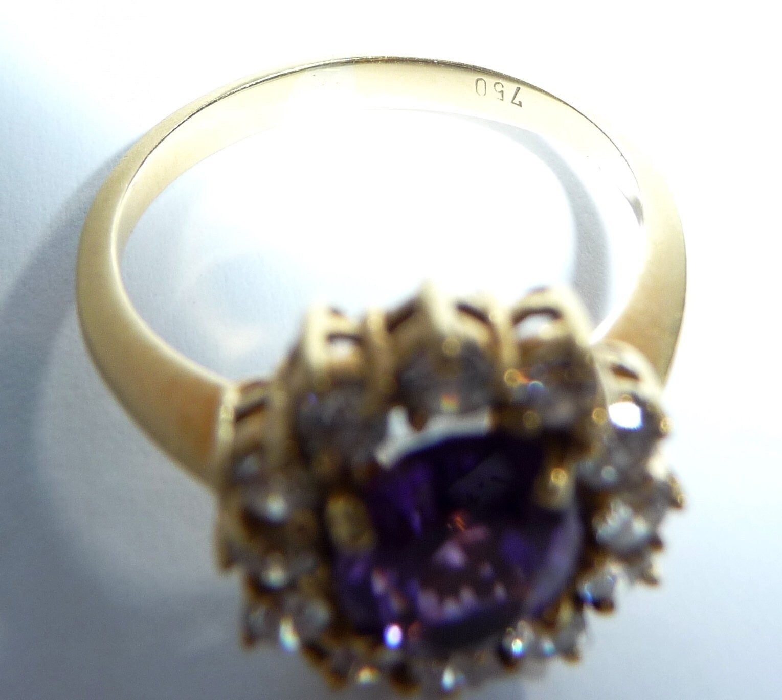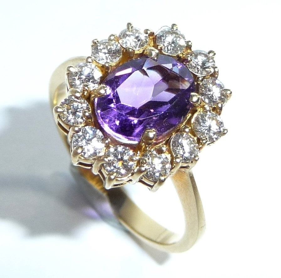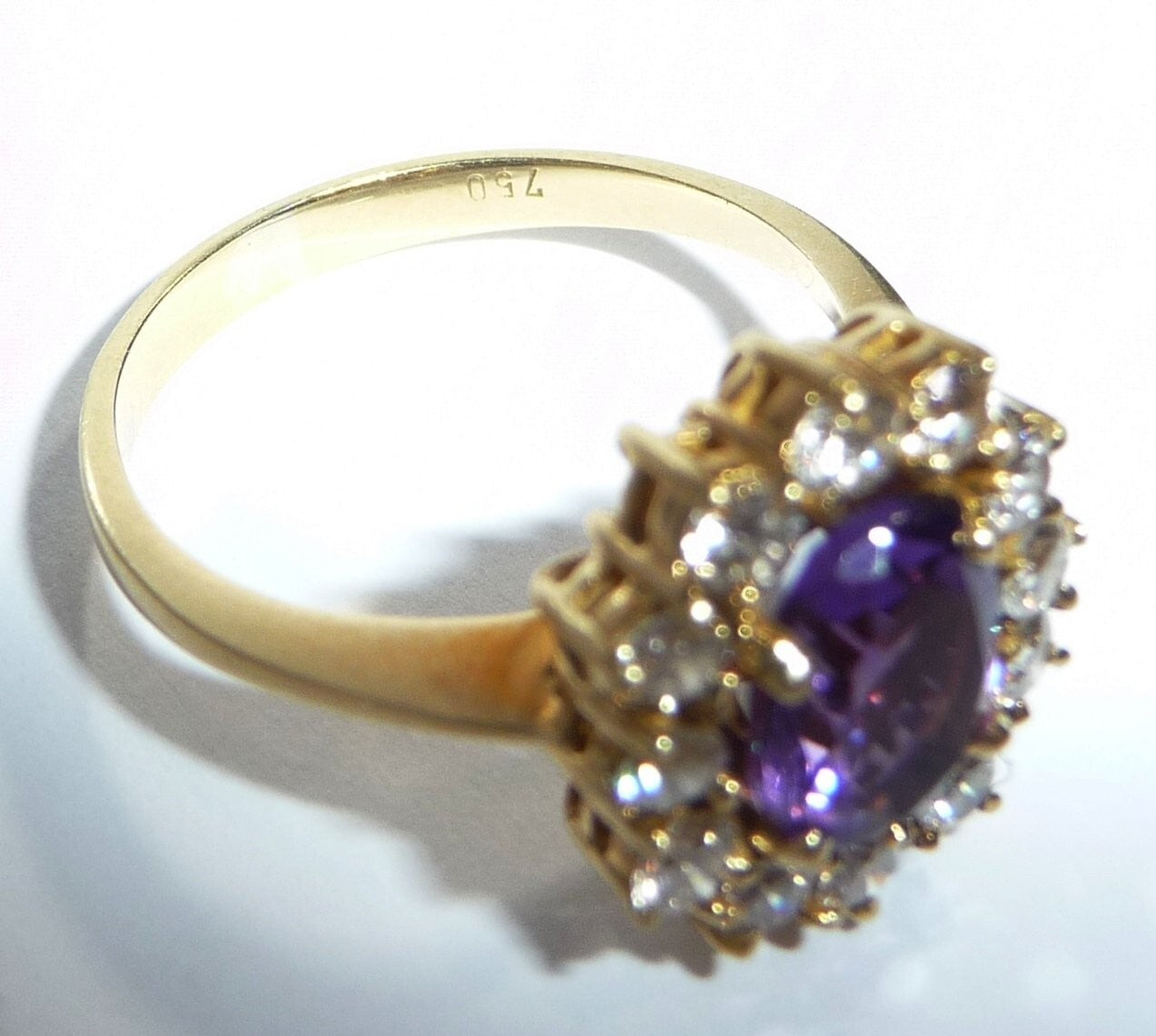 Ring in 18 K / 750 Gelbgold. Der Ring hat ein klassisches Design. Im Zentrum ist ein augenreiner Amethyst von 1.40 ct.. Der ovale, facettierte Amethyst wird umrundet von 12 Diamanten im Brillantschliff von total 0.96 ct. (12 x 0.08 ct.). Die Diamanten sind von hervorragender Qualität mit Farbe F und Reinheit VVS. Der sehr gute Brillantschliff trägt zu dem enormen Feuer der Diamanten bei.