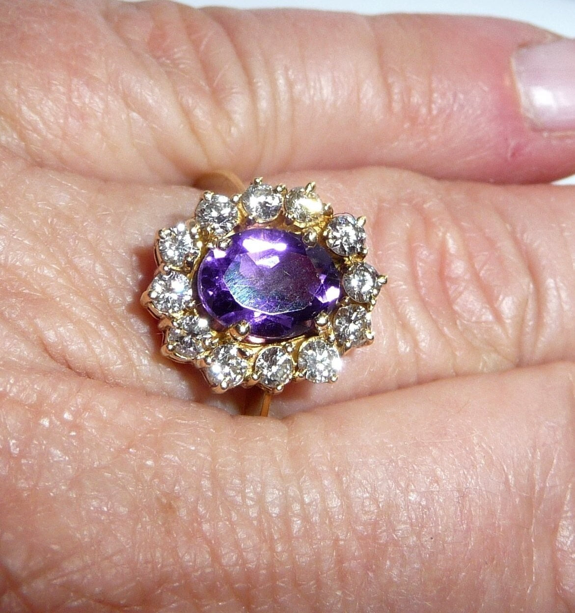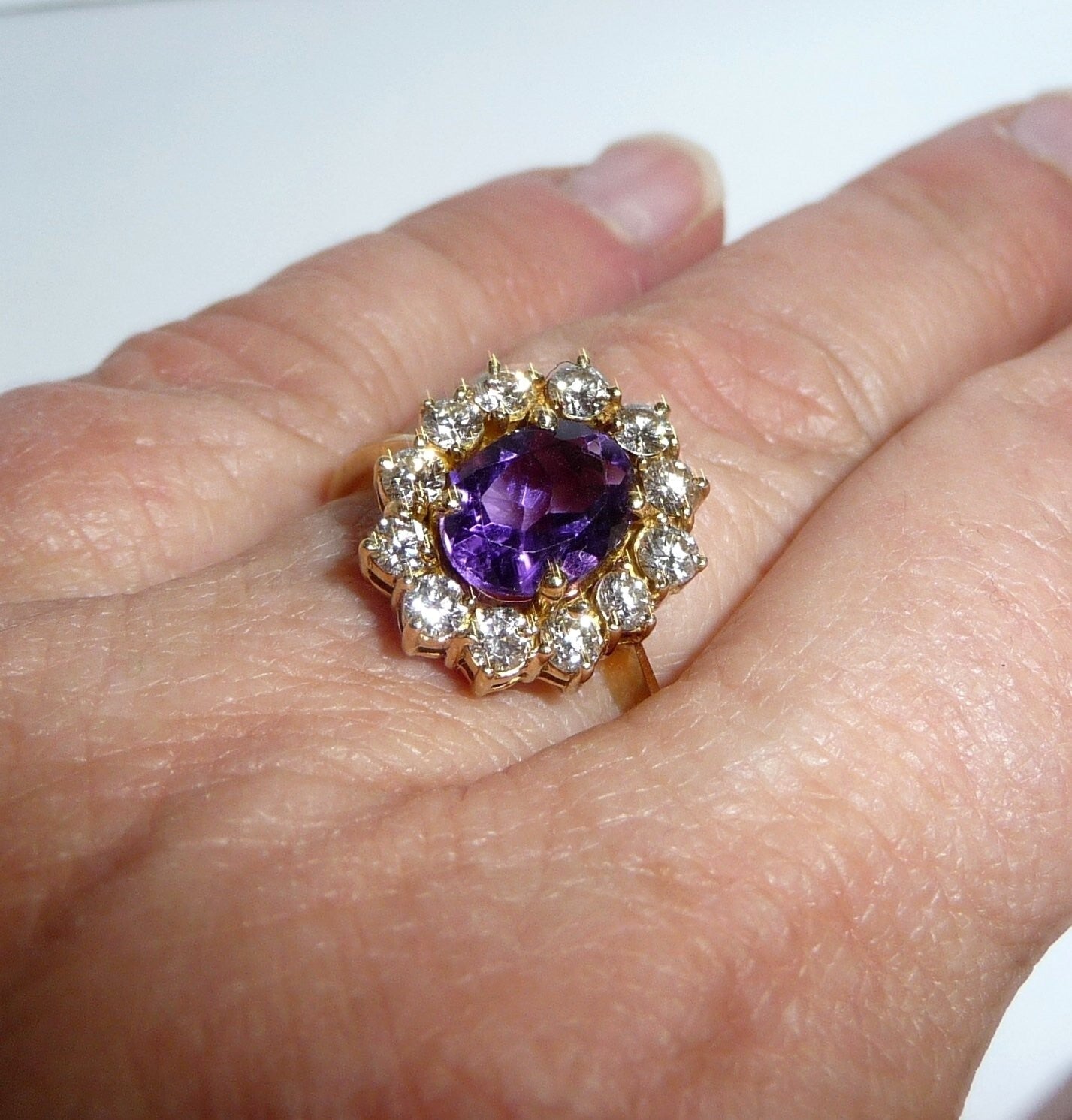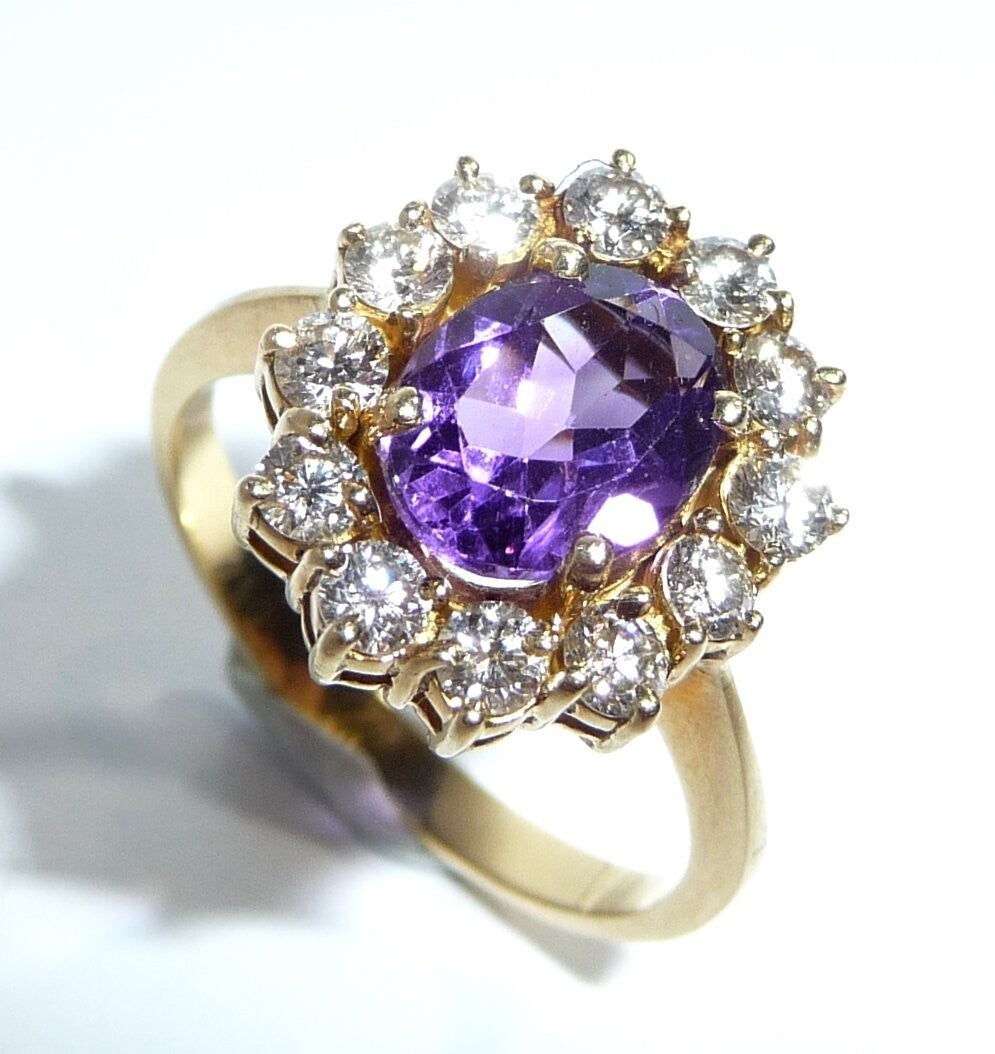 Ring in 18 K / 750 Gelbgold. Der Ring hat ein klassisches Design. Im Zentrum ist ein augenreiner Amethyst von 1.40 ct.. Der ovale, facettierte Amethyst wird umrundet von 12 Diamanten im Brillantschliff von total 0.96 ct. (12 x 0.08 ct.). Die Diamanten sind von hervorragender Qualität mit Farbe F und Reinheit VVS. Der sehr gute Brillantschliff trägt zu dem enormen Feuer der Diamanten bei.