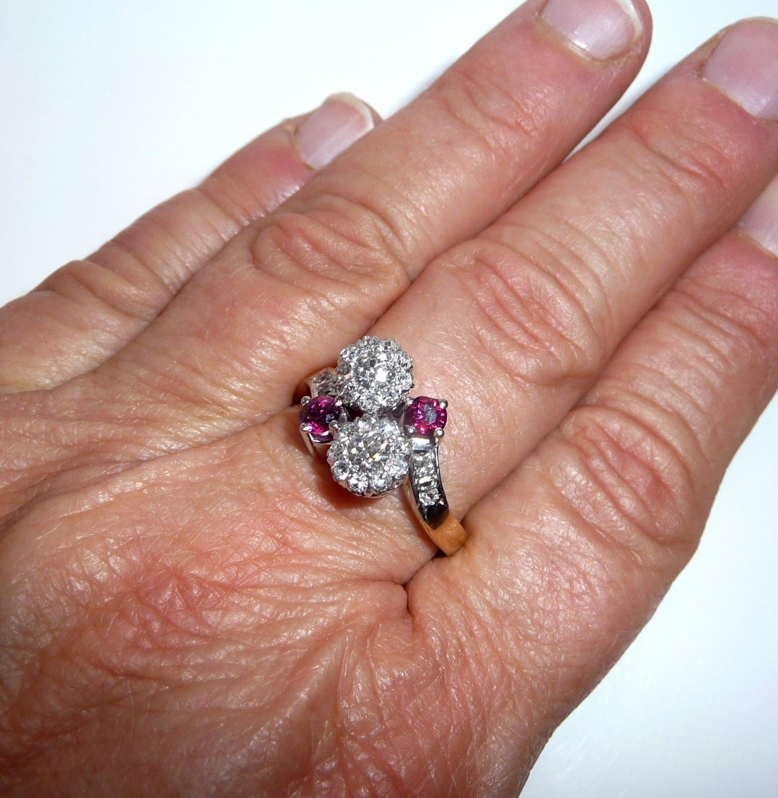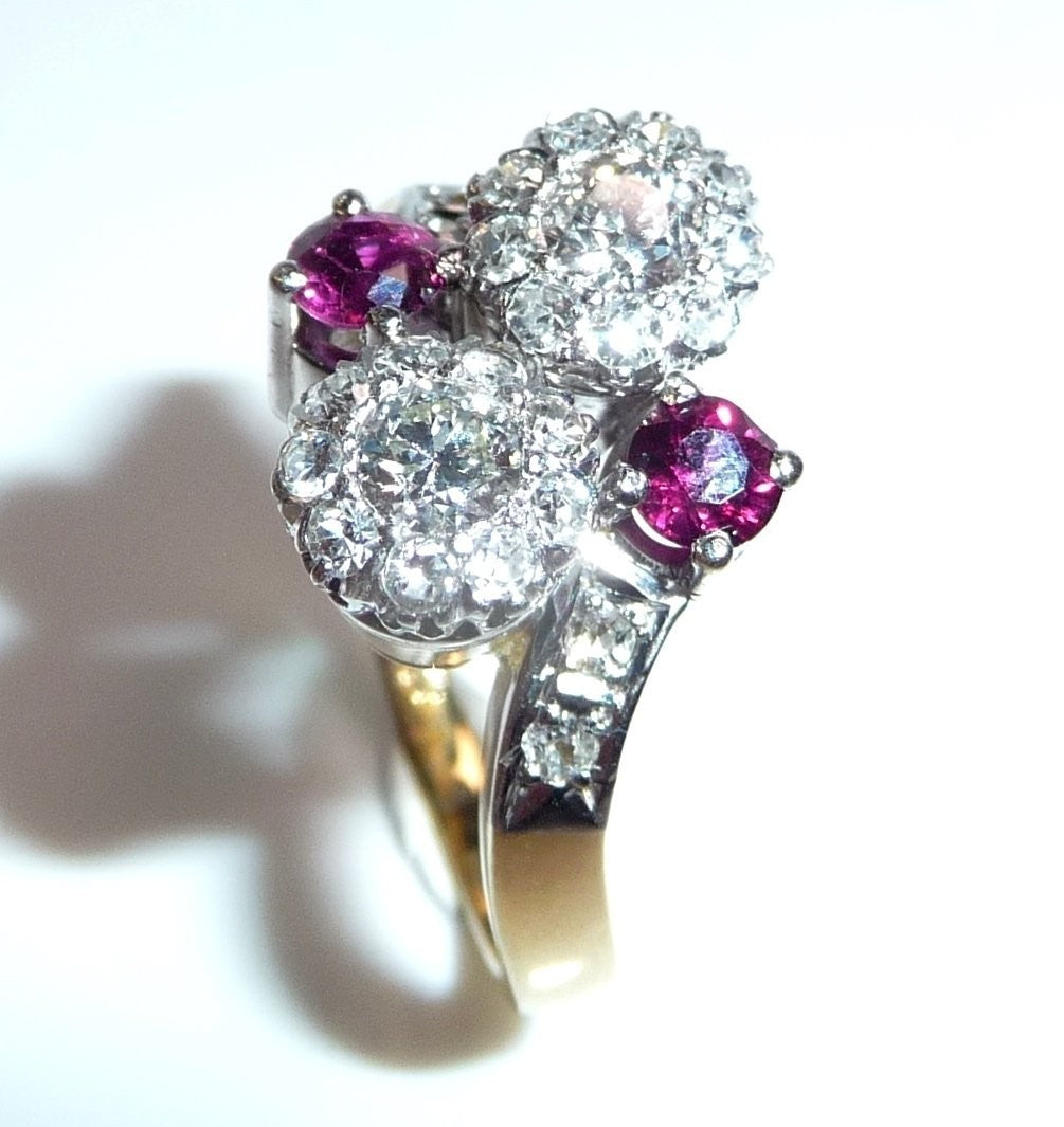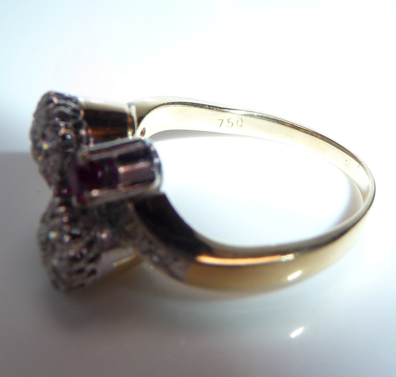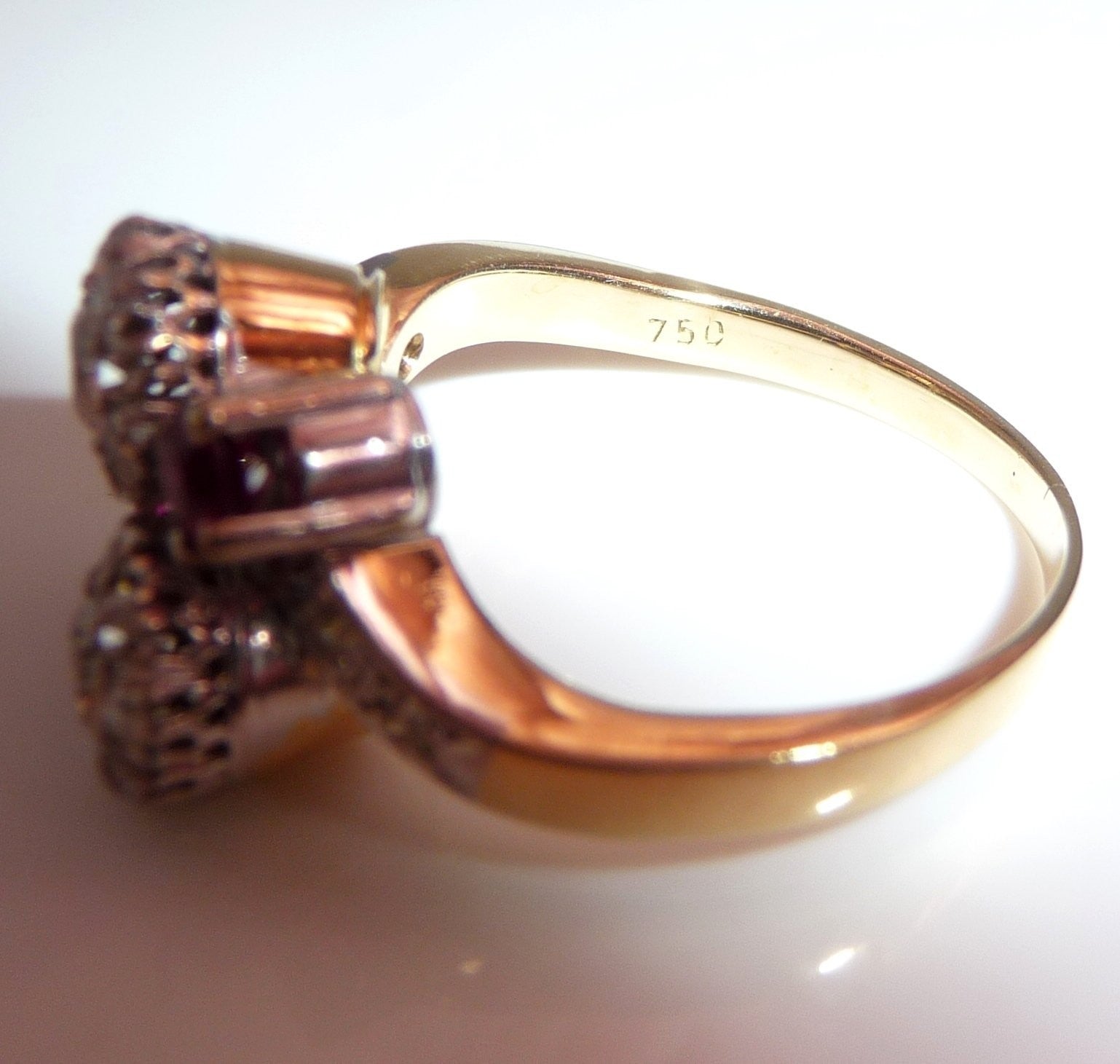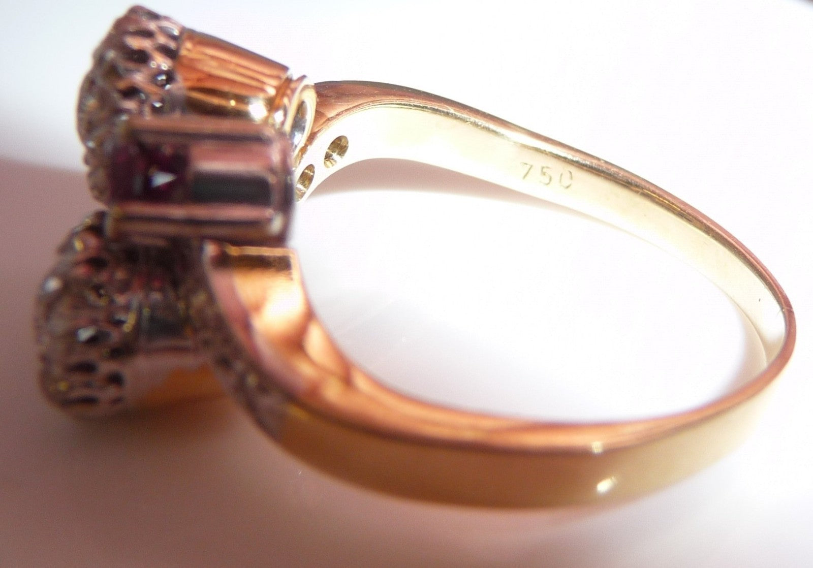 Ring in 750 / 18 K Gelbgold mit Weißgold (oder Platin) im Bereich der Diamant-Fassungen. Der Ringkopf ist sehr aufwendig gearbeitet und ähnelt einem Toi et Moi Ring. Zwei Diamant-Blüten begegnen sich in der Mitte und laufen diagonal aneinander vorbei. Jede Blüte oder Rosette ist besetzt mit einem großen zentralen Diamanten von 0.25 ct. und 8 Diamanten im Achtkantschliff, die den zentralen Diamanten umrunden. Vier weitere Diamanten zieren noch die Ringschulterm und leiten zur Ringschiene über.
