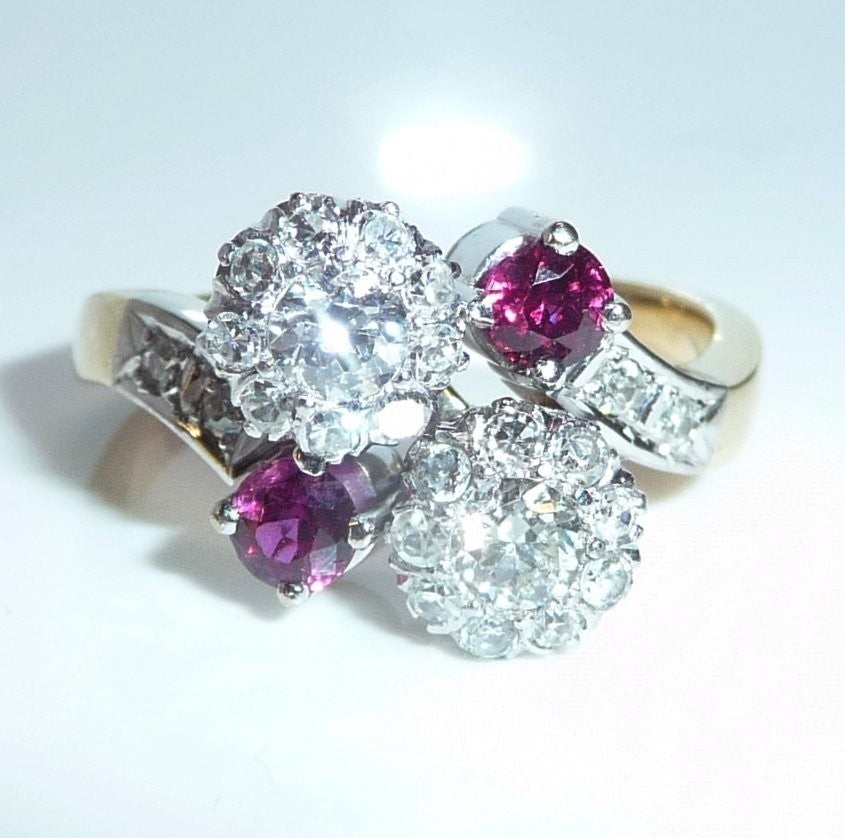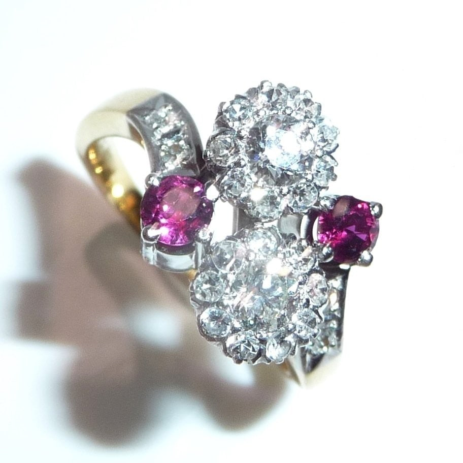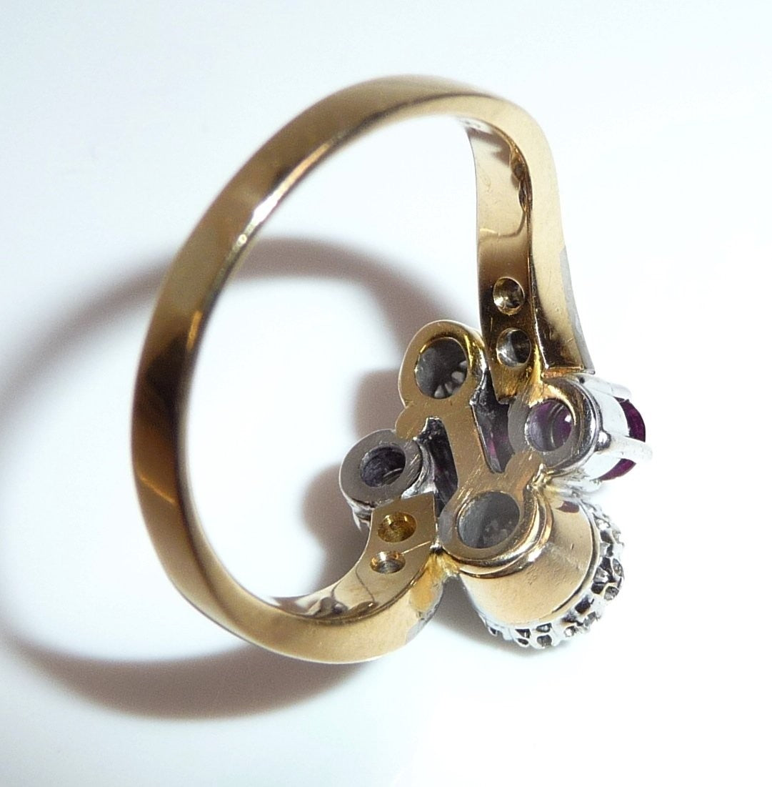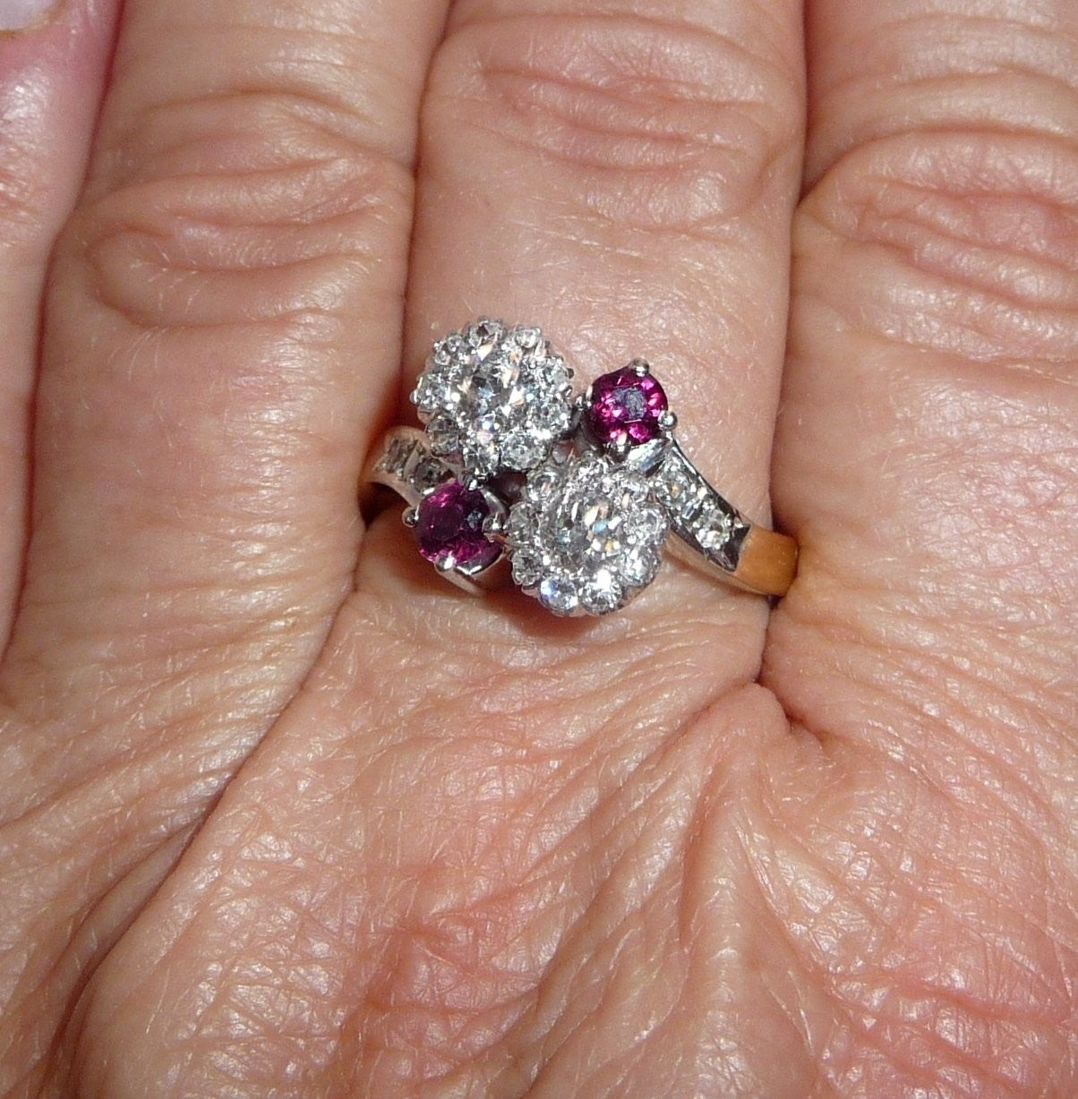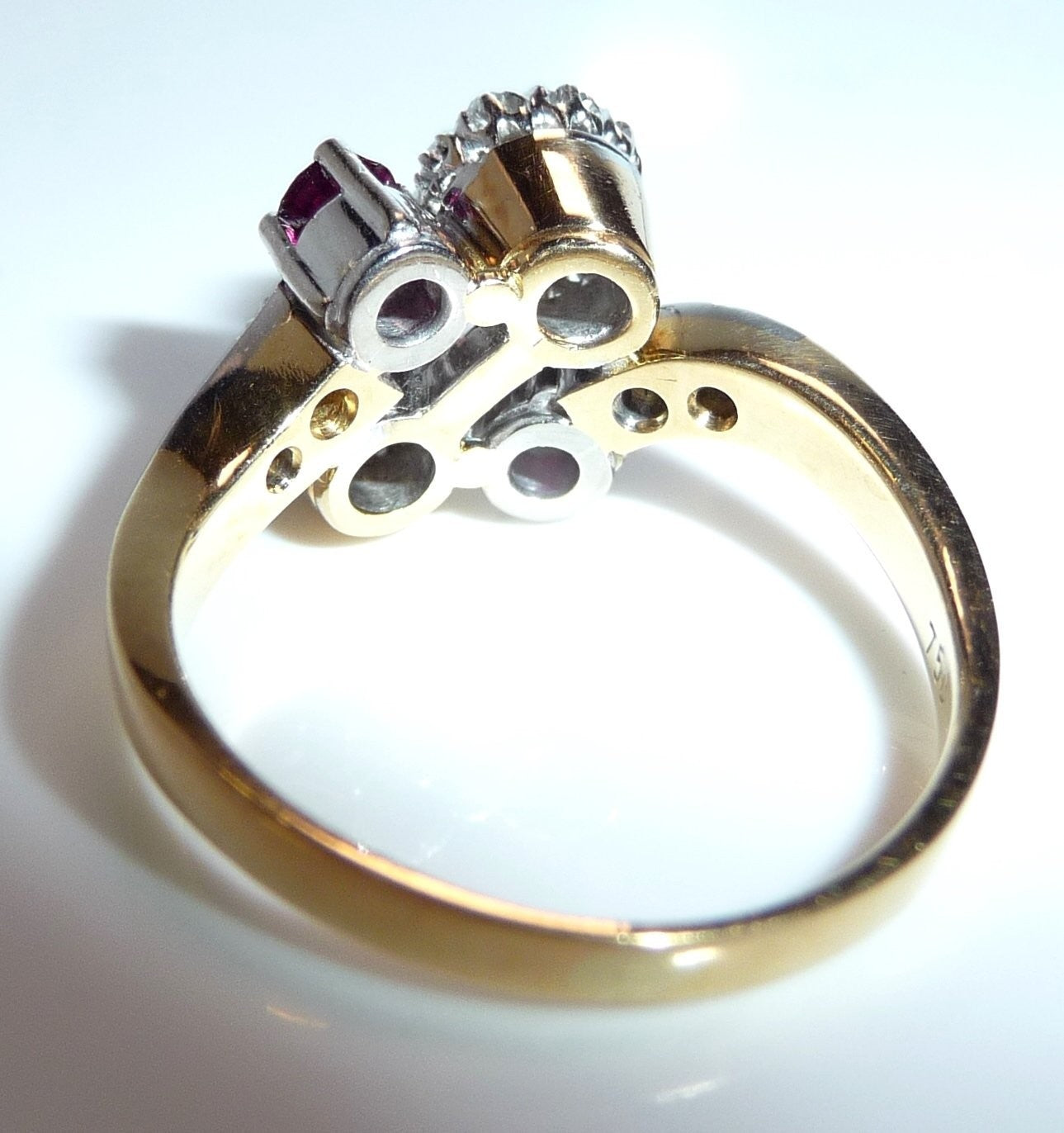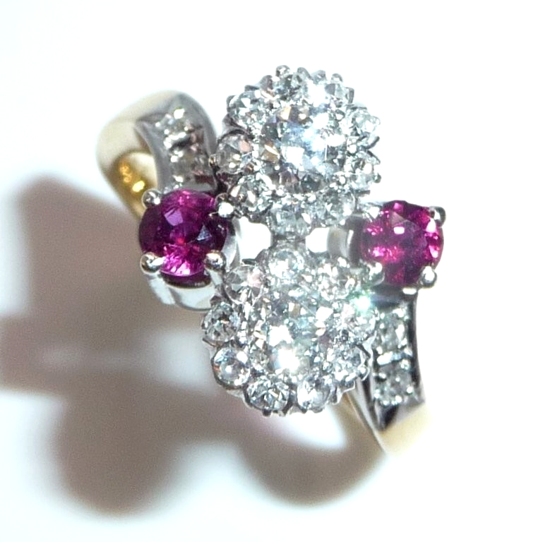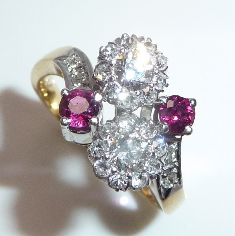 Ring in 750 / 18 K Gelbgold mit Weißgold (oder Platin) im Bereich der Diamant-Fassungen. Der Ringkopf ist sehr aufwendig gearbeitet und ähnelt einem Toi et Moi Ring. Zwei Diamant-Blüten begegnen sich in der Mitte und laufen diagonal aneinander vorbei. Jede Blüte oder Rosette ist besetzt mit einem großen zentralen Diamanten von 0.25 ct. und 8 Diamanten im Achtkantschliff, die den zentralen Diamanten umrunden. Vier weitere Diamanten zieren noch die Ringschulterm und leiten zur Ringschiene über.