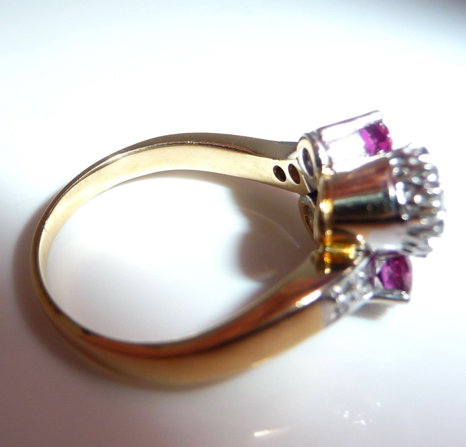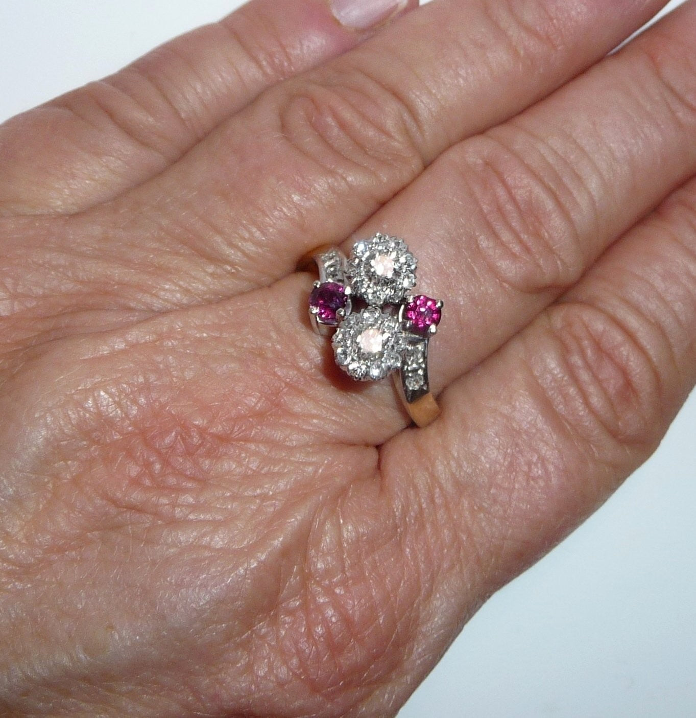 Diagonal kontrastieren 2 Rubine von total 0.40 ct. (3,8 mm) die leuchtende Brillanz der Diamant-Rosetten.