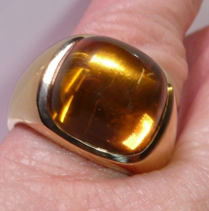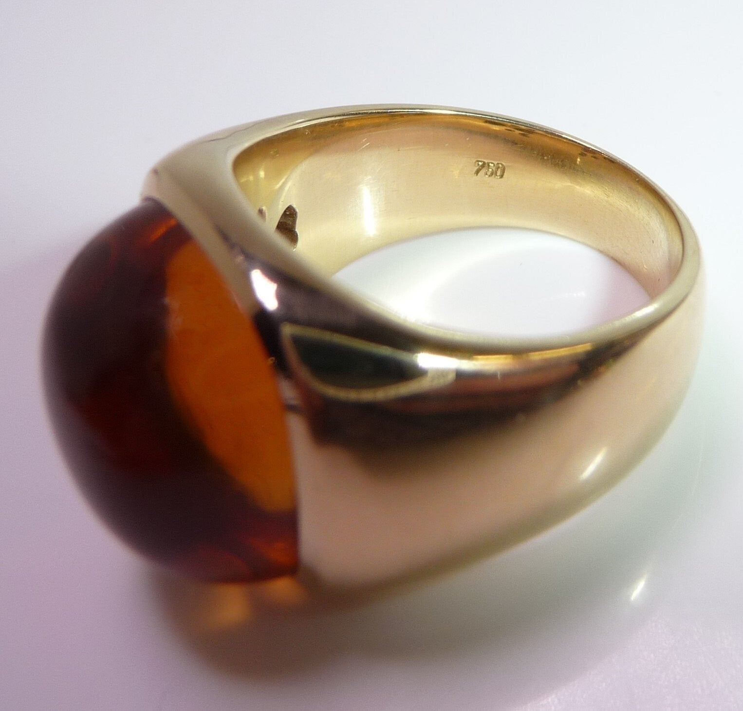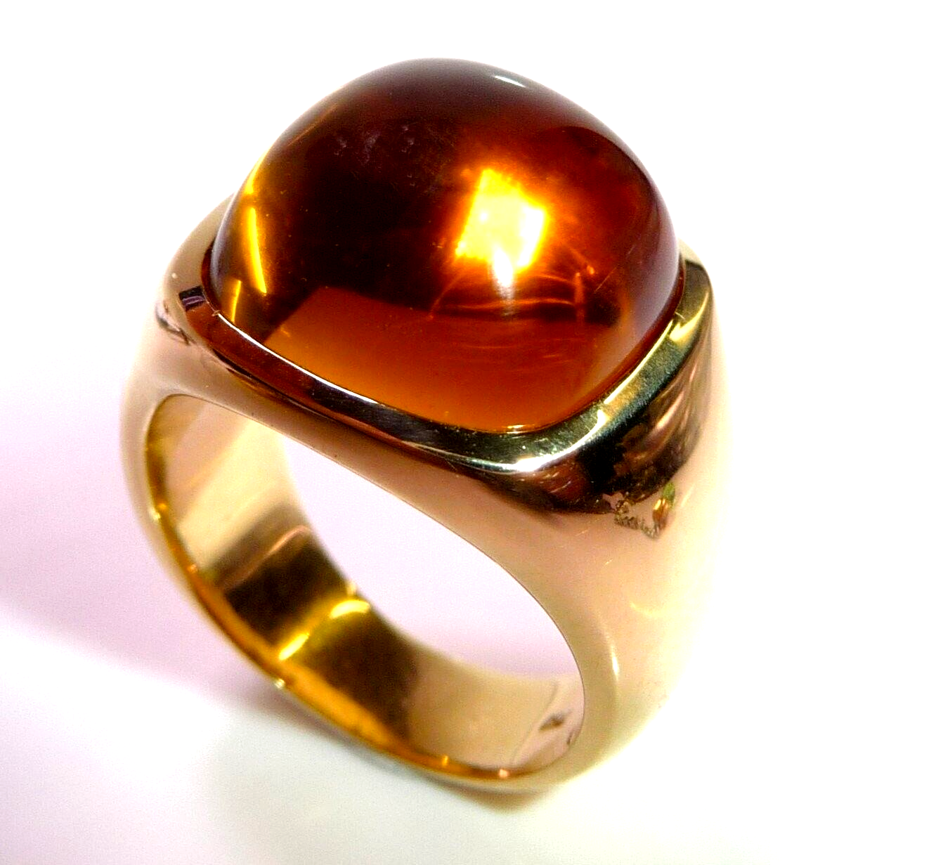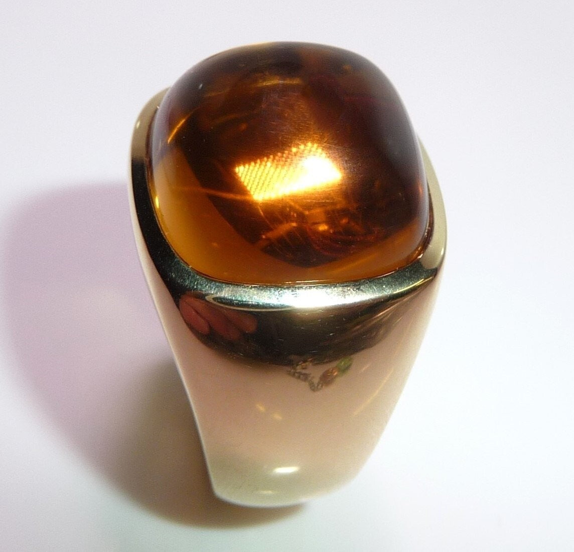 Massiver Ring in 18 K / 750 Gelbgold. Der große Ringkopf geht harmonisch direkt aus der Ringschiene hervor. Weiche, abgerundete Linien bestimmen das Design. Eingefasst ist ein honiggelber Madeira-Citrin von ca. 10.00 ct.. Der Citrin ist im Kissenschliff-Cabochon geschliffen und türmt sich zu einer sanften Wölbung auf. Der glatt polierte Schliff unterstreicht den warmen honiggelben Farbton des Citrins und fängt bei Bewegung viele Lichtspiegelungen auf.