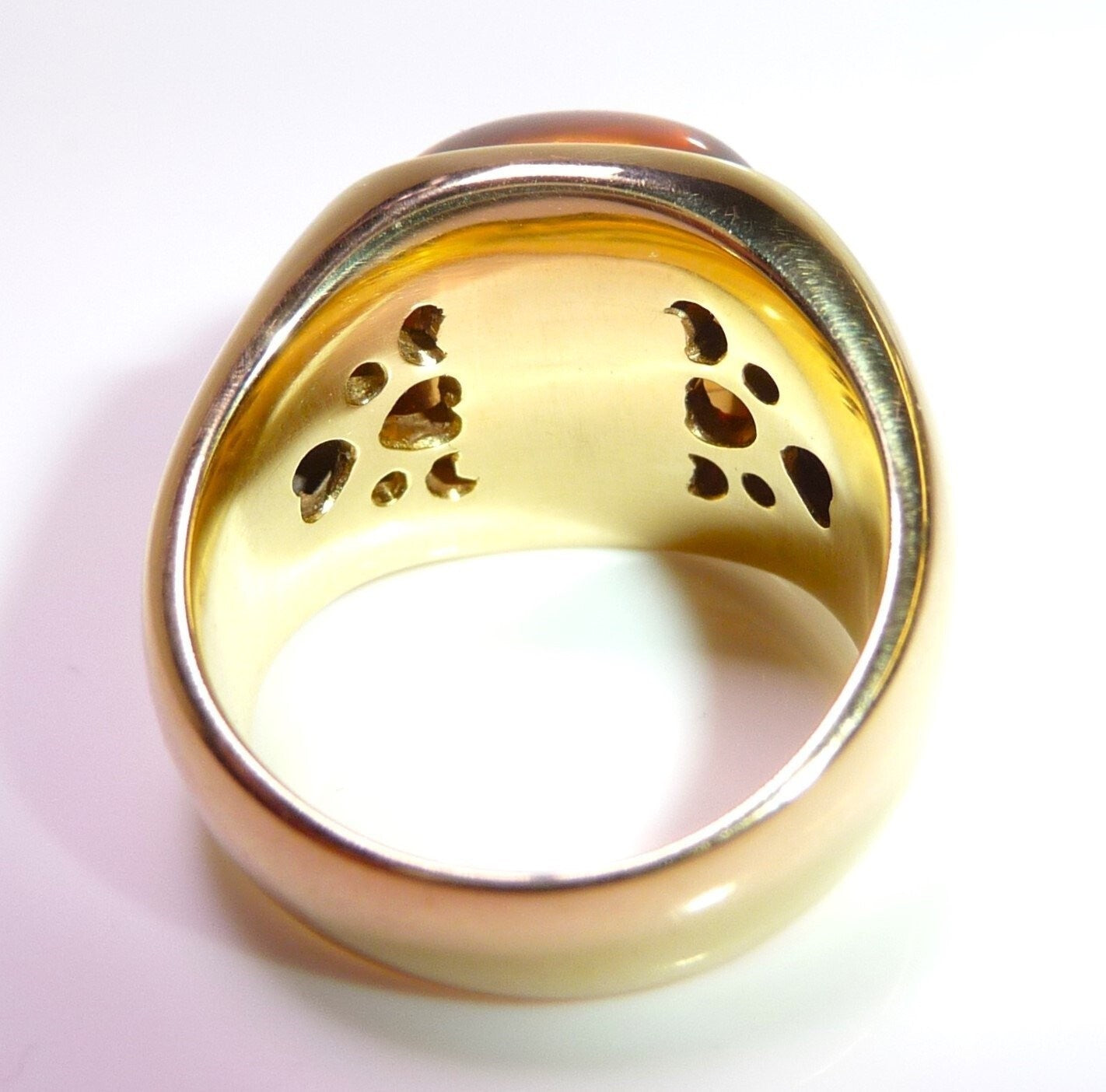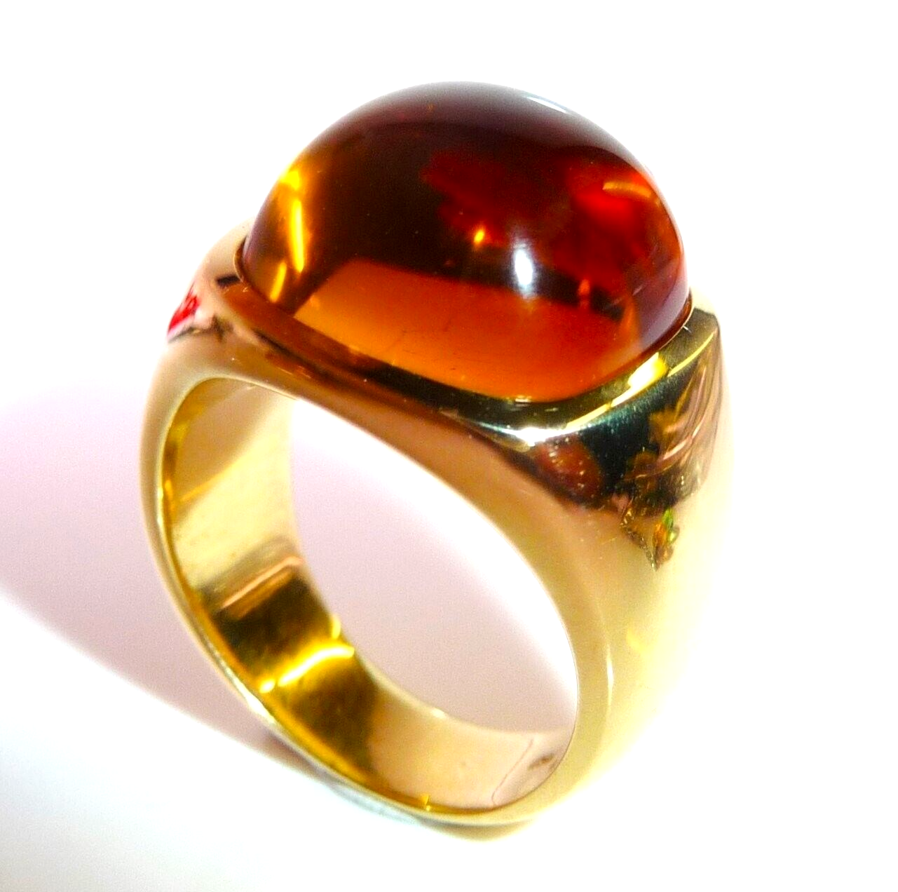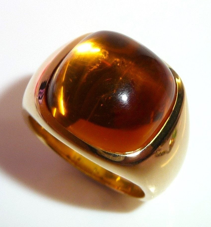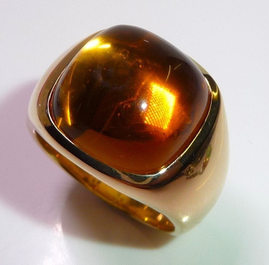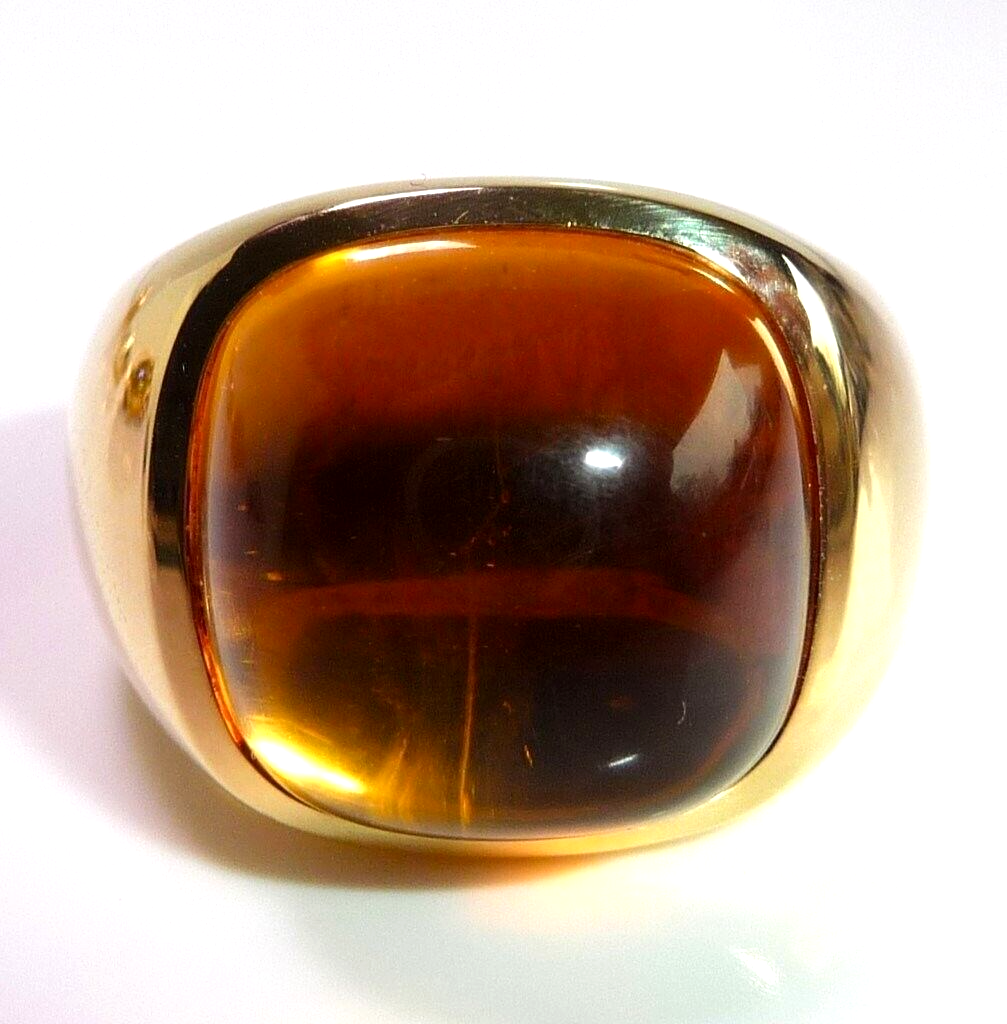 Massiver Ring in 18 K / 750 Gelbgold. Der große Ringkopf geht harmonisch direkt aus der Ringschiene hervor. Weiche, abgerundete Linien bestimmen das Design. Eingefasst ist ein honiggelber Madeira-Citrin von ca. 10.00 ct.. Der Citrin ist im Kissenschliff-Cabochon geschliffen und türmt sich zu einer sanften Wölbung auf. Der glatt polierte Schliff unterstreicht den warmen honiggelben Farbton des Citrins und fängt bei Bewegung viele Lichtspiegelungen auf.