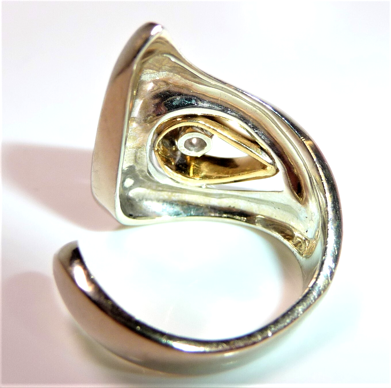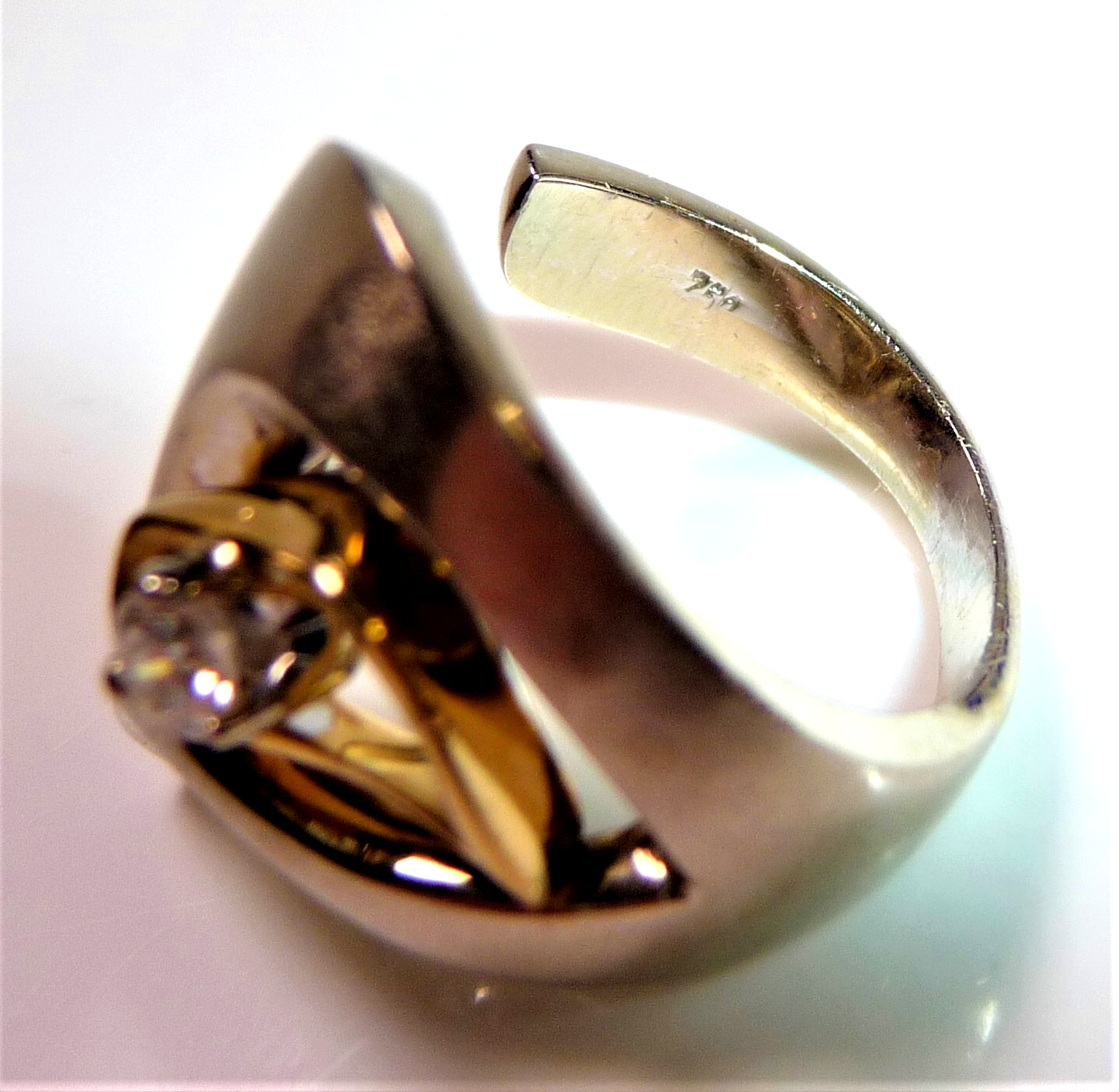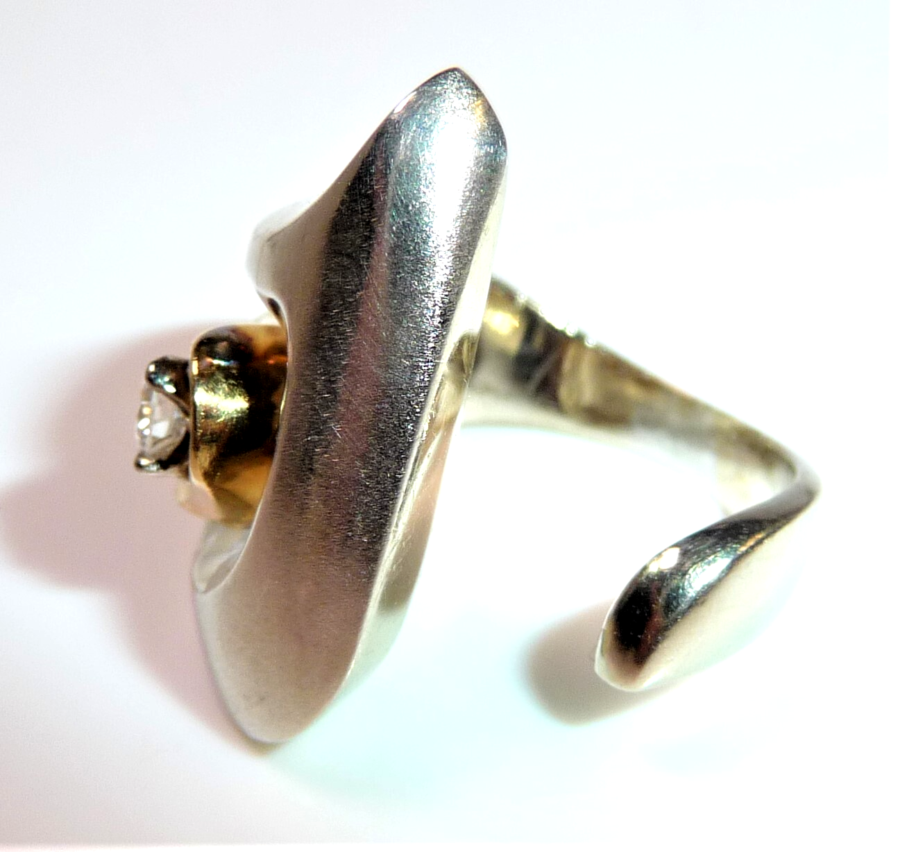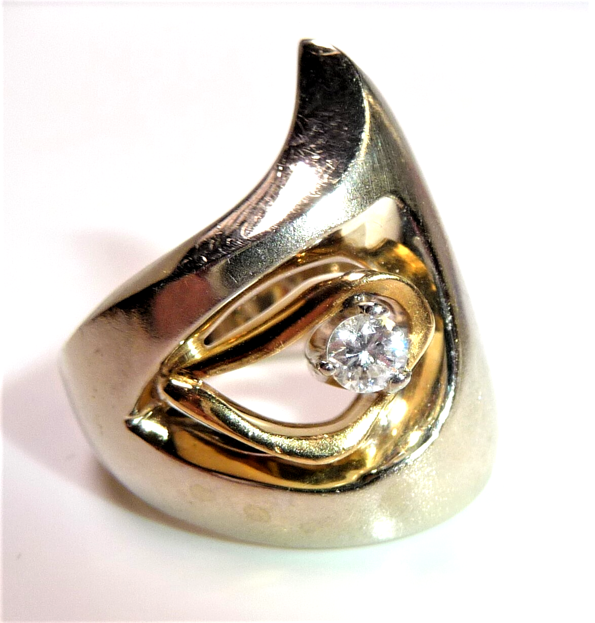 Ring in 750 / 18 K Weißgold mit Gelbgold. Der Ring hat ein kreatives Design und ist von Hand gefertigt. Das Weißgold hat eine mattierte Oberfläche. Die Form des Ringkopfes ist asymetrisch und der Ringkopf ist aus einer Einheit geformt mit der Ringschiene. Im Zentrum ist ein Hohlraum. Dort ist eine Gelbgold-Schlinge, die einen Diamanten im Brillantschliff einschließt. Der Diamant hat etwa 0.15 ct. mit 3,4 mm Durchmesser und 2,2 mm Tiefe. (G-F/VS).