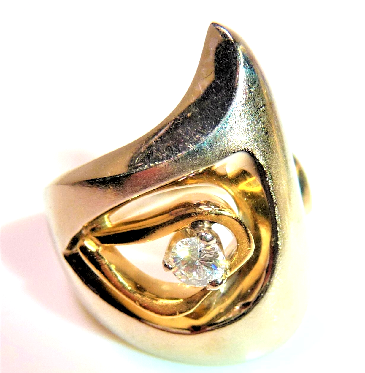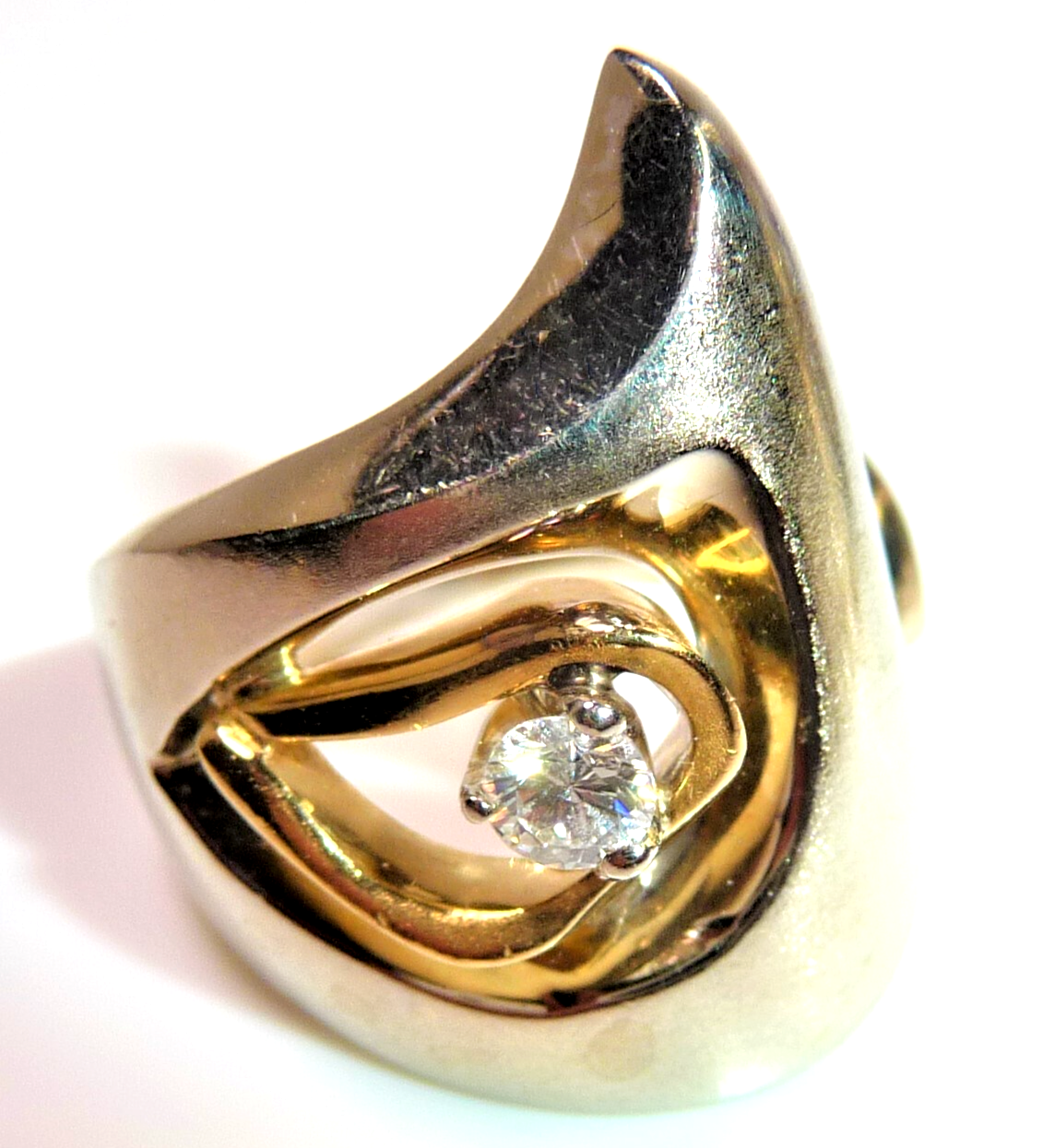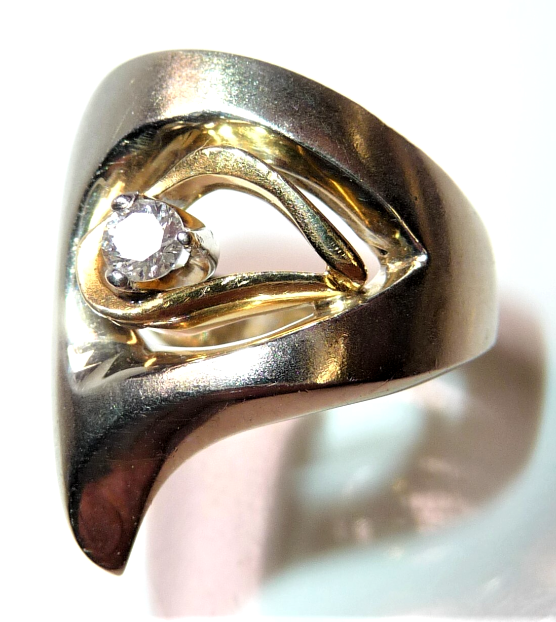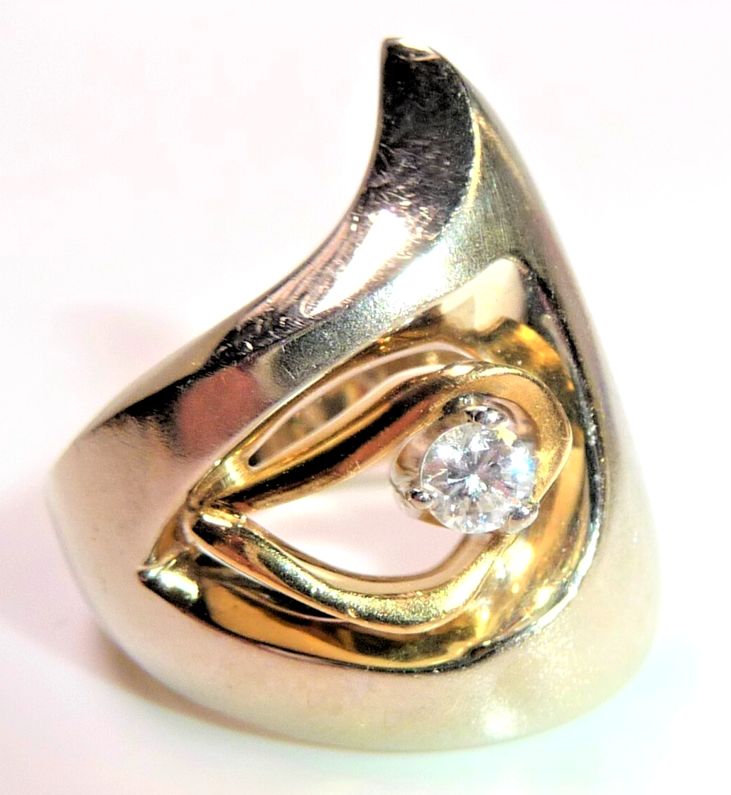 Ring in 750 / 18 K Weißgold mit Gelbgold. Der Ring hat ein kreatives Design und ist von Hand gefertigt. Das Weißgold hat eine mattierte Oberfläche. Die Form des Ringkopfes ist asymetrisch und der Ringkopf ist aus einer Einheit geformt mit der Ringschiene. Im Zentrum ist ein Hohlraum. Dort ist eine Gelbgold-Schlinge, die einen Diamanten im Brillantschliff einschließt. Der Diamant hat etwa 0.15 ct. mit 3,4 mm Durchmesser und 2,2 mm Tiefe. (G-F/VS).