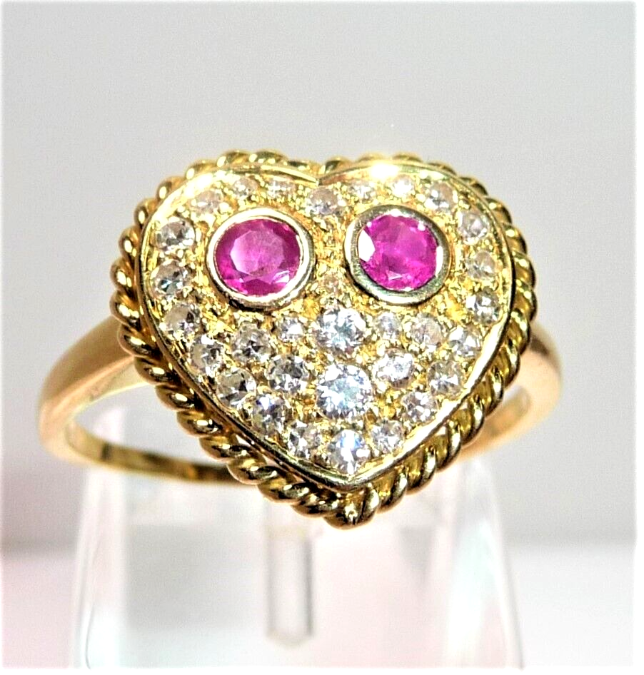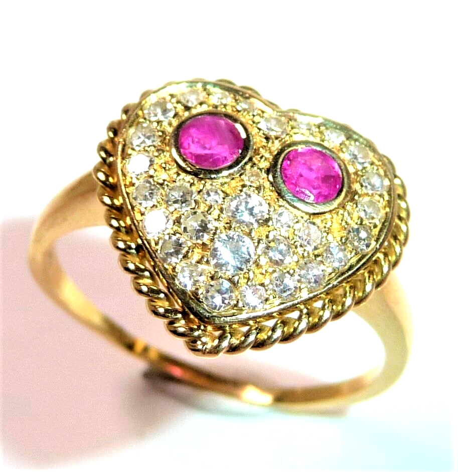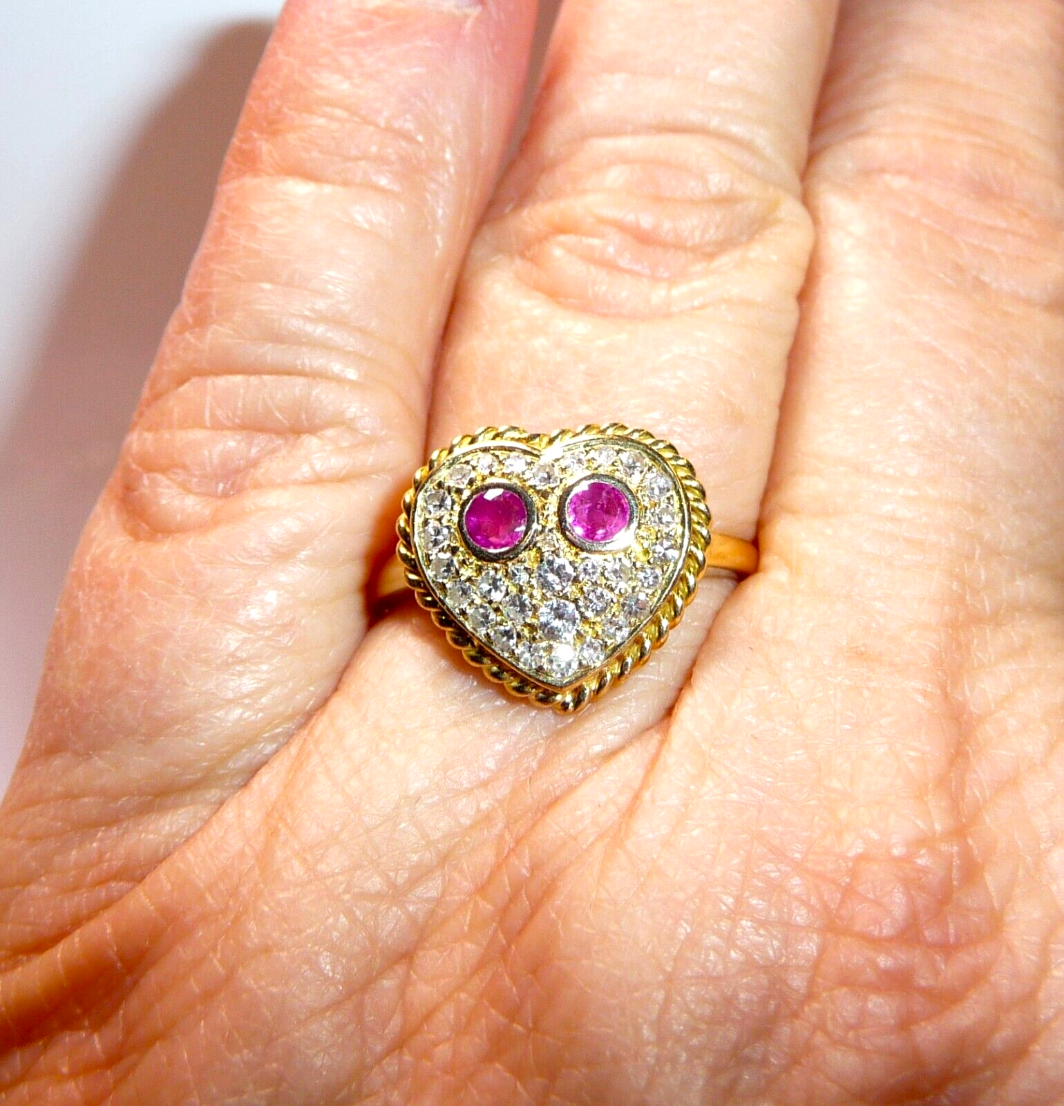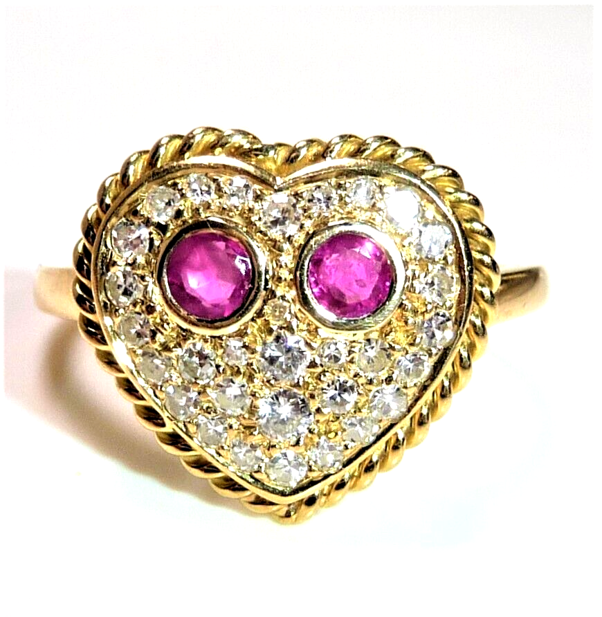 Ring in 18 K / 750 Gelbgold. Der Ringkopf ist als Herz gestaltet mit 2 blutroten Rubinen von 0.20 ct.. Die übrigen Fläche es Herzens ist besetzt mit insgesamt 31 Diamanten. Davon sind 2 im Brillantschliff geschliffen. (0.03 ct. und 0.02 ct.). Die übrigen 29 Diamanten sind im Achtkantschliff und haben zwischen 0.015 und 0.02 ct.. Farbe F und Reinheit VS. Ein Kordeldraht rahmt das Herz rundum ein und zeugt von der Goldschmiede-Arbeit von Hand.