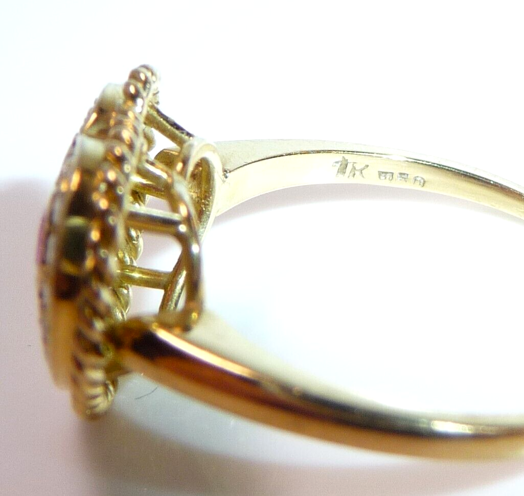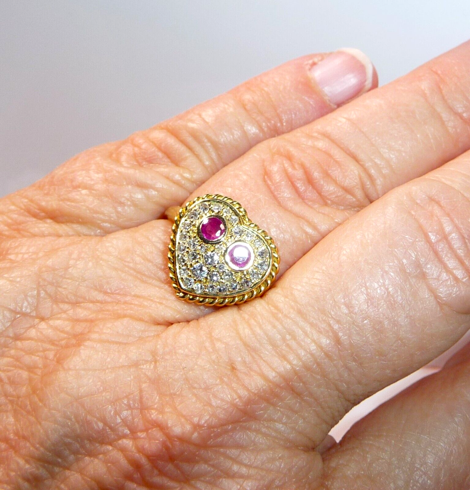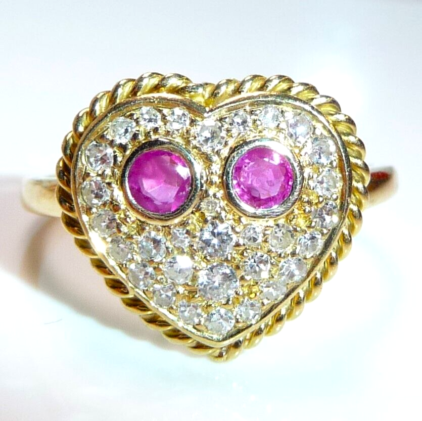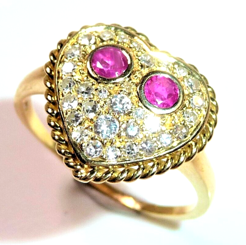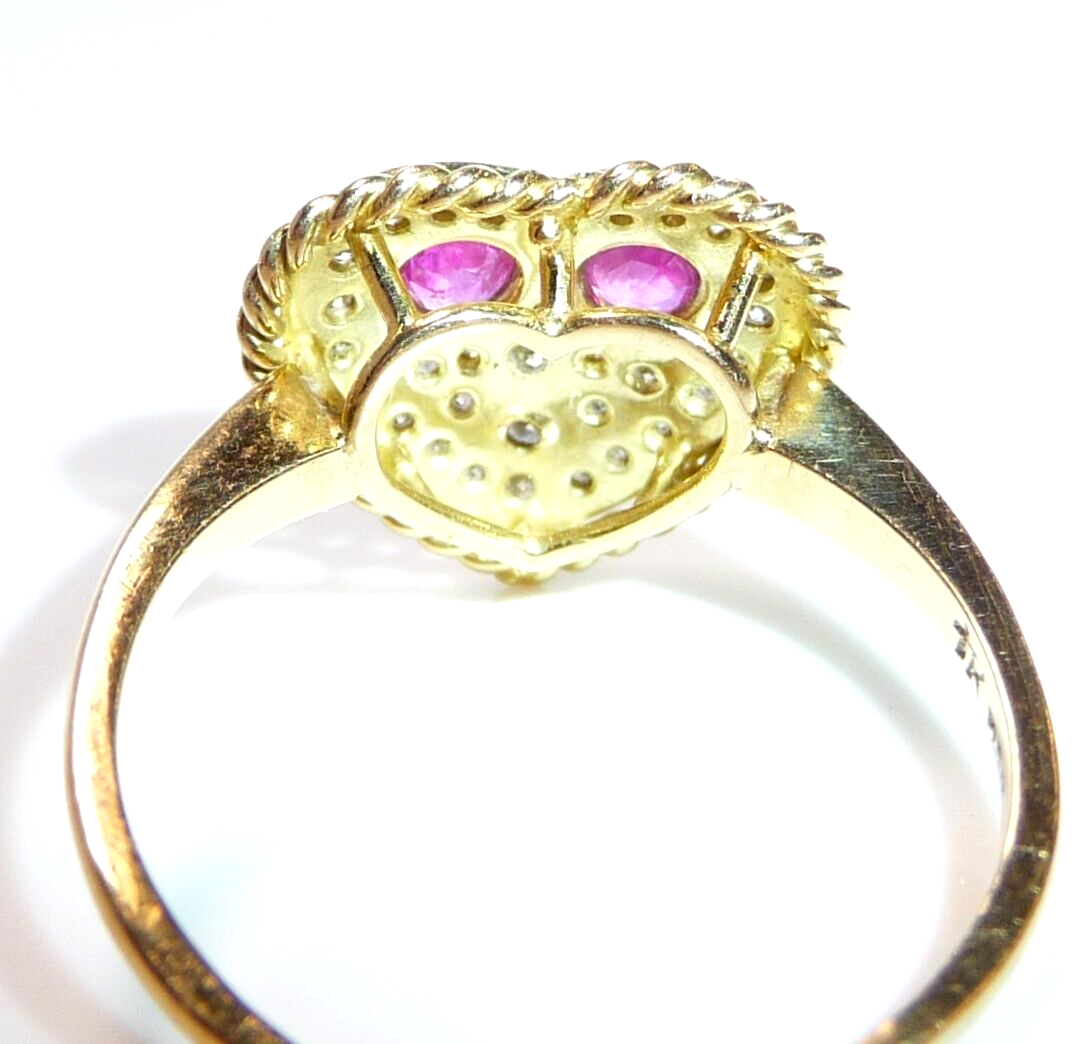 Ring in 18 K / 750 Gelbgold. Der Ringkopf ist als Herz gestaltet mit 2 blutroten Rubinen von 0.20 ct.. Die übrigen Fläche es Herzens ist besetzt mit insgesamt 31 Diamanten. Davon sind 2 im Brillantschliff geschliffen. (0.03 ct. und 0.02 ct.). Die übrigen 29 Diamanten sind im Achtkantschliff und haben zwischen 0.015 und 0.02 ct.. Farbe F und Reinheit VS. Ein Kordeldraht rahmt das Herz rundum ein und zeugt von der Goldschmiede-Arbeit von Hand.