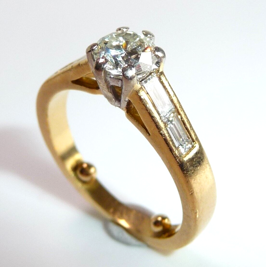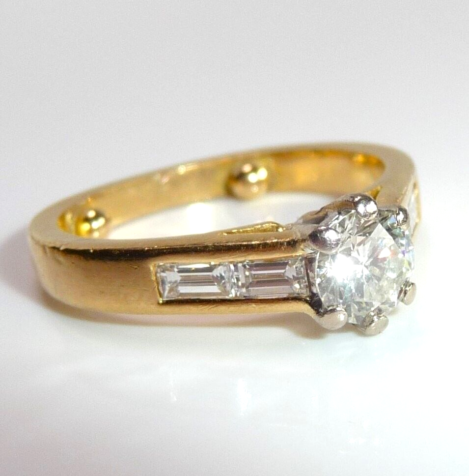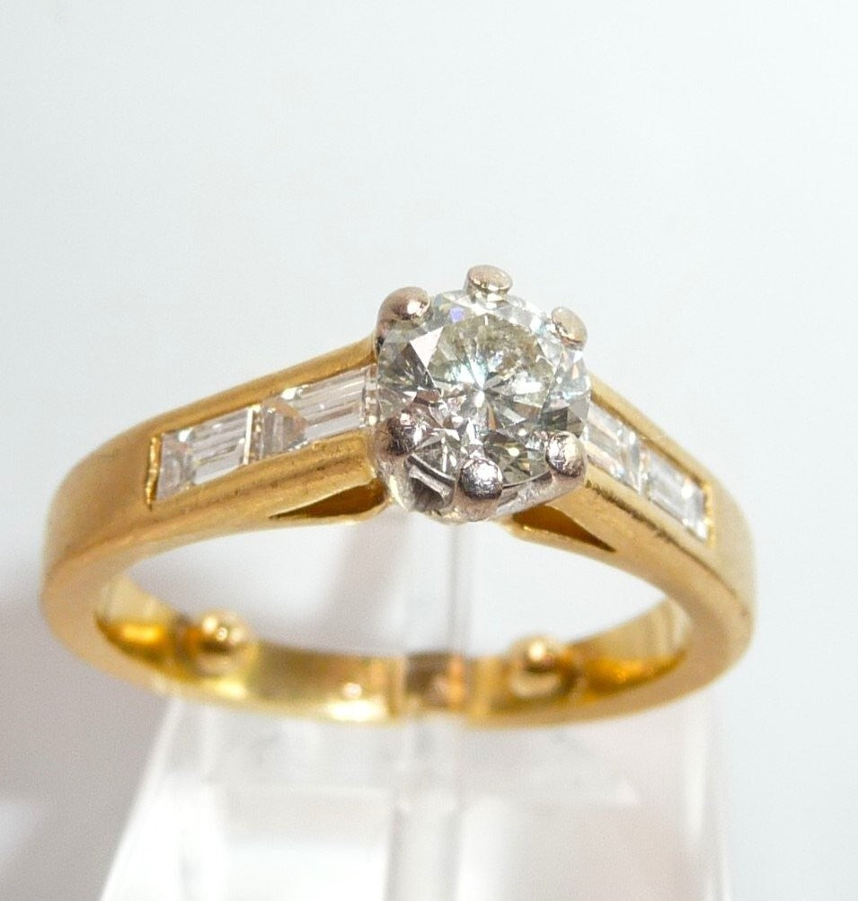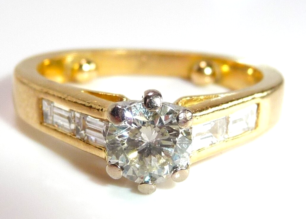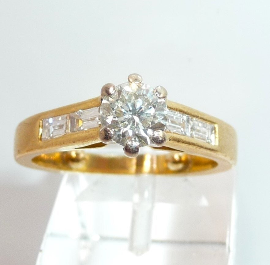 Ring in 750 / 18 K Gelbgold mit total 1.07 ct. Diamanten. Der Solitär-Ring mit Akzentsetzungen auf den Ringschultern hat einen zentralen Diamanten im Brillantschliff von ca. 0.63 ct. mit Farbe G und Reinheit SI. Auf den Ringschultern sind jeweils 2 Diamanten im Baguette-Schliff von total 0.44 ct. eingefasst, die einen edlen Übergang zur Ringschiene schaffen.