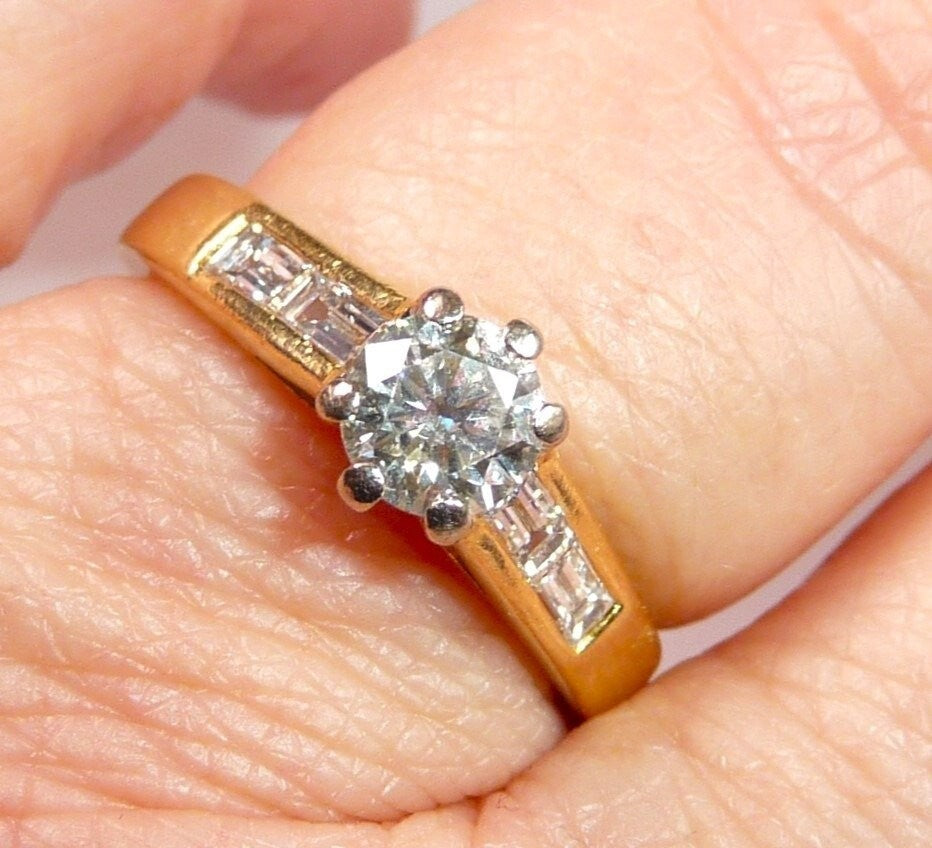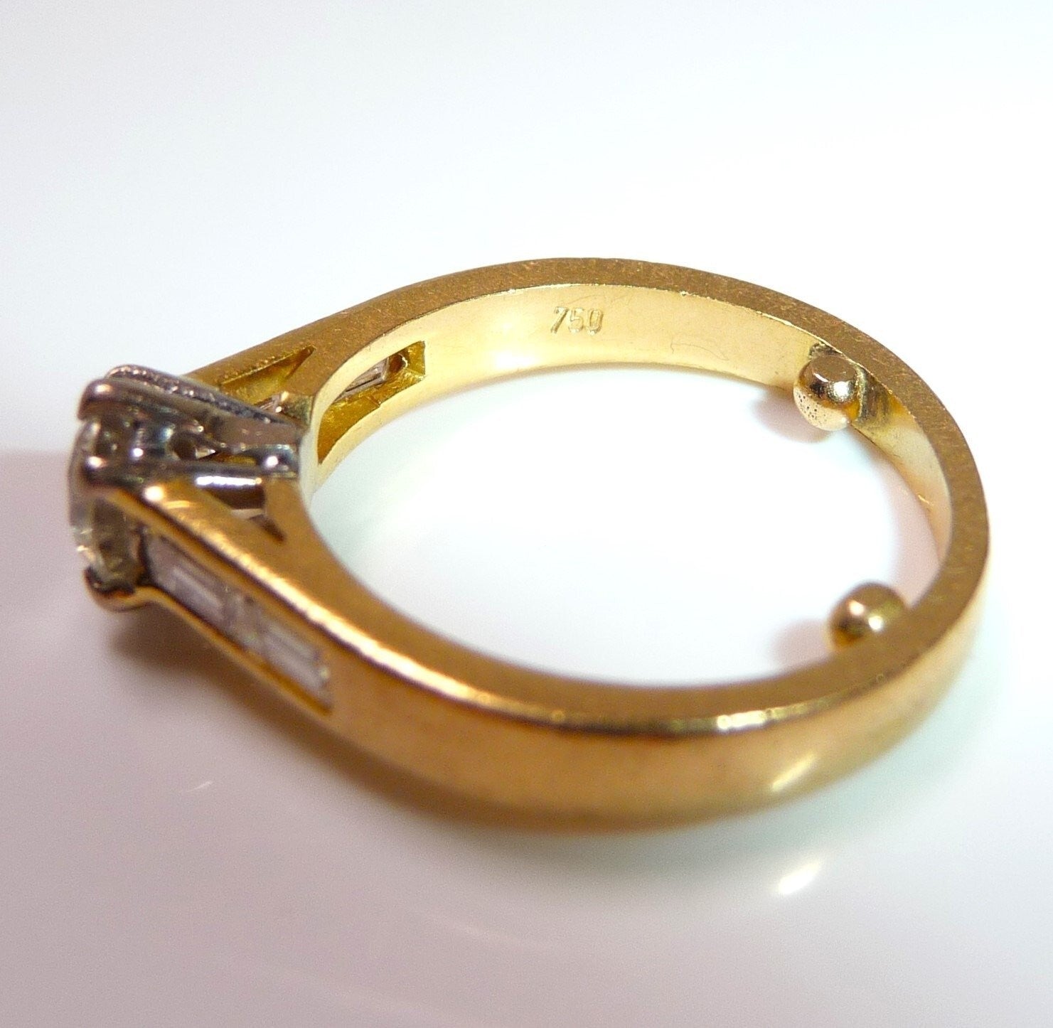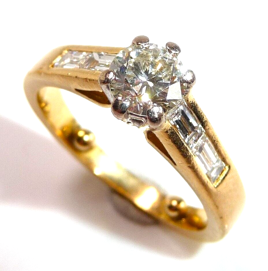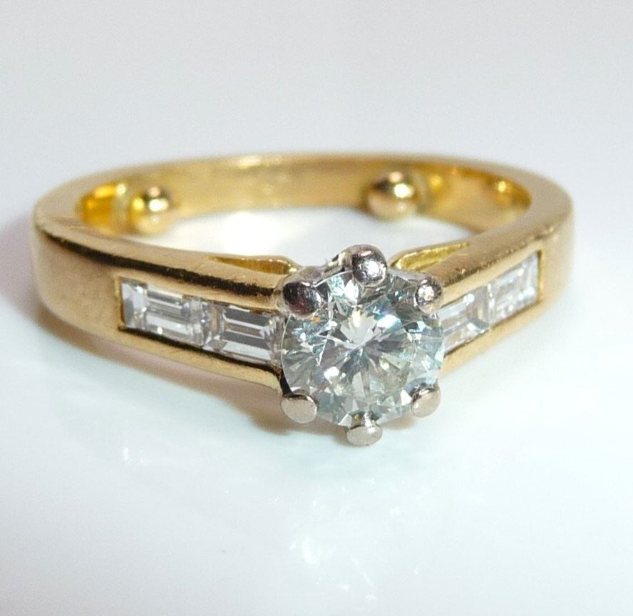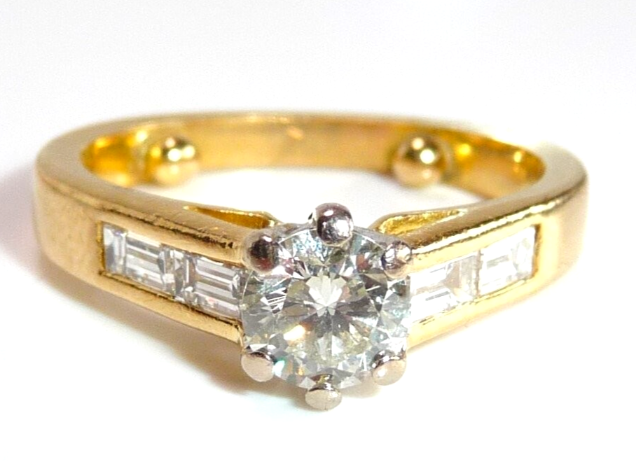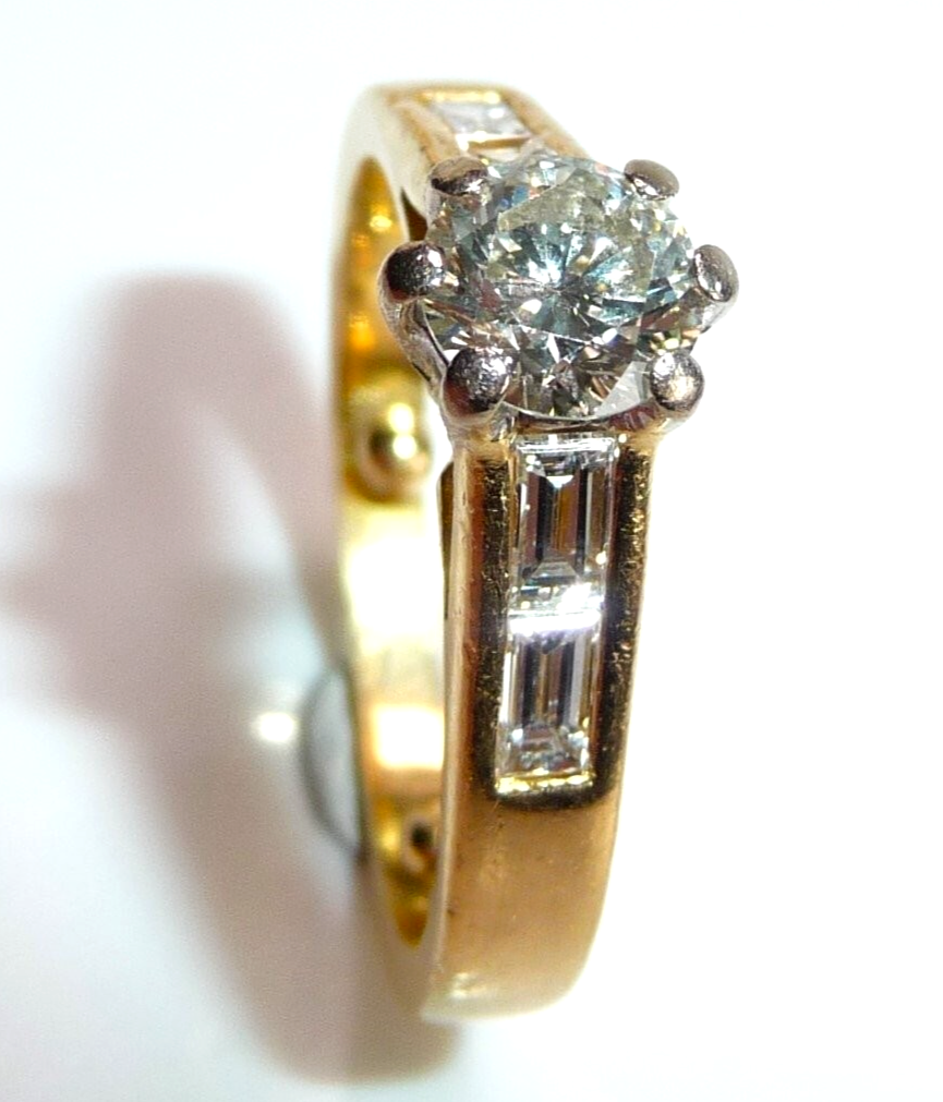 Ring in 750 / 18 K Gelbgold mit total 1.07 ct. Diamanten. Der Solitär-Ring mit Akzentsetzungen auf den Ringschultern hat einen zentralen Diamanten im Brillantschliff von ca. 0.63 ct. mit Farbe G und Reinheit SI. Auf den Ringschultern sind jeweils 2 Diamanten im Baguette-Schliff von total 0.44 ct. eingefasst, die einen edlen Übergang zur Ringschiene schaffen.
