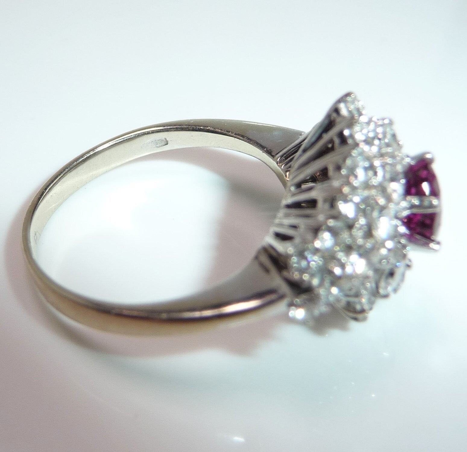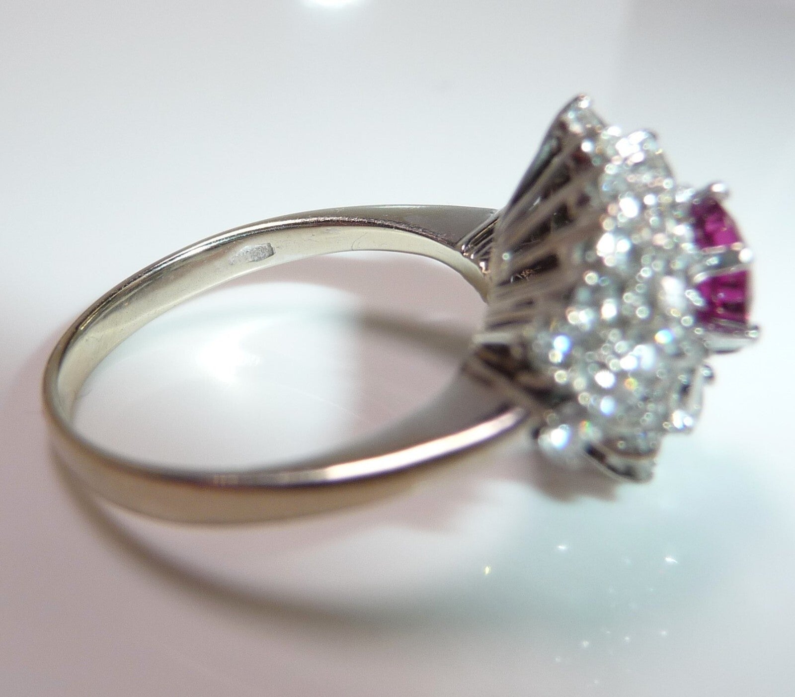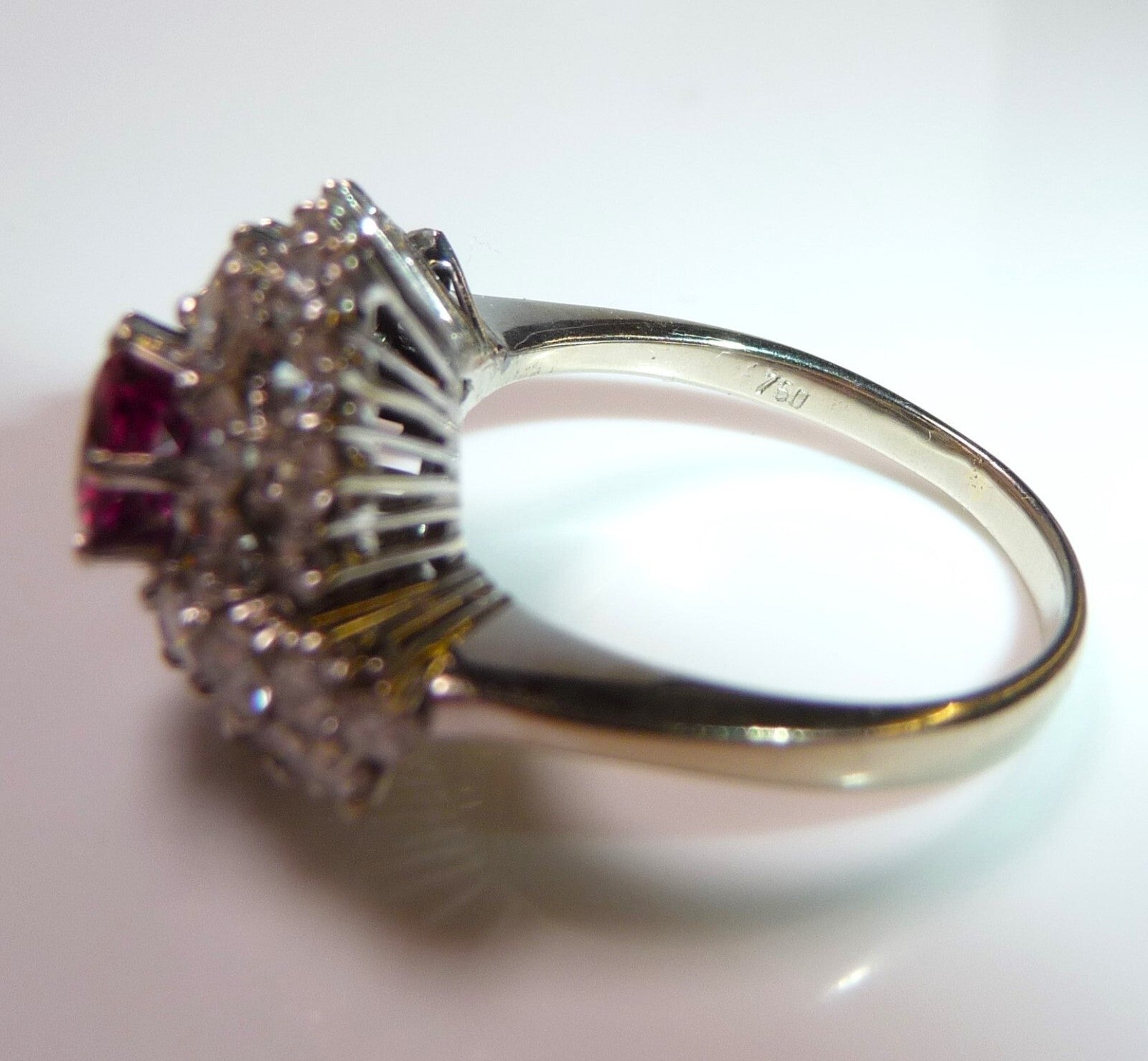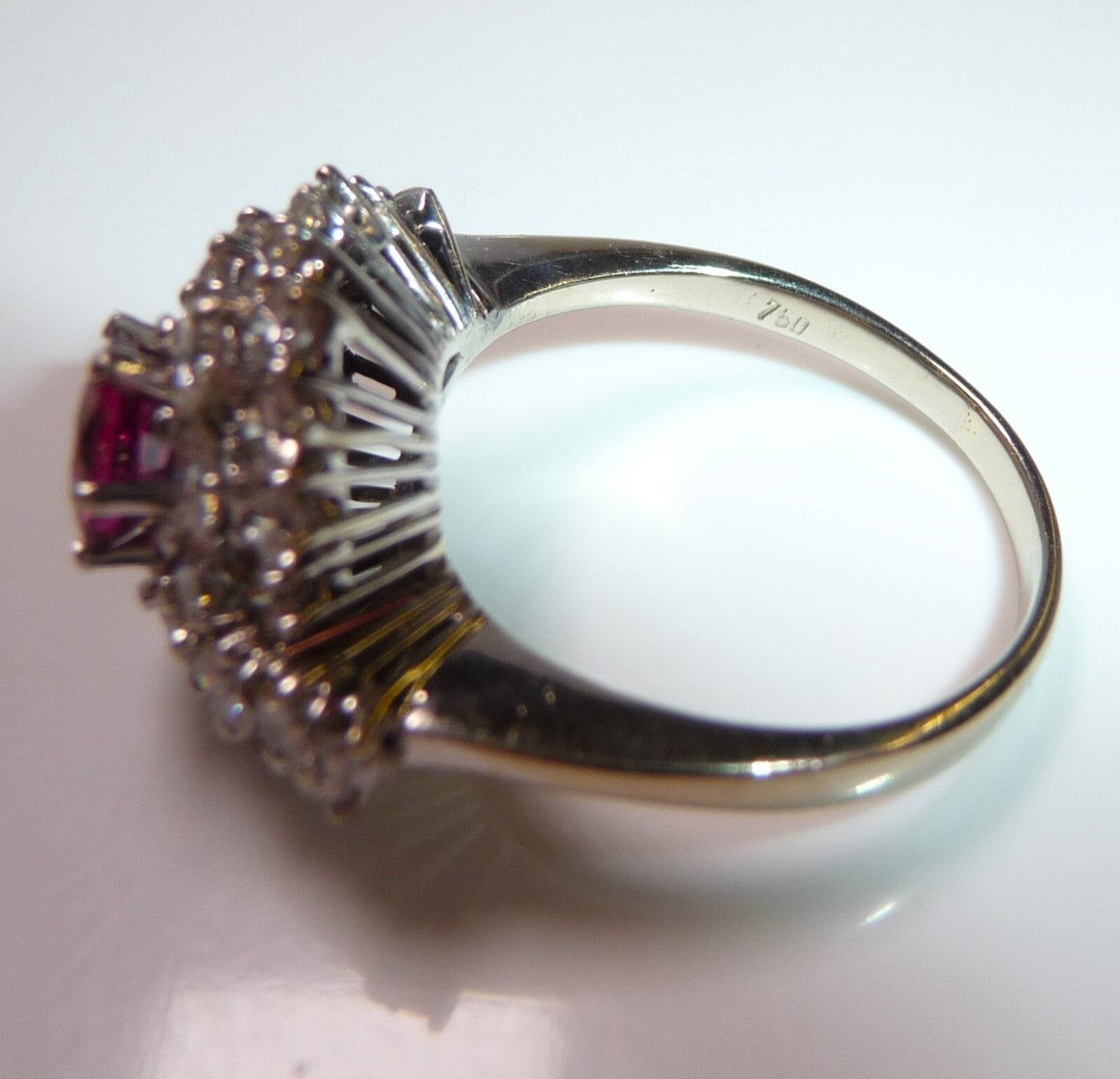 Eleganter Ring in 750 / 18 K Weißgold. Der Ring hat einen markant dunkelroten Saphir - klassifiziert als Pink Saphir - im Zentrum. Der pinke Saphir mit dem Durchmesser von 5,8 mm und einer Tiefe von 4 mm hat ca. 1.00 ct.. Ein Cluster von 34 Diamanten im Brillantschliff, die zur Mitte hin immer größer werden, legt sich wie ein Strudel um den Saphir. Mit Größen aufsteigend von 0.03 bis zu 0.09 ct. haben die Diamanten zusammen etwa 1.40 ct. mit Farbe F und Reinheit VS.