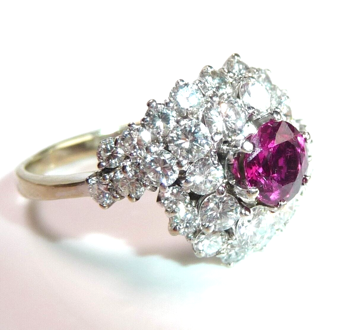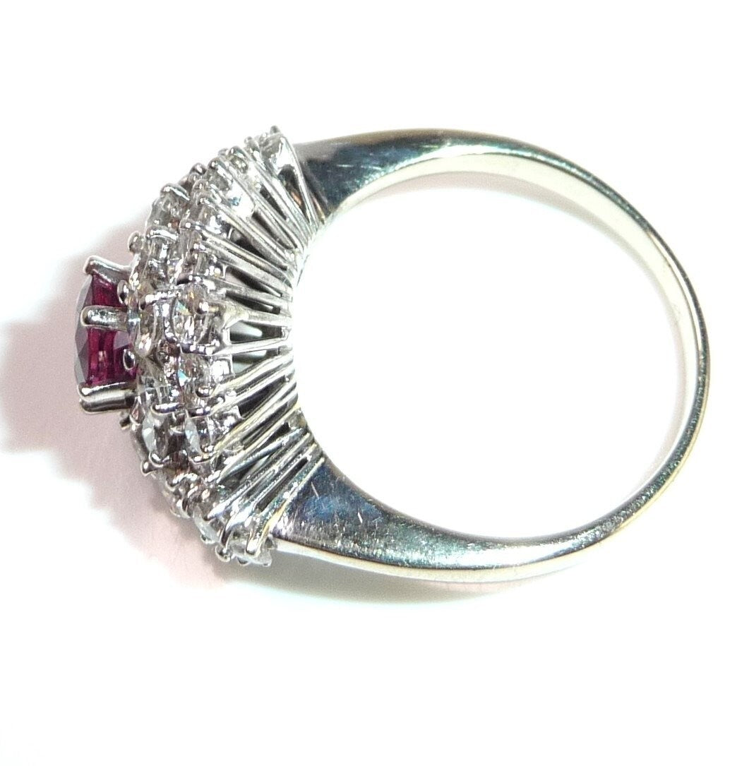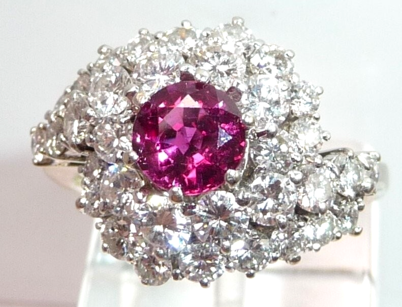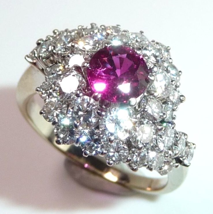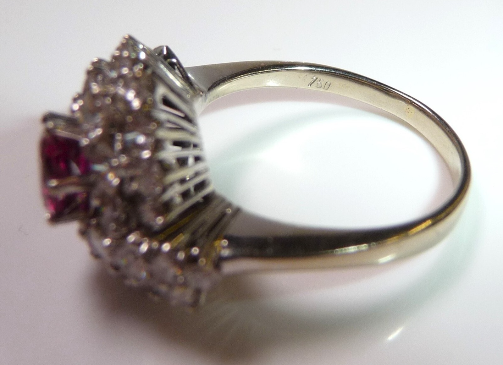 Eleganter Ring in 750 / 18 K Weißgold. Der Ring hat einen markant dunkelroten Saphir - klassifiziert als Pink Saphir - im Zentrum. Der pinke Saphir mit dem Durchmesser von 5,8 mm und einer Tiefe von 4 mm hat ca. 1.00 ct.. Ein Cluster von 34 Diamanten im Brillantschliff, die zur Mitte hin immer größer werden, legt sich wie ein Strudel um den Saphir. Mit Größen aufsteigend von 0.03 bis zu 0.09 ct. haben die Diamanten zusammen etwa 1.40 ct. mit Farbe F und Reinheit VS.