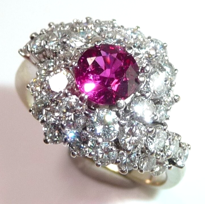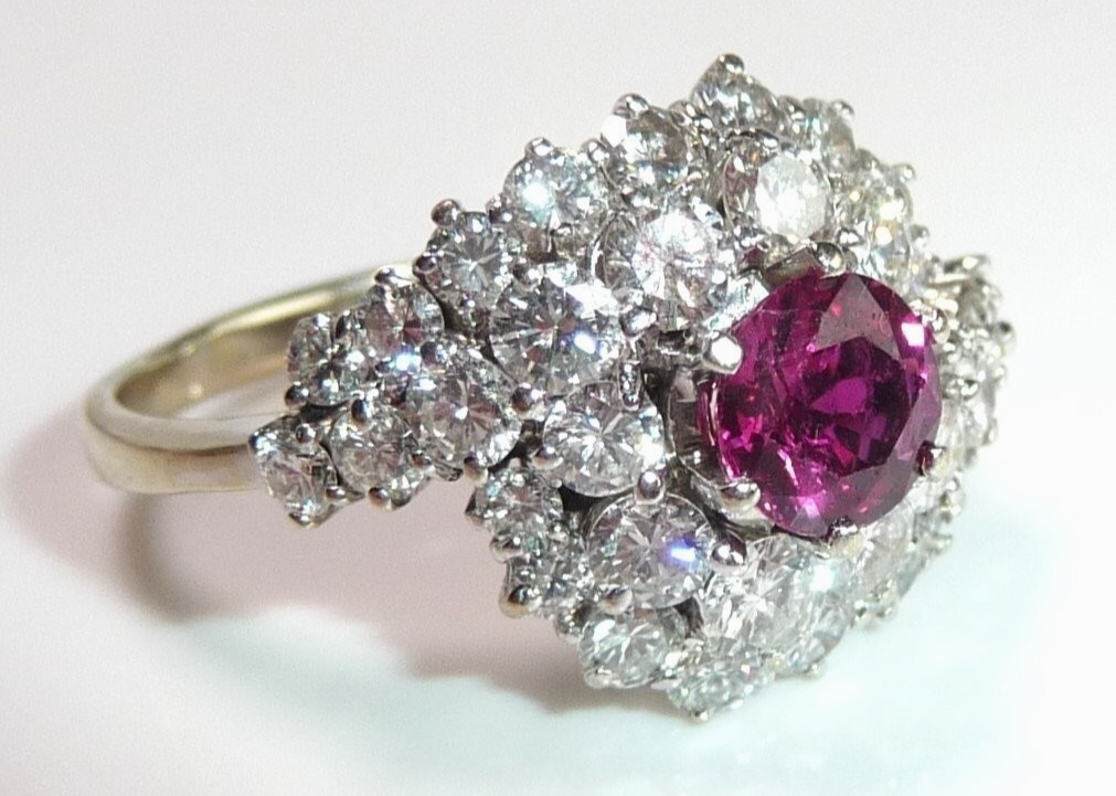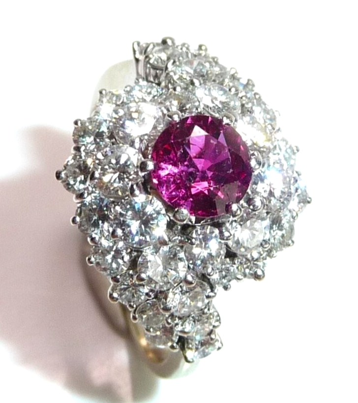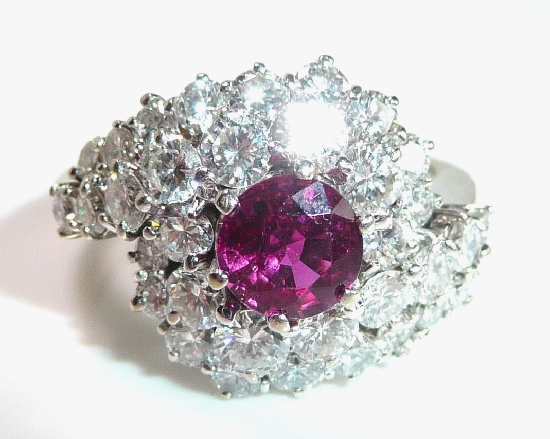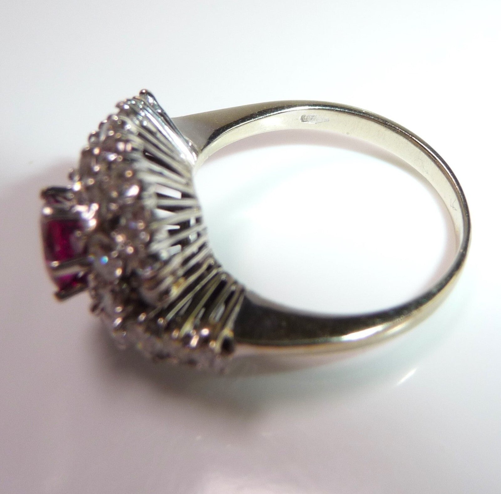 Eleganter Ring in 750 / 18 K Weißgold. Der Ring hat einen markant dunkelroten Saphir - klassifiziert als Pink Saphir - im Zentrum. Der pinke Saphir mit dem Durchmesser von 5,8 mm und einer Tiefe von 4 mm hat ca. 1.00 ct.. Ein Cluster von 34 Diamanten im Brillantschliff, die zur Mitte hin immer größer werden, legt sich wie ein Strudel um den Saphir. Mit Größen aufsteigend von 0.03 bis zu 0.09 ct. haben die Diamanten zusammen etwa 1.40 ct. mit Farbe F und Reinheit VS.