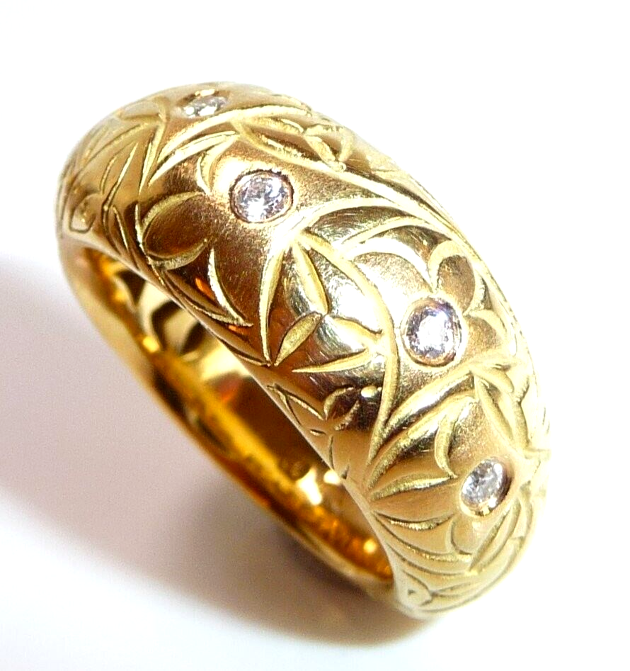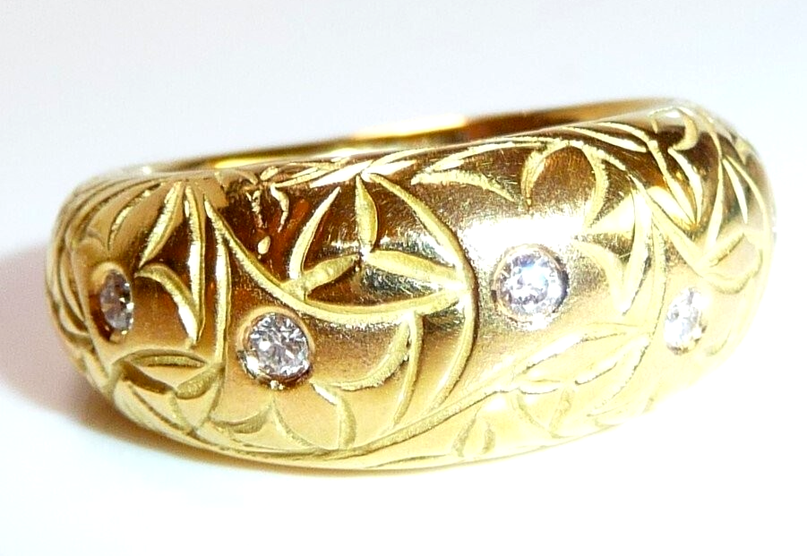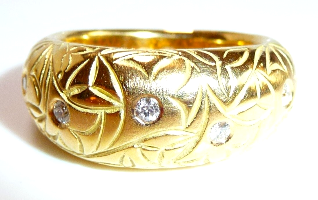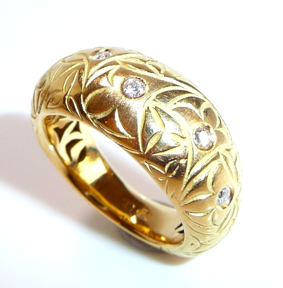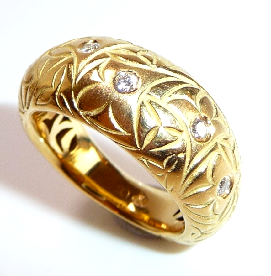Ring in 750/ 18 K Gelbgold. Der Ring ist ein Marken-Juwel von der Edel-Goldschmiede Oeding-Erdel aus Deutschland. Jeder Ring wird hier von Hand gefertigt. Bei diesem Bandring verbreitert sich die Form nach oben hin und in das Gold sind Ornamente tief eingraviert. In diese Struktur sind insgesamt 5 Diamanten im Brillantschliff eingefasst. Zusammen haben die 5 Diamanten 0.15 ct. mit Farbe G-F und Reinheit VS.