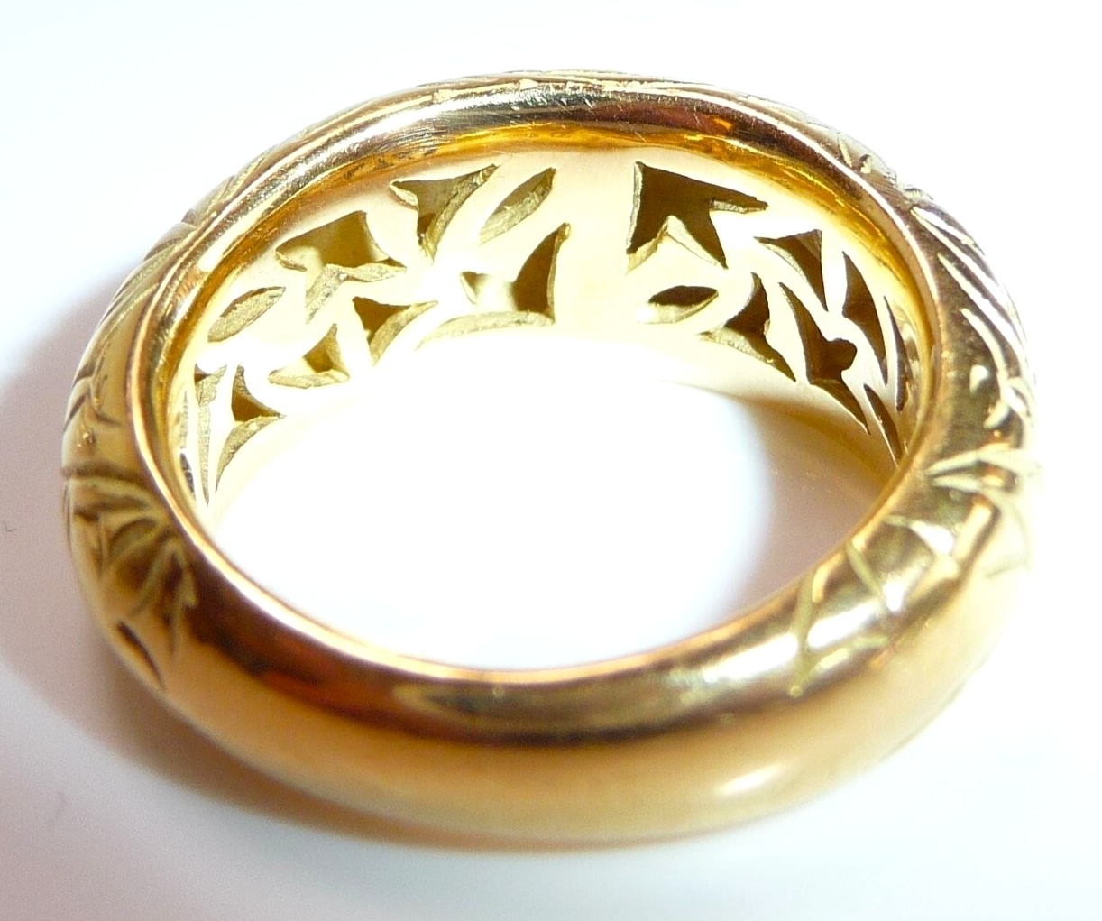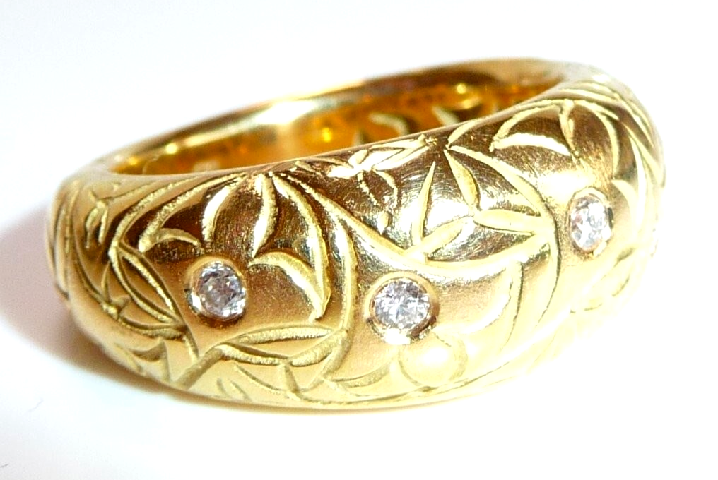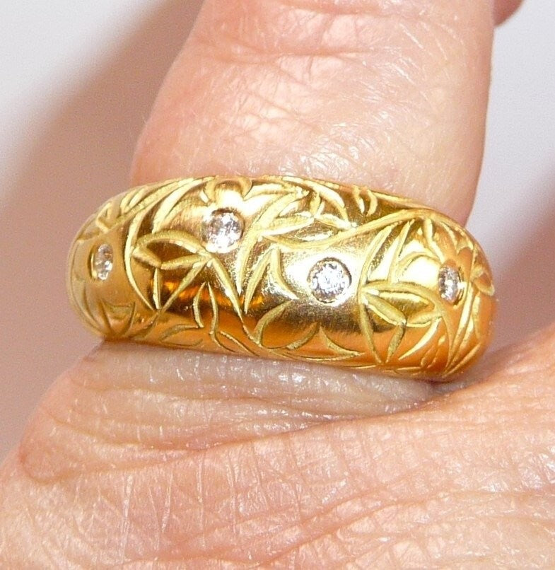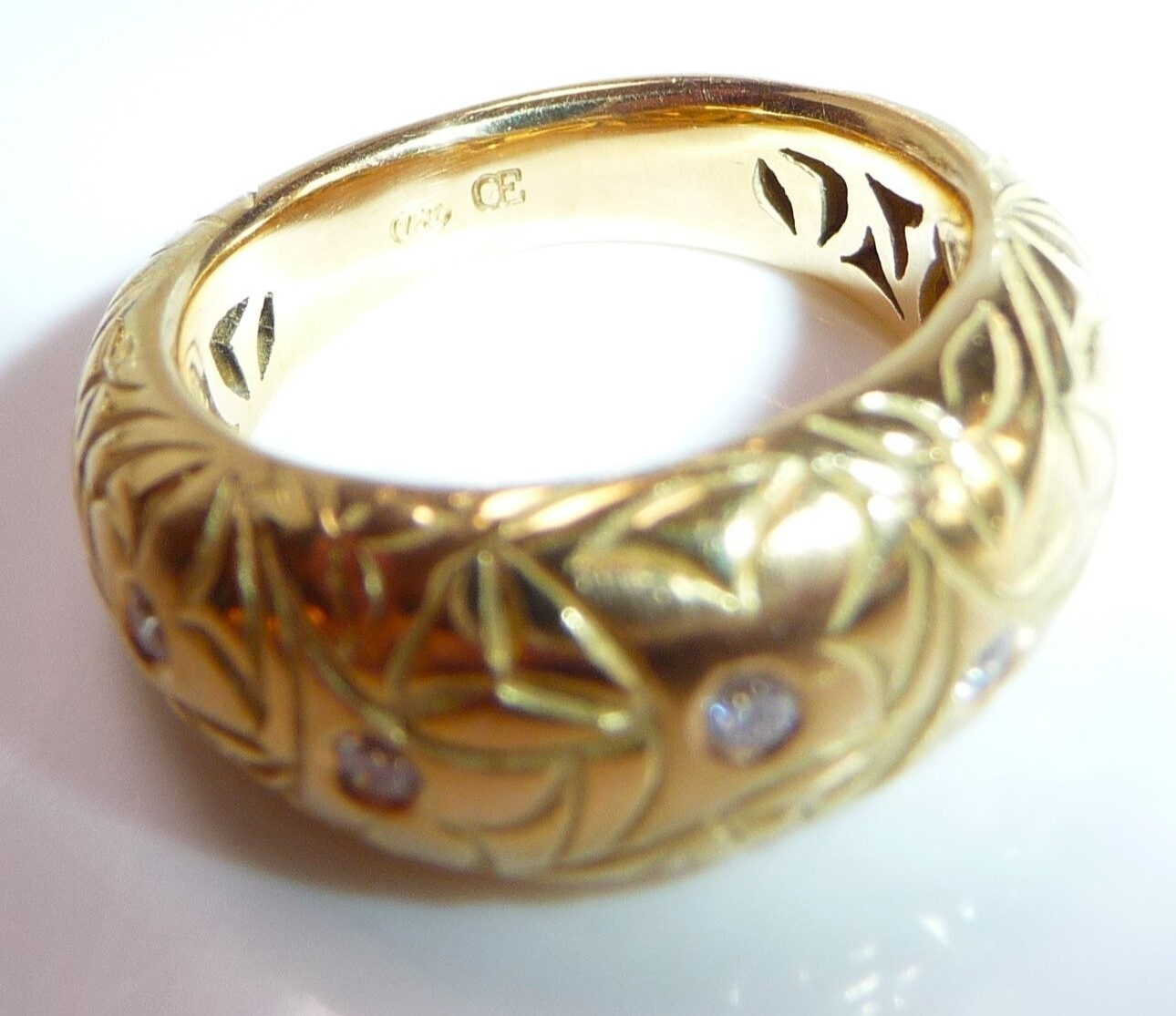 Ring in 750/ 18 K Gelbgold. Der Ring ist ein Marken-Juwel von der Edel-Goldschmiede Oeding-Erdel aus Deutschland. Jeder Ring wird hier von Hand gefertigt. Bei diesem Bandring verbreitert sich die Form nach oben hin und in das Gold sind Ornamente tief eingraviert. In diese Struktur sind insgesamt 5 Diamanten im Brillantschliff eingefasst. Zusammen haben die 5 Diamanten 0.15 ct. mit Farbe G-F und Reinheit VS.