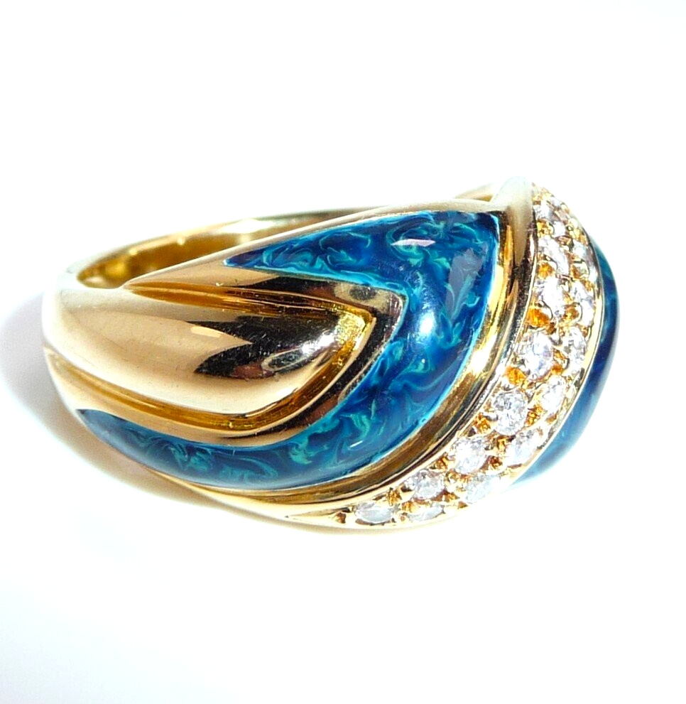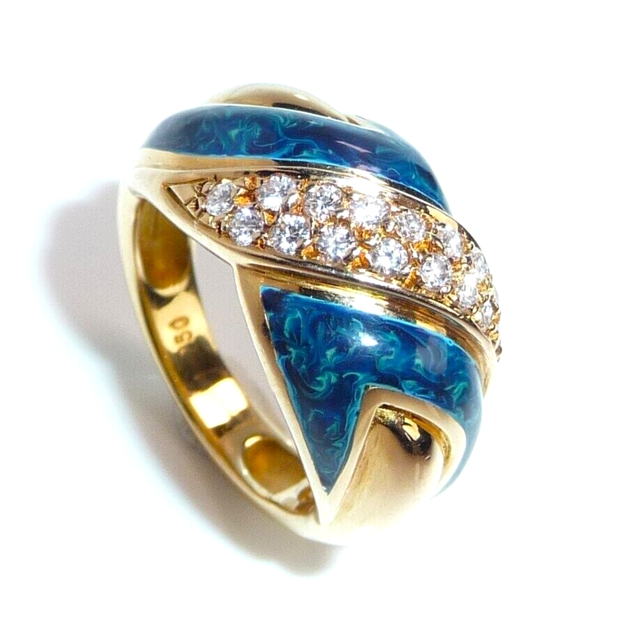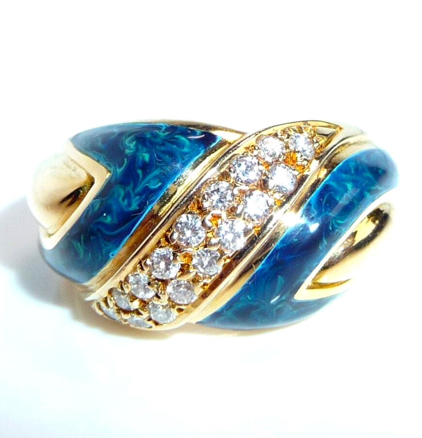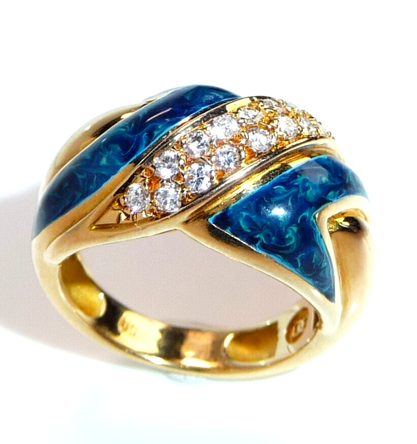 Eleganter Ring in 750 / 18 K Gelbgold. Der Ring verbreitert sich nach oben hin und hat ein elegantes Muster im Ringkopf, das aus einer Doppel-Reihe Diamanten und blauer Emaille besteht. Die Diamant-Reihe beinhaltet 16 Diamanten im Brillantschliff von zusammen 0.32 ct. mit Farbe F-E und Reinheit VVS. Die blaue Emaille ist mit hellblauen Farb-Schleiern durchzogen, so dass sie einen sehr lebendigen hell-dunkel-Kontrast bietet.