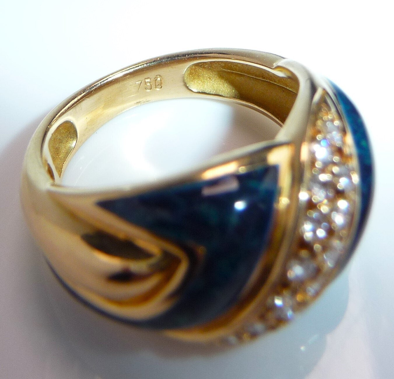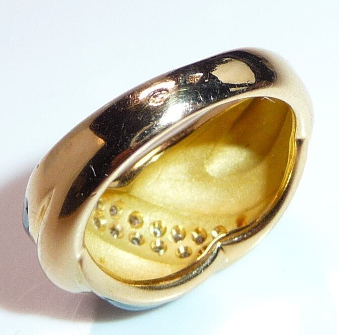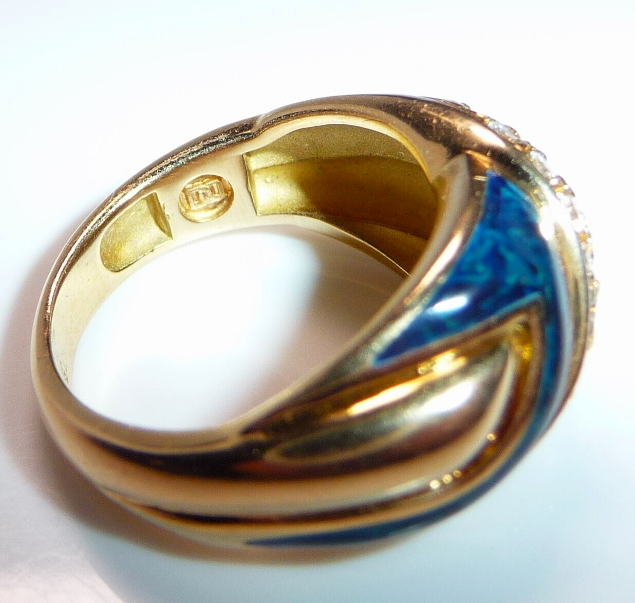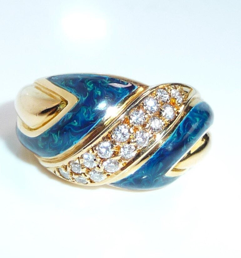 Eleganter Ring in 750 / 18 K Gelbgold. Der Ring verbreitert sich nach oben hin und hat ein elegantes Muster im Ringkopf, das aus einer Doppel-Reihe Diamanten und blauer Emaille besteht. Die Diamant-Reihe beinhaltet 16 Diamanten im Brillantschliff von zusammen 0.32 ct. mit Farbe F-E und Reinheit VVS. Die blaue Emaille ist mit hellblauen Farb-Schleiern durchzogen, so dass sie einen sehr lebendigen hell-dunkel-Kontrast bietet.