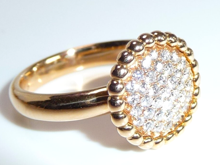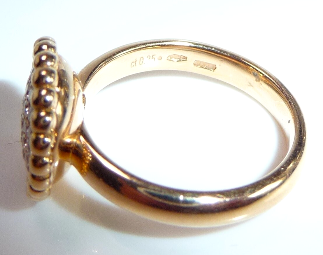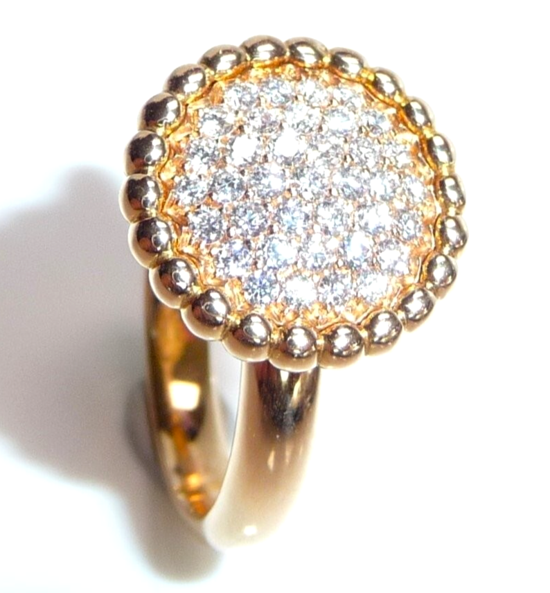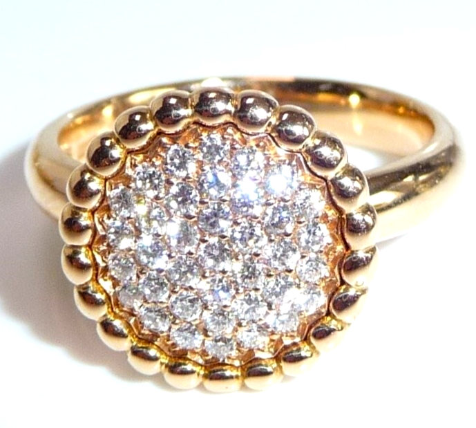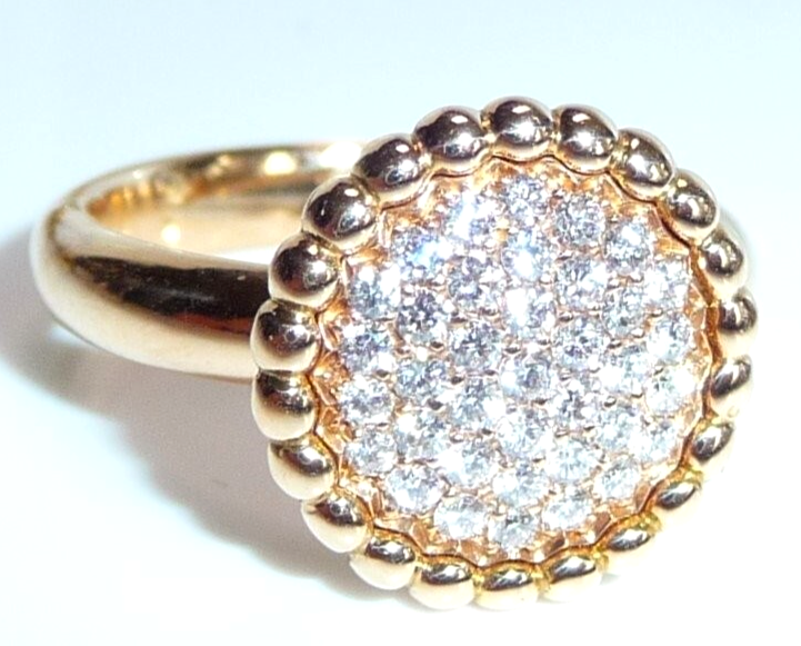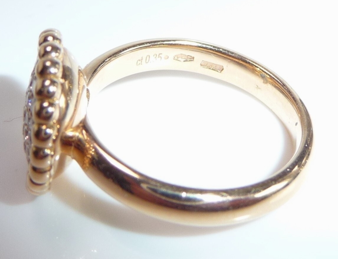 Diamant-Ring in 18 kt. / 750 Roségold. Der Ring hat einen kreisrunden Ringkopf, der ein bisschen an eine Sonnenblume erinnert. Im Zentrum ist ein leicht gewölbter Kreis, der komplett mit Diamanten besetzt ist. Insgesamt sind es 37 Diamanten im Brillantschliff von 0.35 ct. (F-G/VVS-VS), die exakt symmetrisch in 3 Kreisen plus Mitte angeordnet sind. Die pavé gefassten Diamanten bilden eine einheitlich funkelnde Fläche. Die Fläche wird eingerahmt von kleinen Gold-Kugeln, die das blumige Design bewirken.