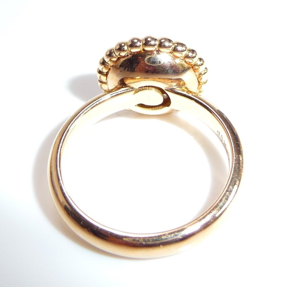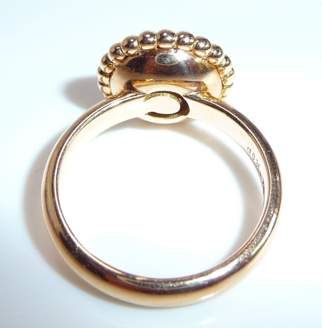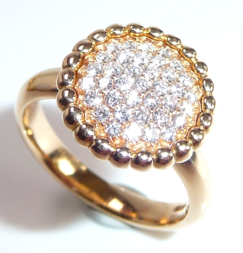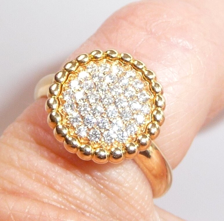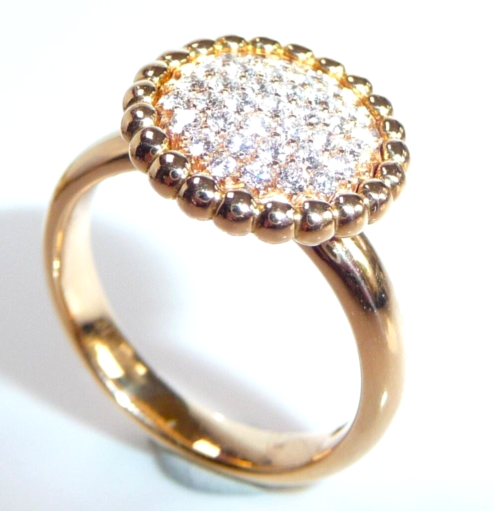 Diamant-Ring in 18 kt. / 750 Roségold. Der Ring hat einen kreisrunden Ringkopf, der ein bisschen an eine Sonnenblume erinnert. Im Zentrum ist ein leicht gewölbter Kreis, der komplett mit Diamanten besetzt ist. Insgesamt sind es 37 Diamanten im Brillantschliff von 0.35 ct. (F-G/VVS-VS), die exakt symmetrisch in 3 Kreisen plus Mitte angeordnet sind. Die pavé gefassten Diamanten bilden eine einheitlich funkelnde Fläche. Die Fläche wird eingerahmt von kleinen Gold-Kugeln, die das blumige Design bewirken.