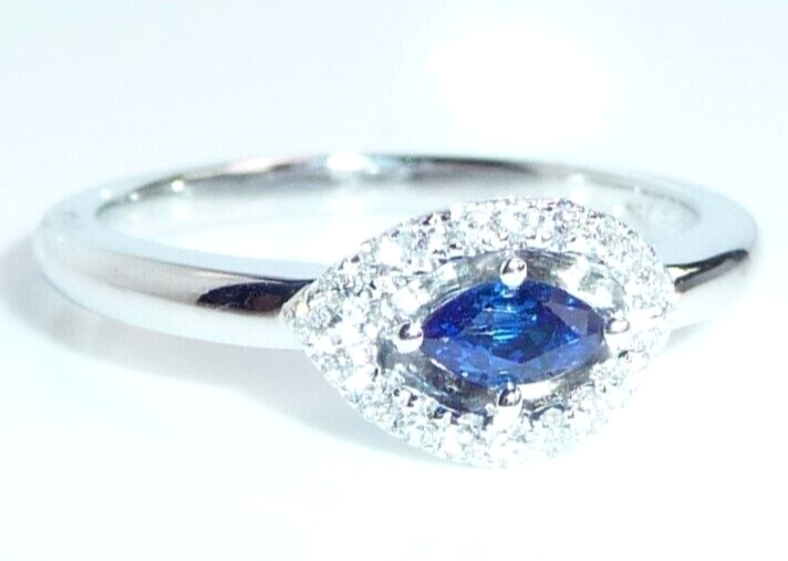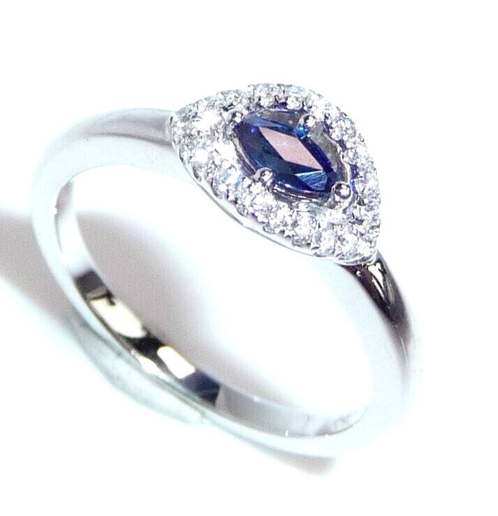 Ring in 750 / 18 K Weißgold. Der Ring ist eine hochwertige Goldschmiede-Arbeit von Hand. Der Ringkopf hat im Zentrum einen blauen Saphir im Marquise-Schliff von 0.25 ct. eingefasst. Der Saphir hat ein leuchtendes mittleres Blau. Der Saphir wird von insgesamt 20 Diamanten im Brillantschliff von total 0.30 ct. (F/VVS-VS) eingerahmt. Dabei folgt der brillante Rahmen genau der Marquise-Form des Mittelsteins.