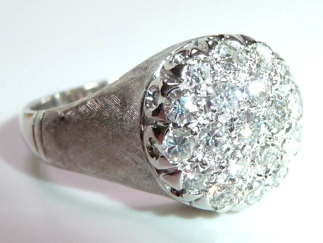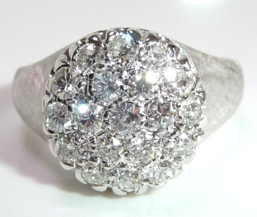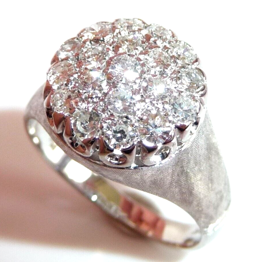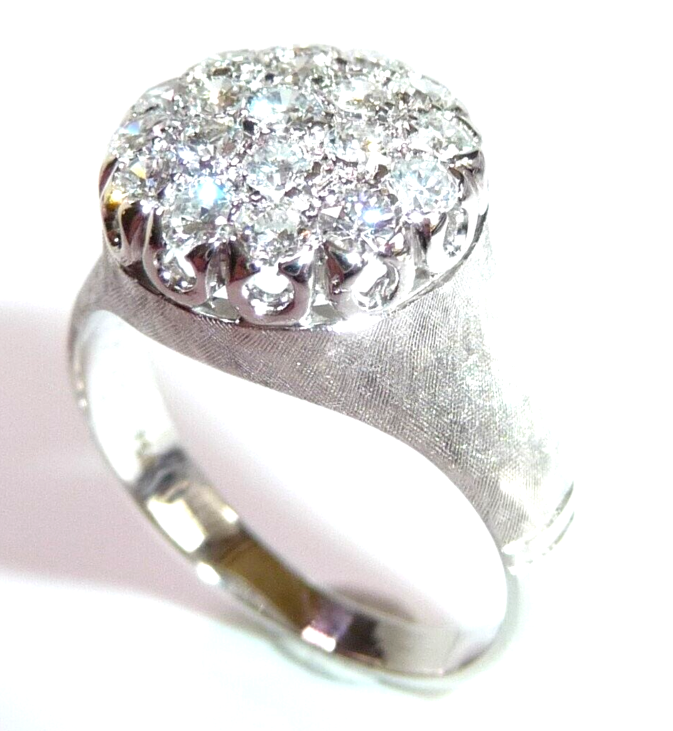 Ring in 750 / 18 K Weißgold. Der Ring ist eine Goldschmiede-Arbeit aus Italien und etwa um 1960 entstanden. Hierauf weisen besonders die feinen filigranen Oberflächen-Gravuren hin, die dem Material bei jeder Bewegung einen seidigen Schimmer verleihen. Der Ring ist aus einem Stück geformt und bildet oben im Ringkopf eine kreisrunde Plattform, die voll besetzt ist mit insgesamt 19 Diamanten im Brillantschliff. Die Diamanten sind in 2 Kreisen angeordnet mit einem größeren Stein im Zentrum. So ergibt sich eine homogen glitzernde Fläche.