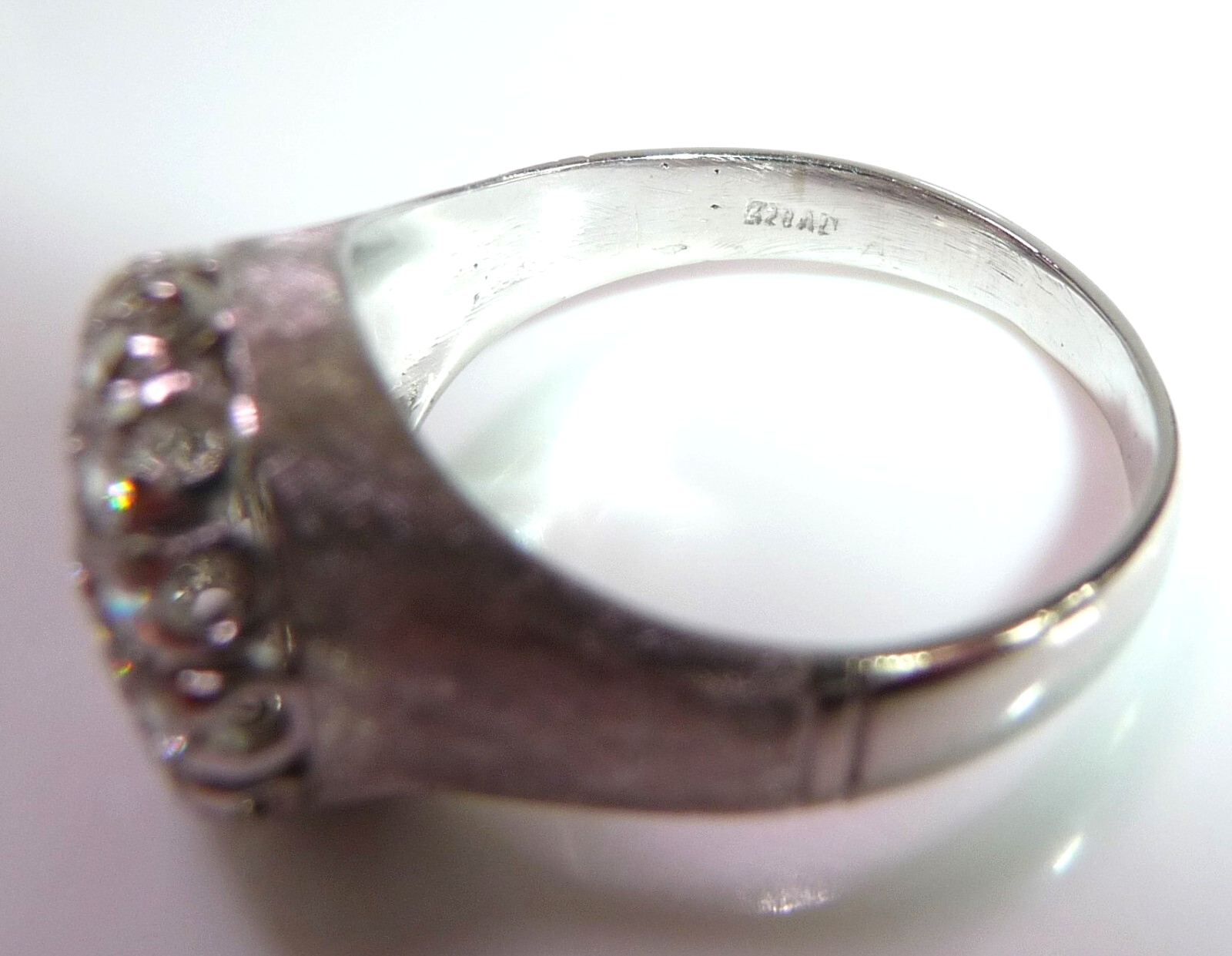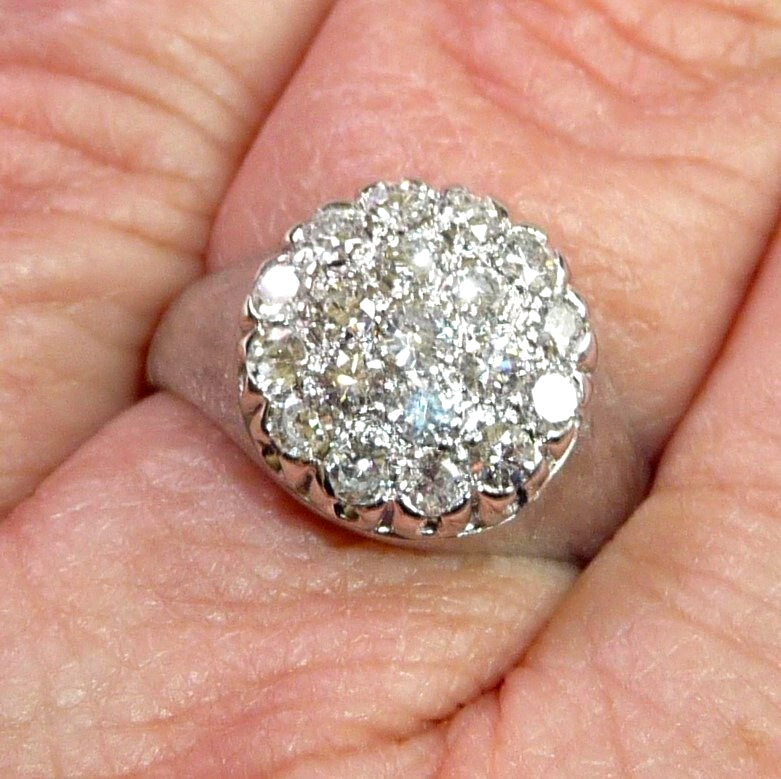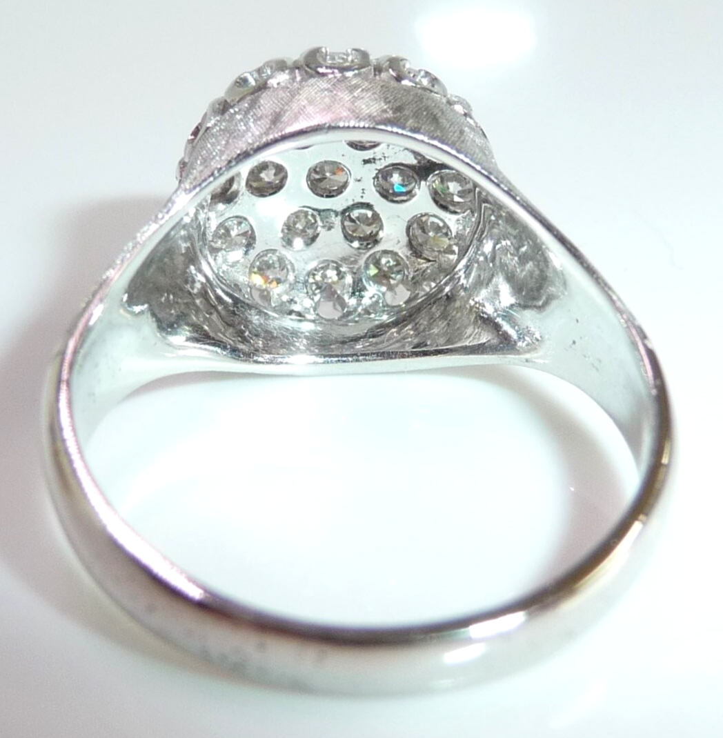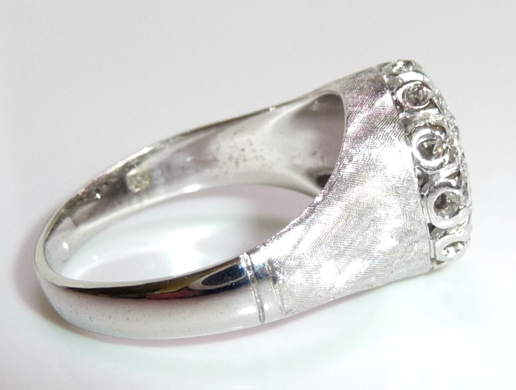 Ring in 750 / 18 K Weißgold. Der Ring ist eine Goldschmiede-Arbeit aus Italien und etwa um 1960 entstanden. Hierauf weisen besonders die feinen filigranen Oberflächen-Gravuren hin, die dem Material bei jeder Bewegung einen seidigen Schimmer verleihen. Der Ring ist aus einem Stück geformt und bildet oben im Ringkopf eine kreisrunde Plattform, die voll besetzt ist mit insgesamt 19 Diamanten im Brillantschliff. Die Diamanten sind in 2 Kreisen angeordnet mit einem größeren Stein im Zentrum. So ergibt sich eine homogen glitzernde Fläche.