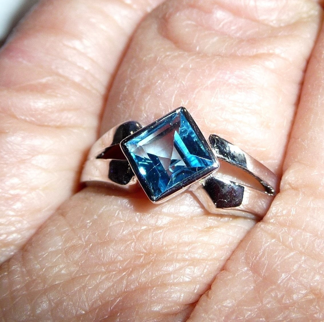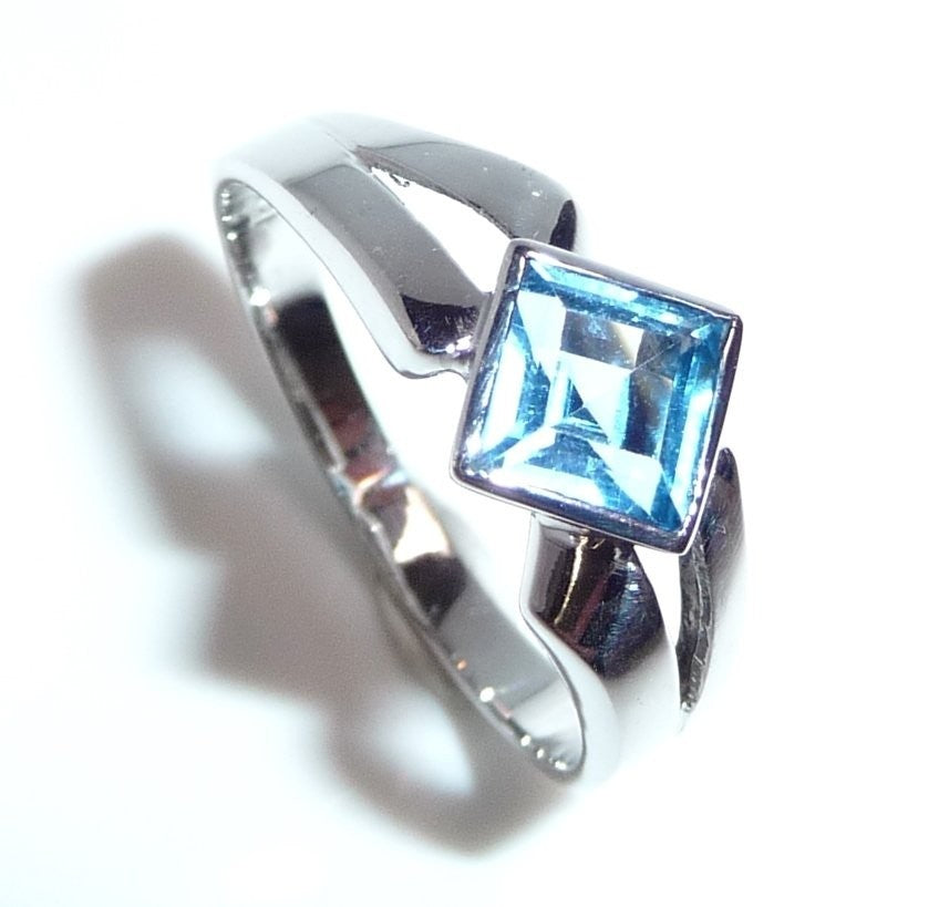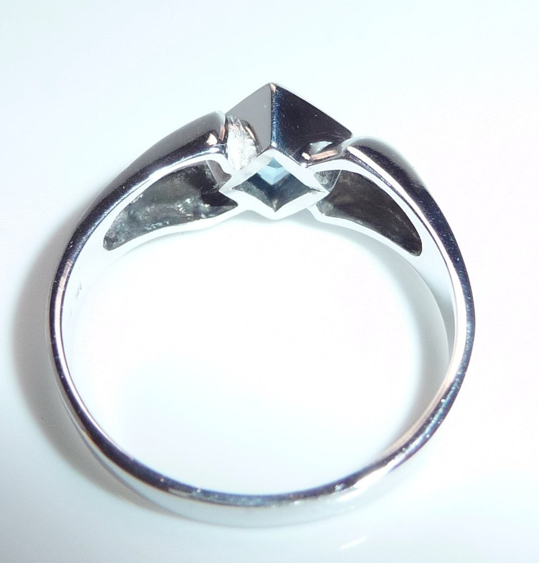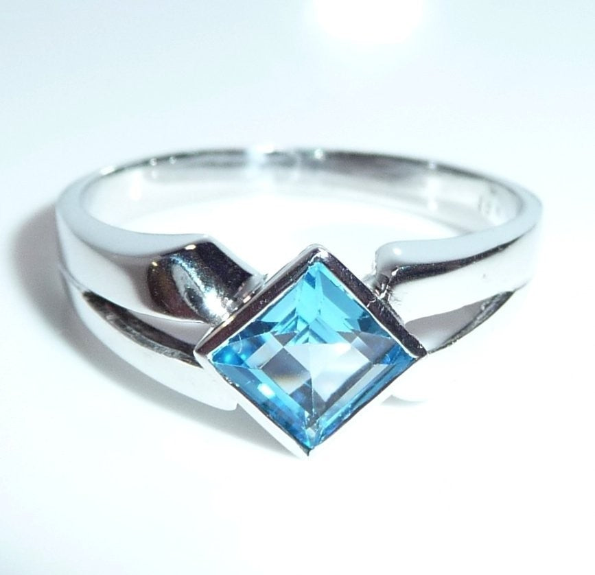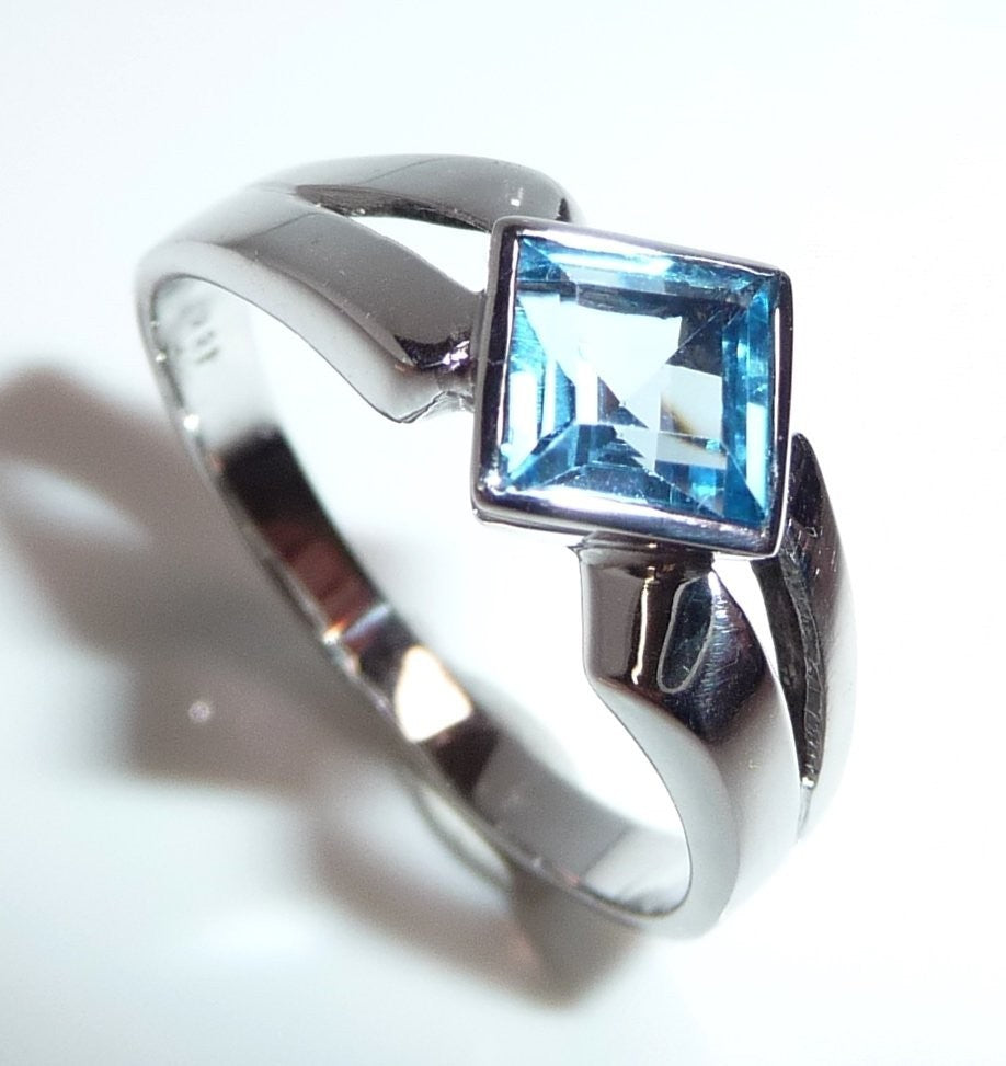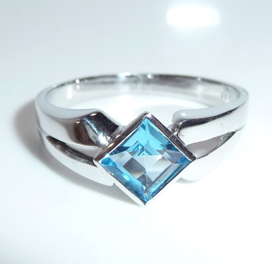 Goldschmiede-Ring, gearbeitet in 18 K / 750 Weißgold. Der Ring hat einen quadratischen blauen Topas von 1.20 ct. eingefasst. Der Topas in swiss blue ist auf die Spitze gestellt und wird von zwei Weißgold Ringschultern flankiert.