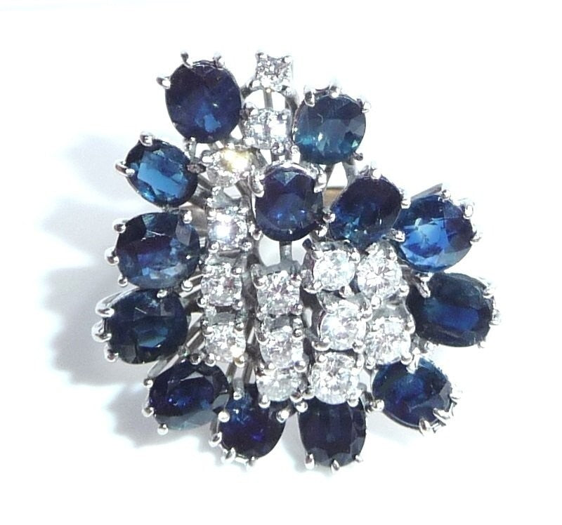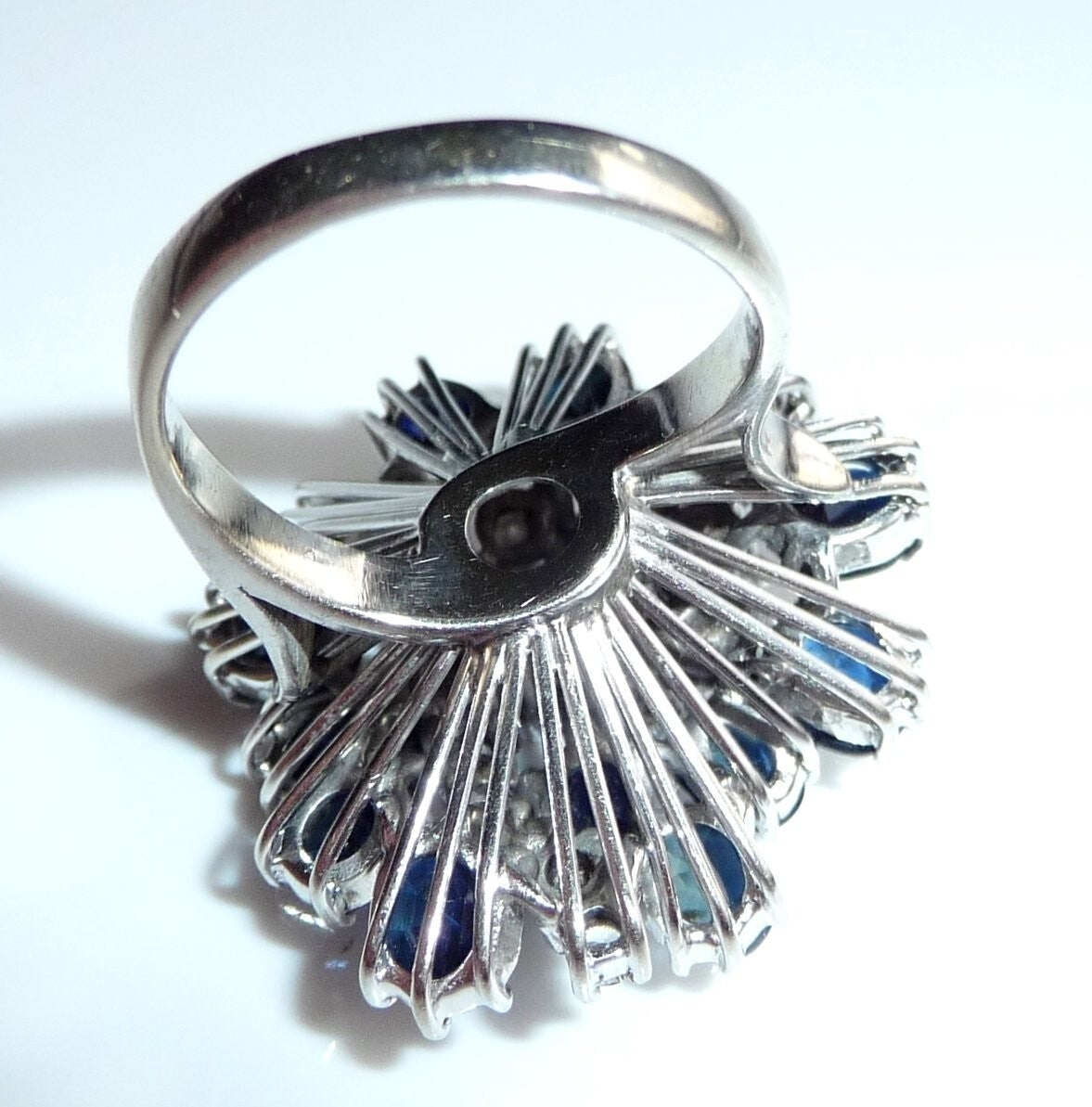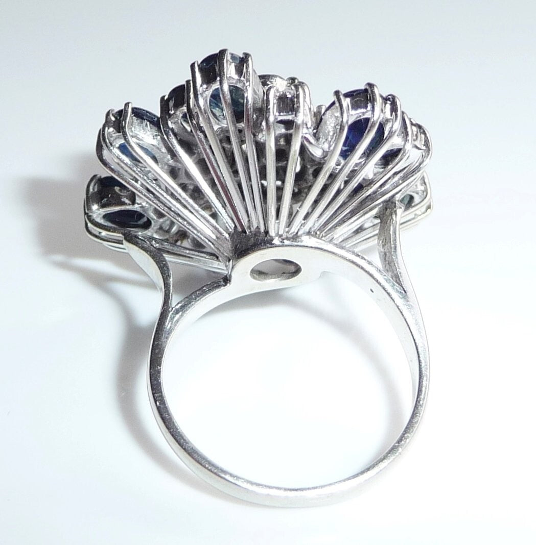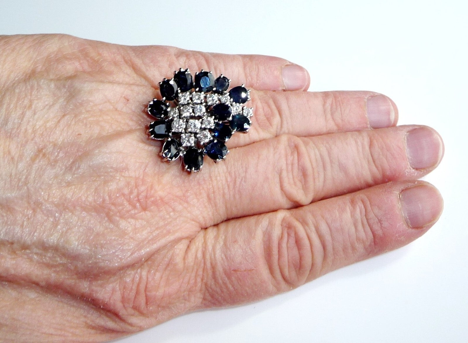 Ring in 750 / 18 K Weißgold. Der von Hand hat einen prächtig großen Ringkopf. Der Ring ist eine Goldschmiede-Arbeit von Hand. In dem sehr großen Ringkopf sind Diamanten und Saphire wie ein Cluster auf verschiedenen Höhen-Ebenen arrangiert. Im Außenbereich dominieren eher die Saphire und im Innenraum brillieren die 14 Diamanten. Die Diamanten haben zusammen ca. 1.40 ct. (G-F / SI-I).