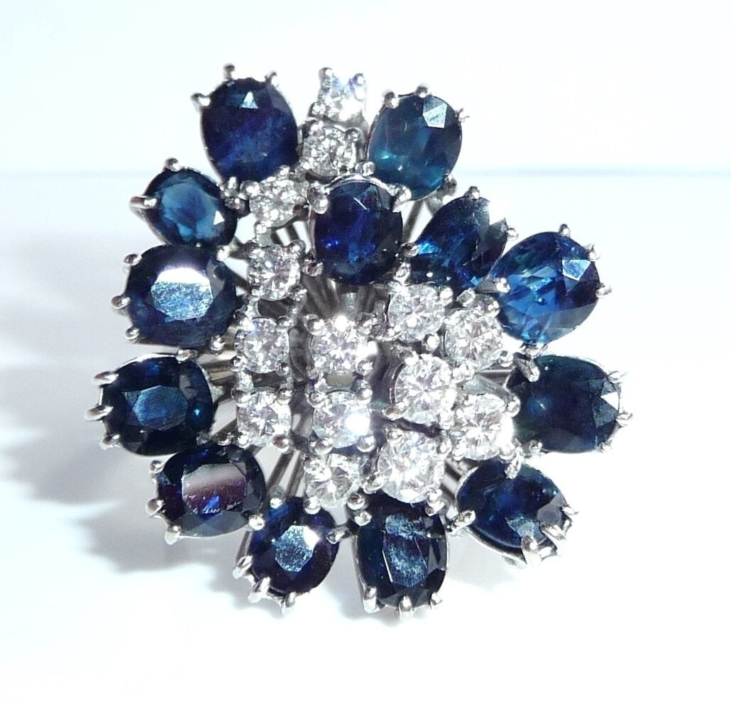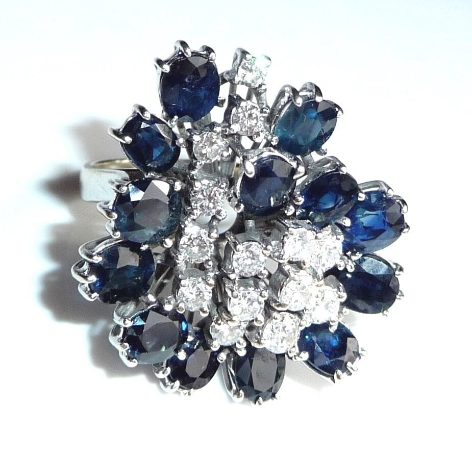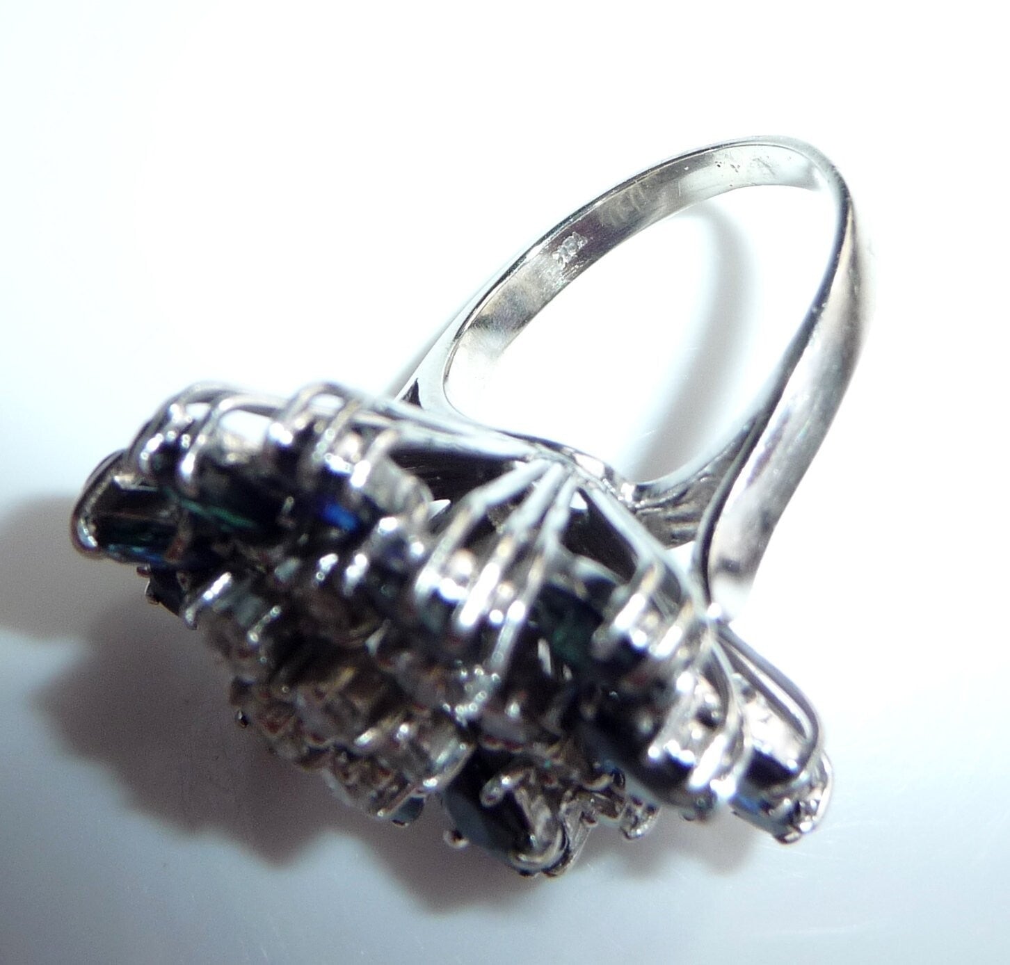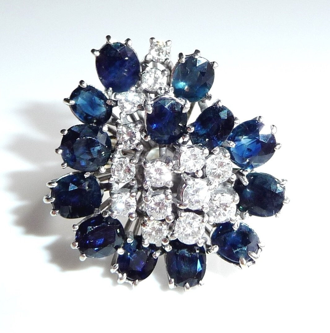 Ring in 750 / 18 K Weißgold. Der von Hand hat einen prächtig großen Ringkopf. Der Ring ist eine Goldschmiede-Arbeit von Hand. In dem sehr großen Ringkopf sind Diamanten und Saphire wie ein Cluster auf verschiedenen Höhen-Ebenen arrangiert. Im Außenbereich dominieren eher die Saphire und im Innenraum brillieren die 14 Diamanten. Die Diamanten haben zusammen ca. 1.40 ct. (G-F / SI-I).