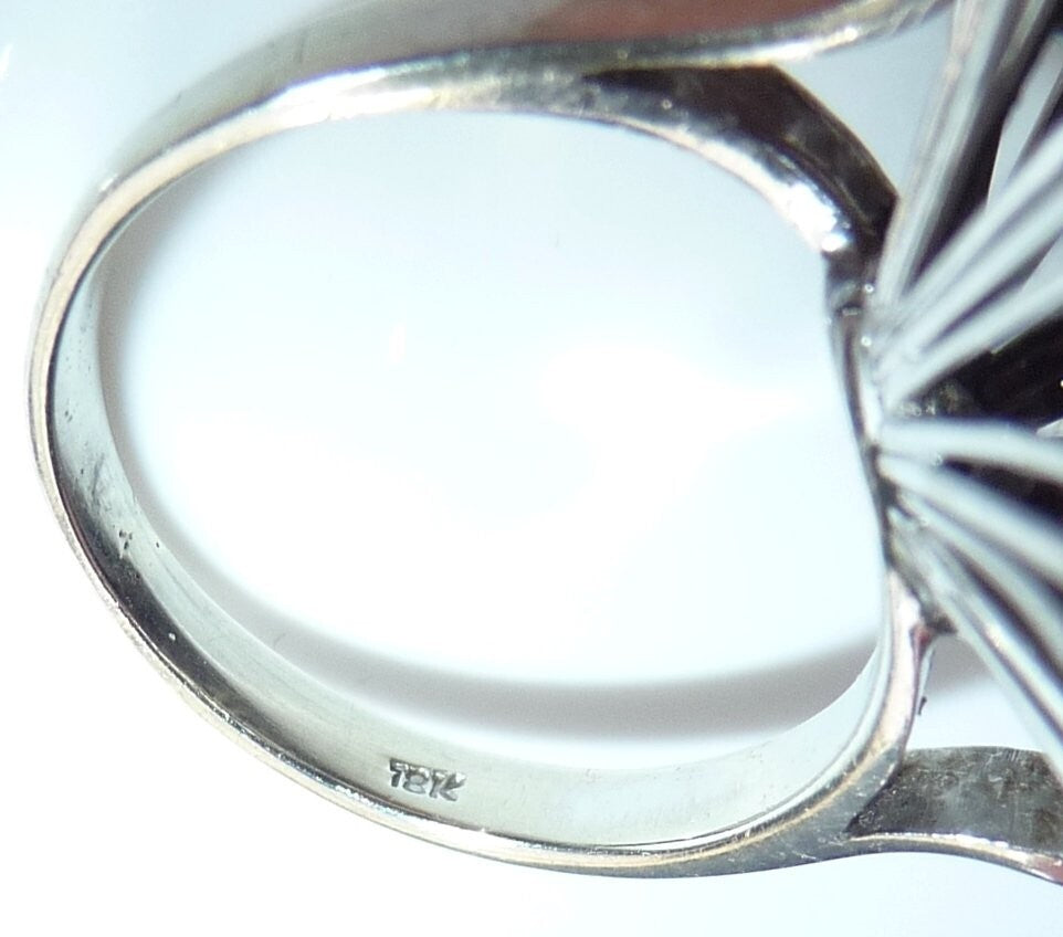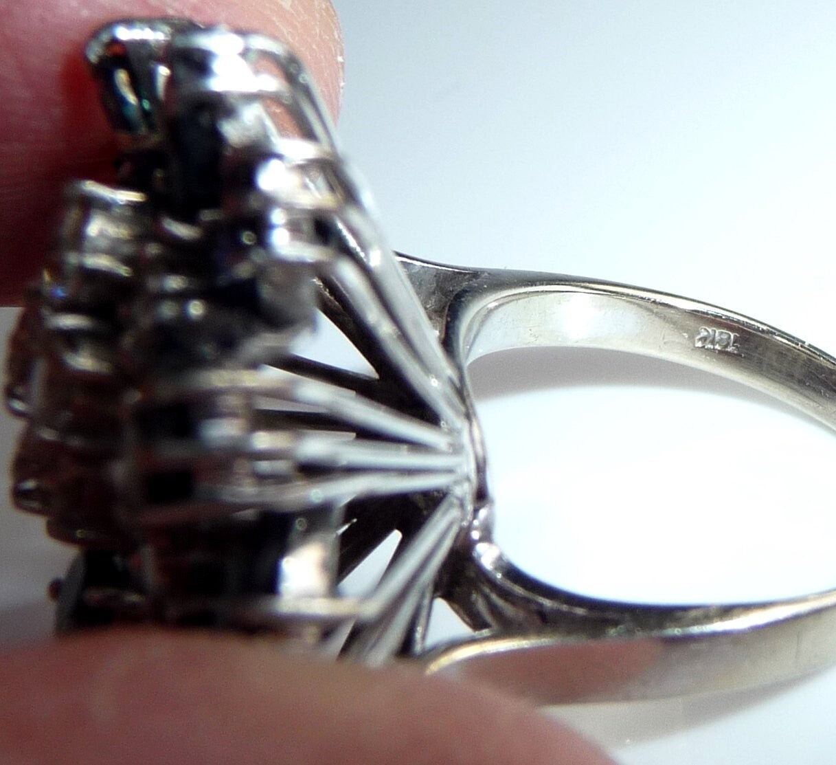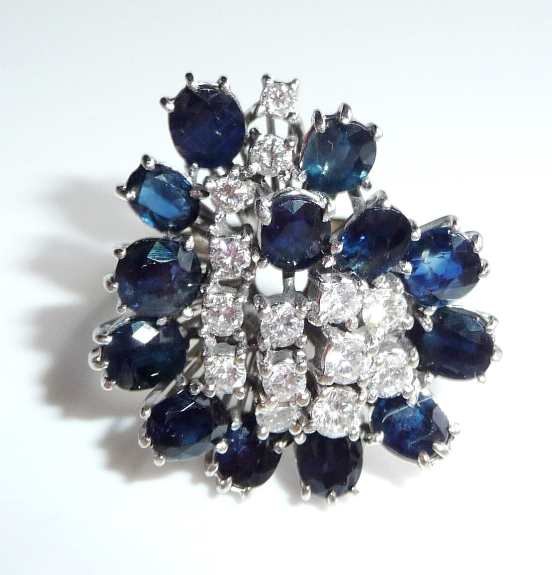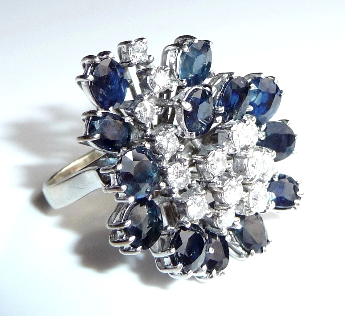 Ring in 750 / 18 K Weißgold. Der von Hand hat einen prächtig großen Ringkopf. Der Ring ist eine Goldschmiede-Arbeit von Hand. In dem sehr großen Ringkopf sind Diamanten und Saphire wie ein Cluster auf verschiedenen Höhen-Ebenen arrangiert. Im Außenbereich dominieren eher die Saphire und im Innenraum brillieren die 14 Diamanten. Die Diamanten haben zusammen ca. 1.40 ct. (G-F / SI-I).