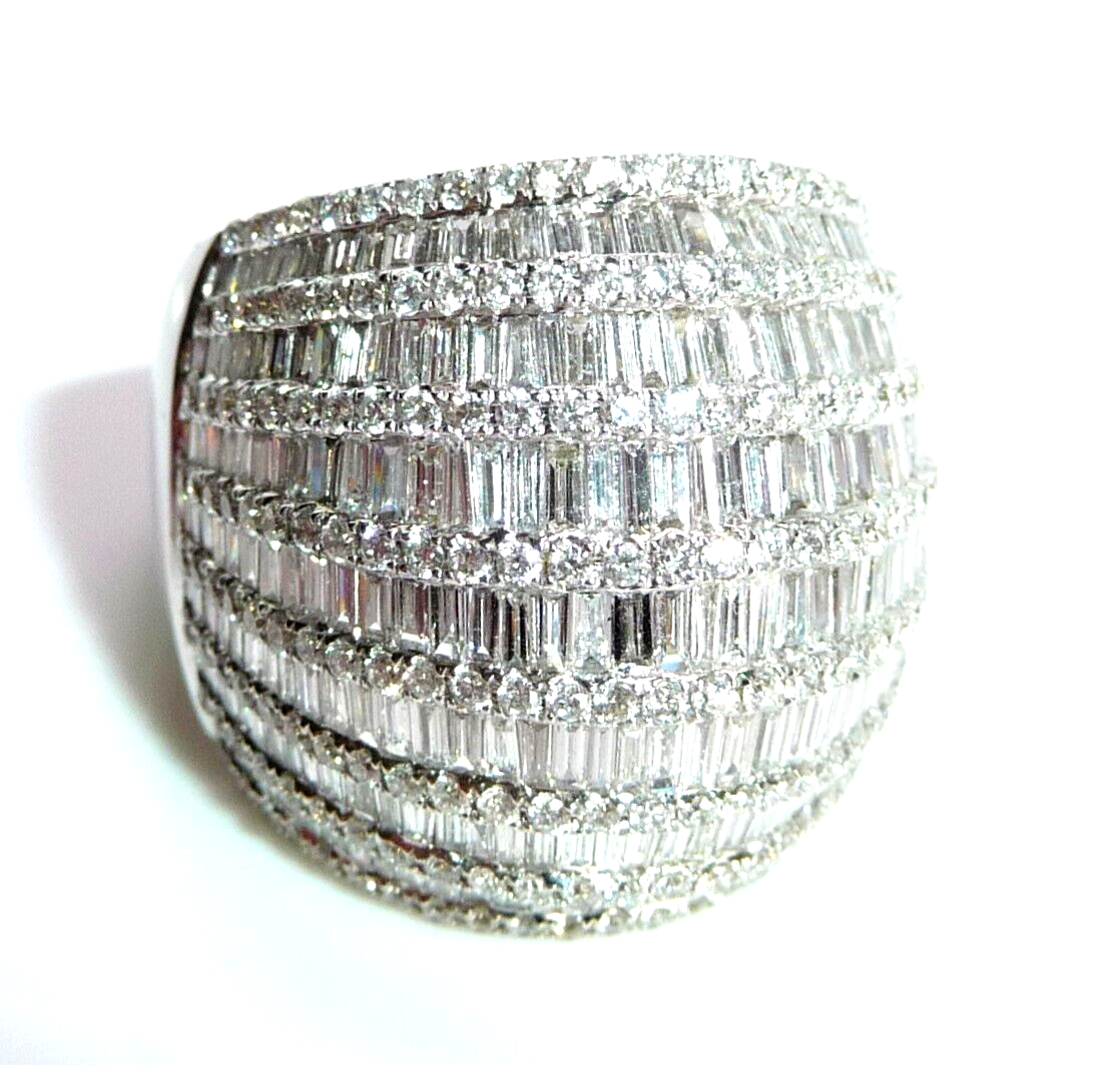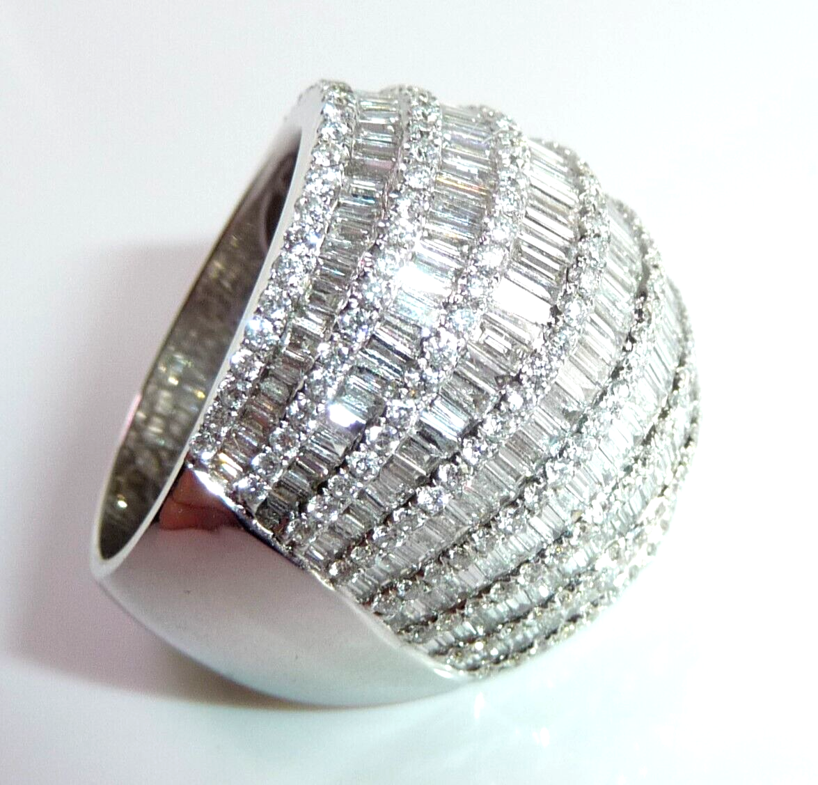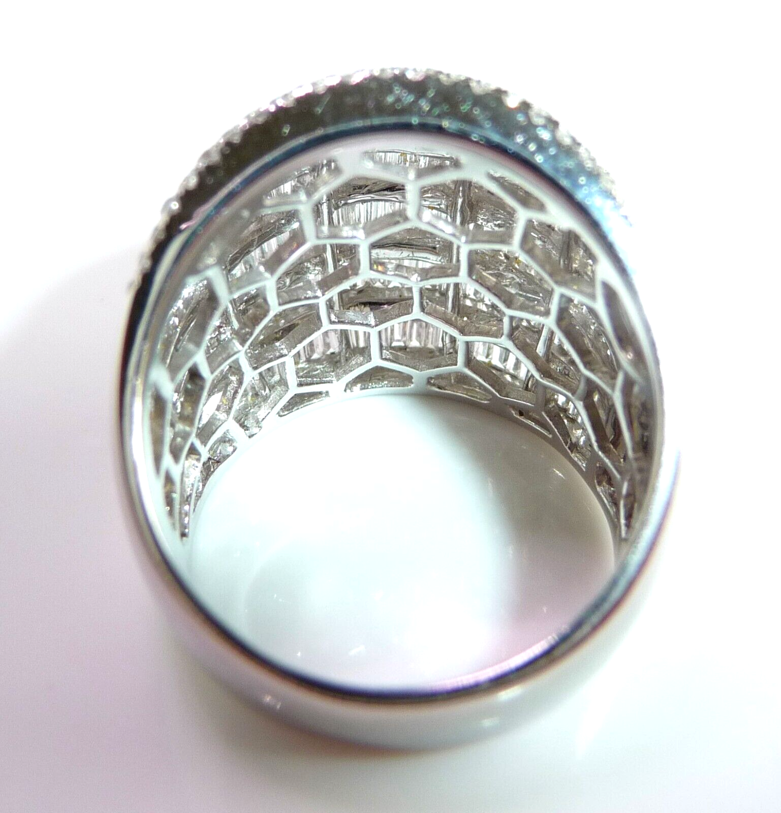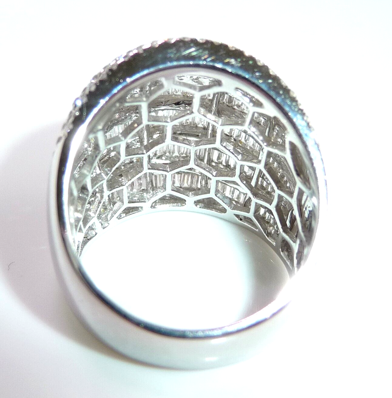Hochwertiger Cocktail-Ring in 18 K / 750 Weißgold. Der sehr breite und opulente Bandring ist mit ungefähr 466-470 Diamanten von total mindestens 6.00 ct. bestückt. Davon sind etwa 260 Diamanten im Baguette-Schliff in 7 parallelen Reihen dicht an dicht in Kanal-Fassungen (invisible setting) eingefasst. Da sich der Ring zur Mitte hin wölbt, werden die 260 Baguette-Diamanten zur Mitte hin etwas größer. Wir haben sie dennoch nur mit 5.00 ct. berechnet.